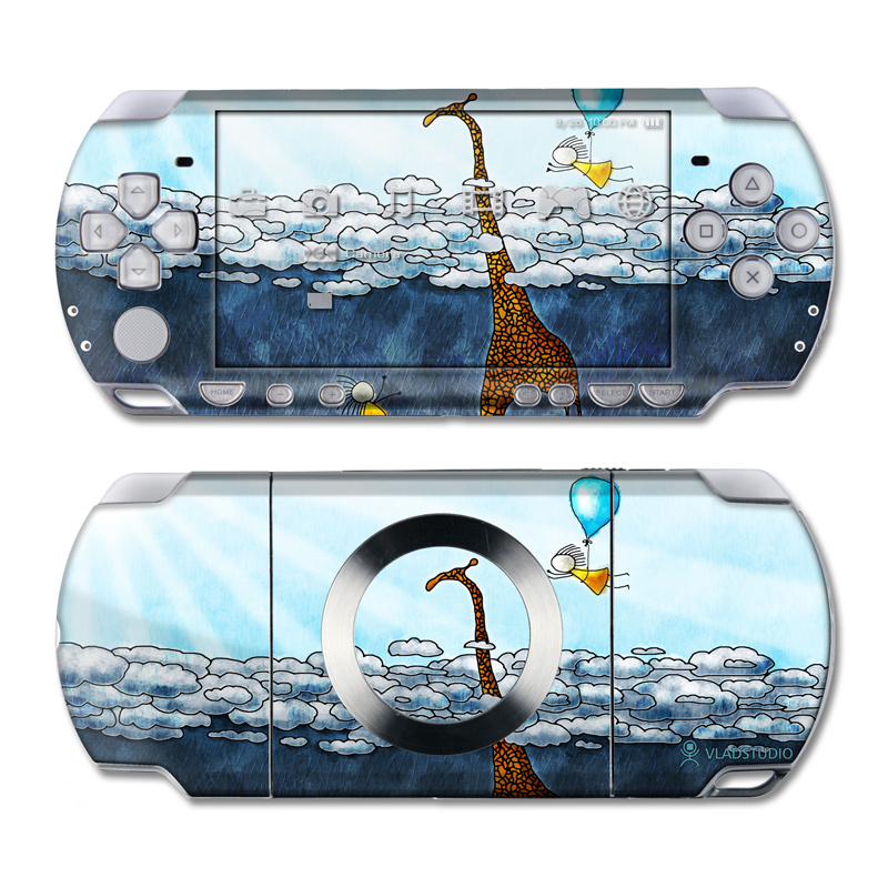 iStyles PSP 2nd Gen Slim & Lite Skin design of Giraffe, Sky, Tree, Water, Branch, Giraffidae, Illustration, Cloud, Grassland, Bird, with blue, gray, yellow, green colors, and tagged with animals, nature, objects.