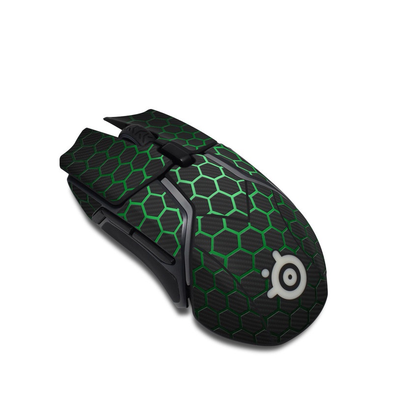 iStyles SteelSeries Rival 600 Gaming Mouse Skin design of Pattern, Metal, Design, Carbon, Space, Circle, with black, gray, green colors, and tagged with lookslike, space, fantasy, drones, geometric, hexagon, tech.