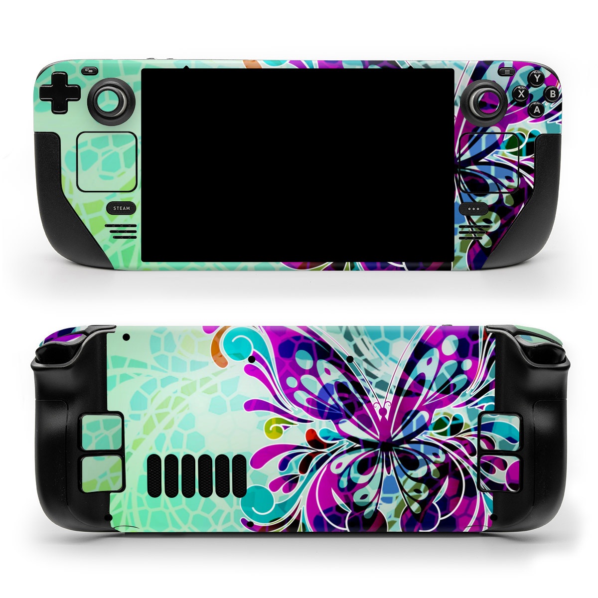 iStyles Valve Steam Deck Skin design of Butterfly, Pattern, Insect, Moths and butterflies, Purple, Graphic design, Design, Pollinator, Visual arts, Magenta, with blue, green, purple colors, and tagged with patterns, animals.