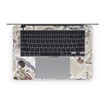 The MacBook inner Skins are precision cut to cover the area around the keyboard - the complexity and large size of this surface does make Skin alignment a little more tricky but the final effect when it's done properly is well worth the effort. What we generally do during Skin application is to first align the Skin to the major physical cutouts, and in this case, that will be the trackpad area. Peel the whole inner Skin off and start with the bottom half; hold the Skin at both ends of the wrist rest area and gently position until it aligns perfectly to the trackpad. One trick will be to keep the top half (the thin stripes that go beside the keyboard) folded back over the bottom half such that the stripes do not get stuck on your MacBook when you're positioning the bottom half. Once you've aligned the trackpad, everything else will fall in place with a little guidance.