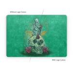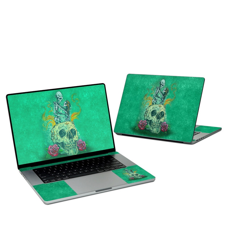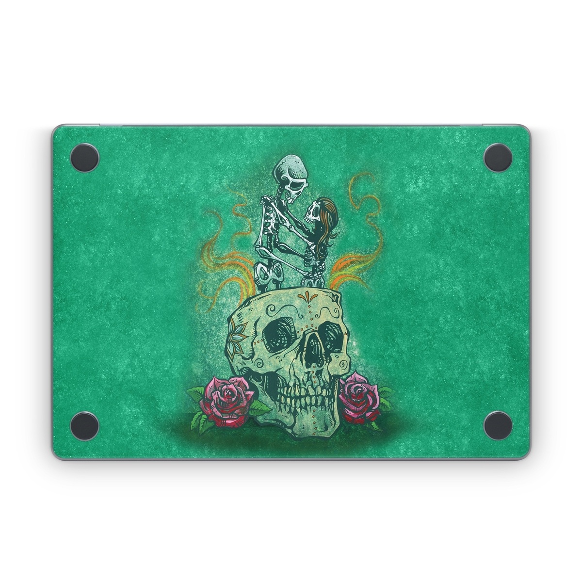 iStyles Apple MacBook Skin design of Bone, Skull, Aqua, Pattern, Electric blue, Fashion accessory, Font, Fictional character, Art, Grass, with green, pink, red, yellow, orange, white, gray colors, and tagged with skulls, flowers, flames, couple, eternal, love, flames, roses.