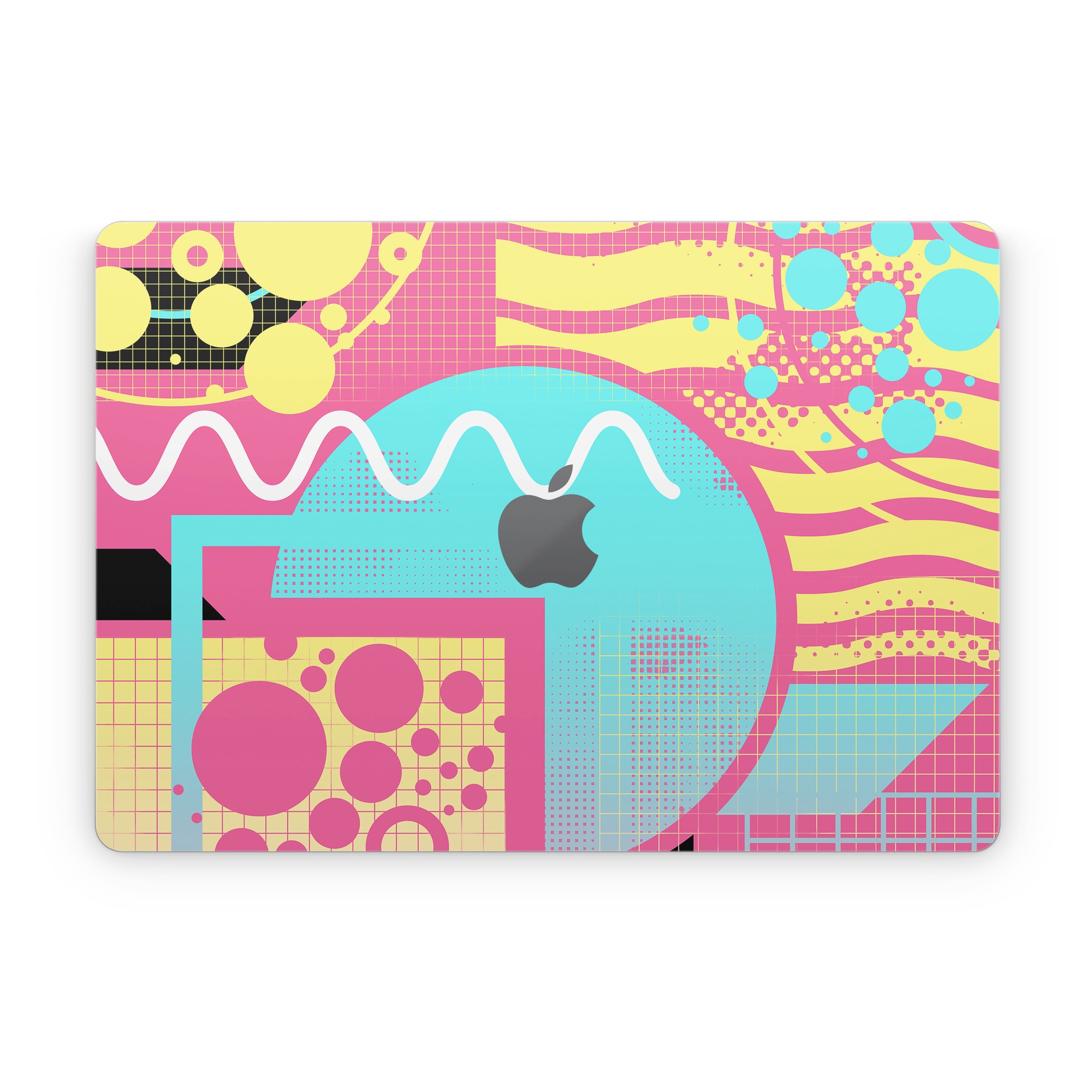 iStyles Apple MacBook Skin design of Textile, Organism, Font, Art, Pink, Rectangle, Line, Aqua, Magenta, Circle, with pink, yellow, blue, black, white colors, and tagged with abstract, abstract, waves, circle, square, lines.