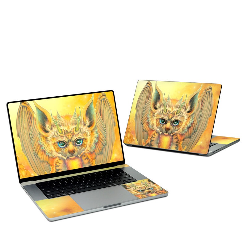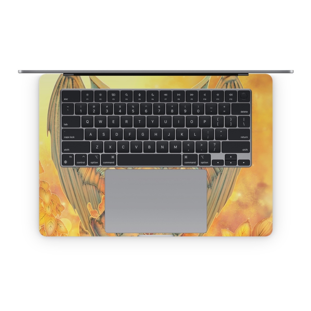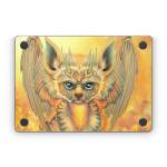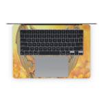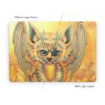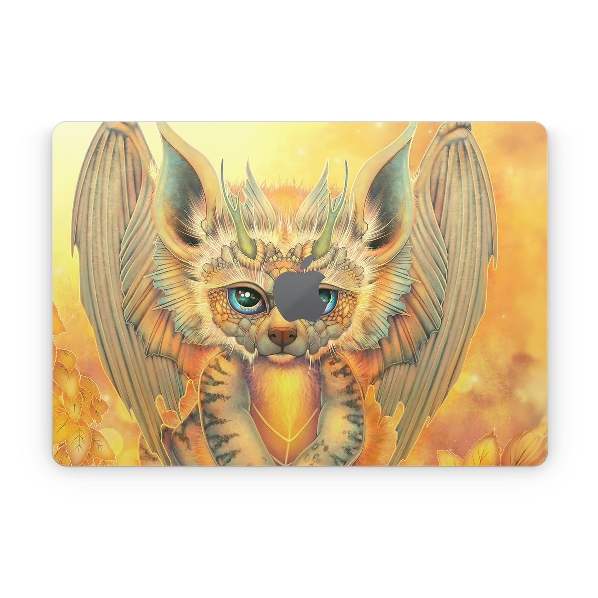 iStyles Apple MacBook Skin design of Nature, Mammal, Art, Fawn, Owl, Illustration, Tail, Fictional character, Visual arts, Terrestrial animal, with yellow, orange, green, white, black colors, and tagged with fantasy, animals, nature, tiger, stripes, wings, horns, yellow, leaves.