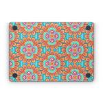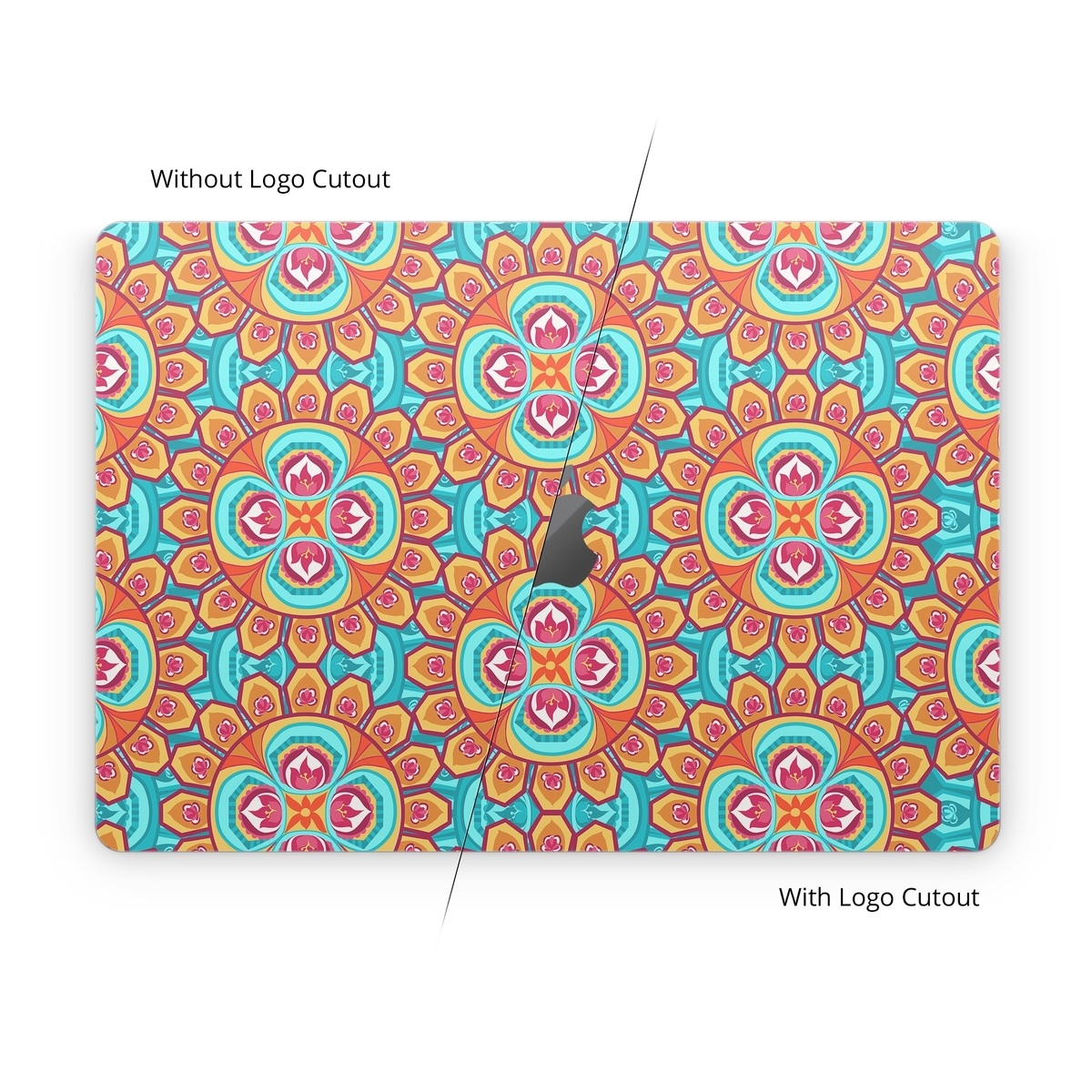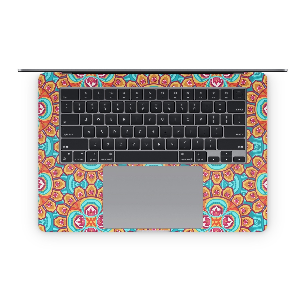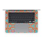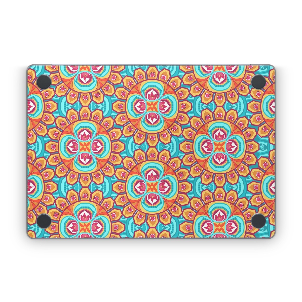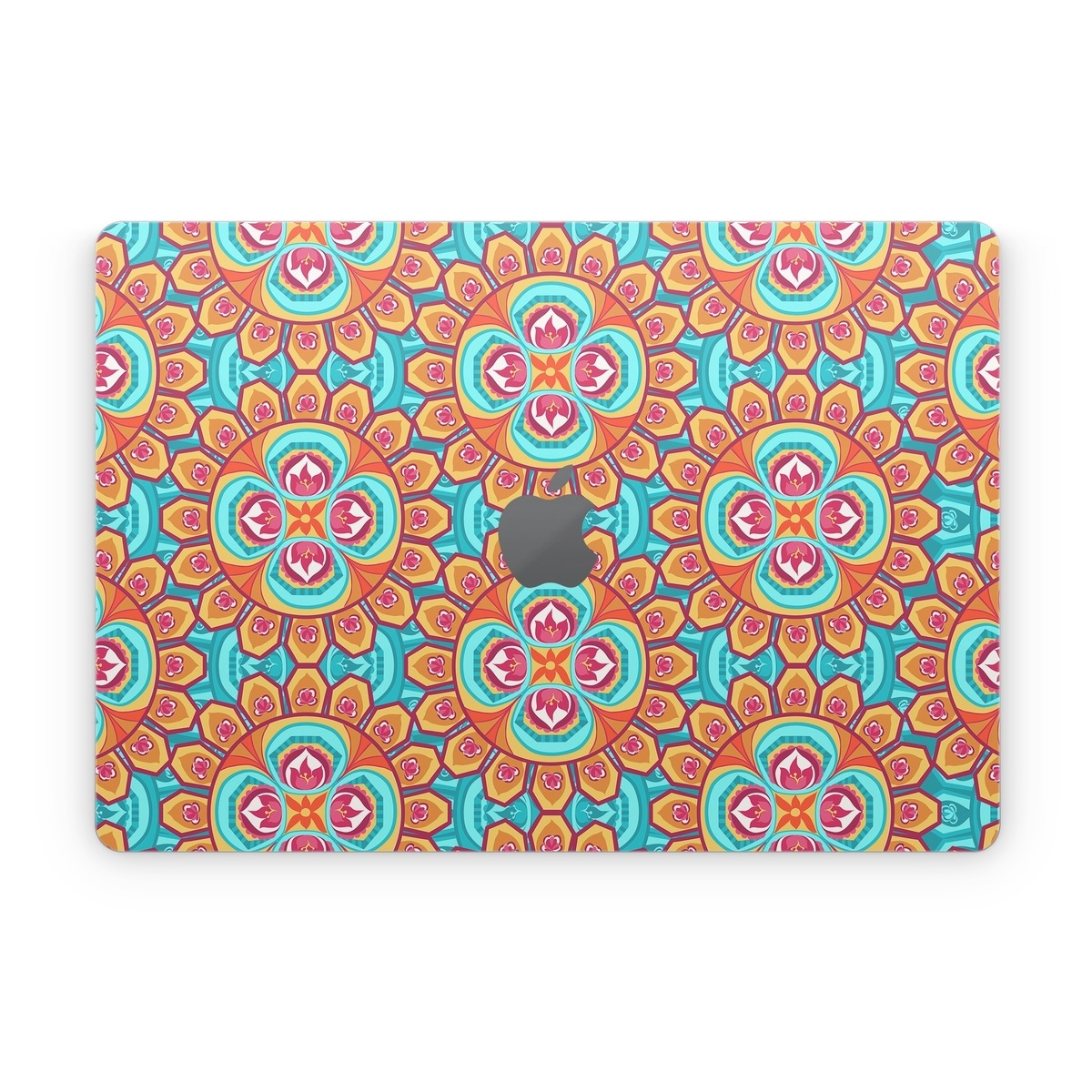 iStyles Apple MacBook Skin design of Pattern, Orange, Design, Textile, Wrapping paper, Visual arts, Motif, Circle, Art, with blue, orange, red, yellow colors, and tagged with patterns, flowers.