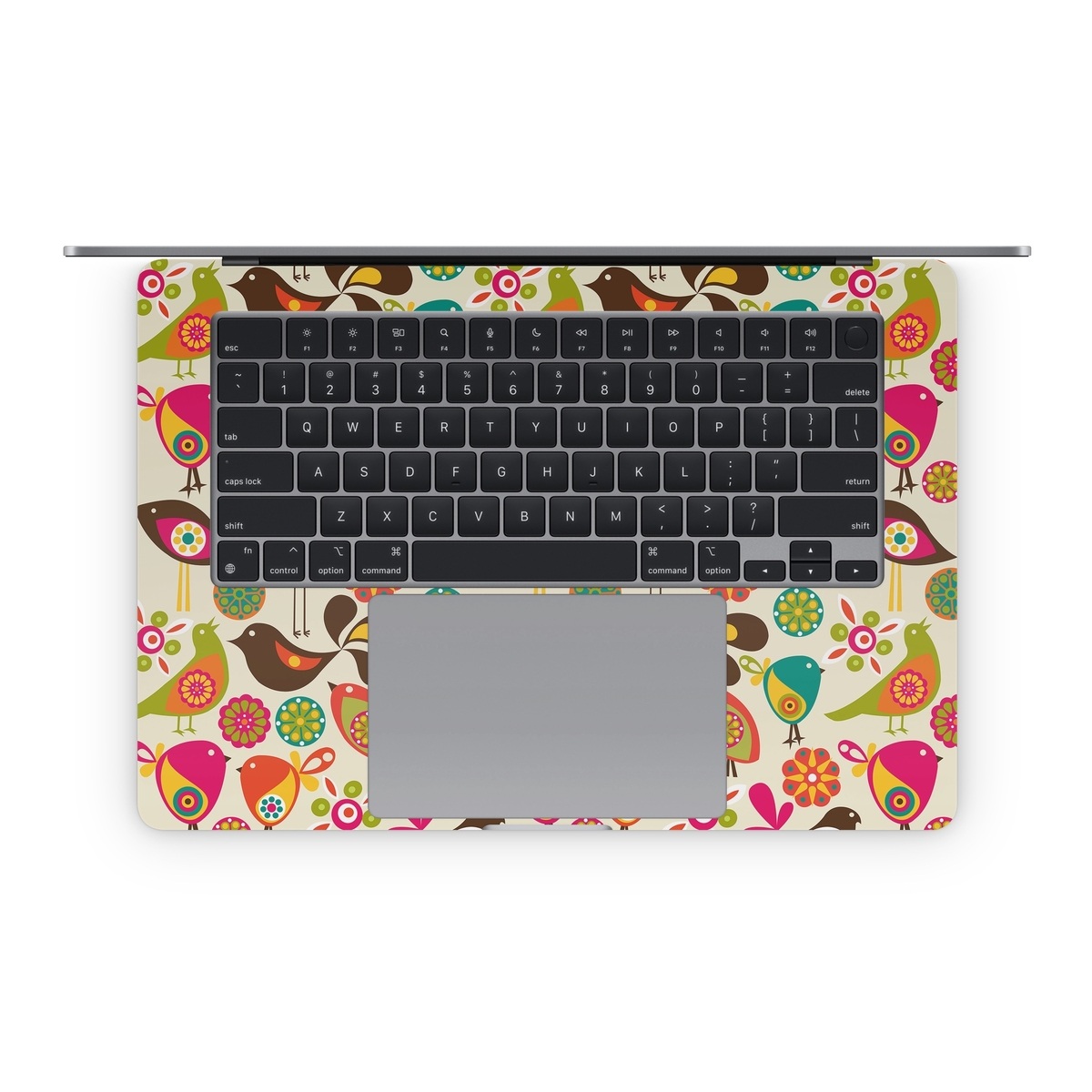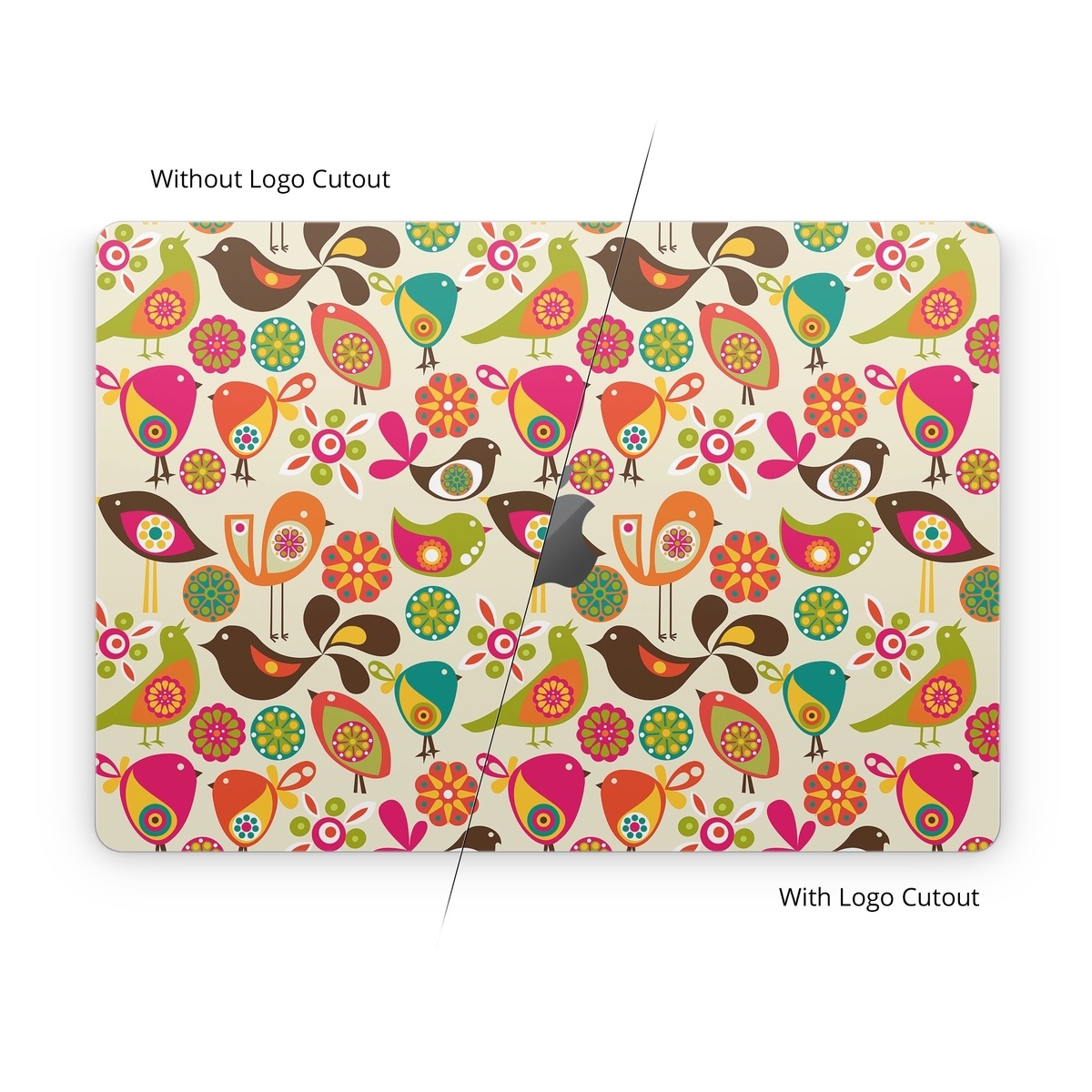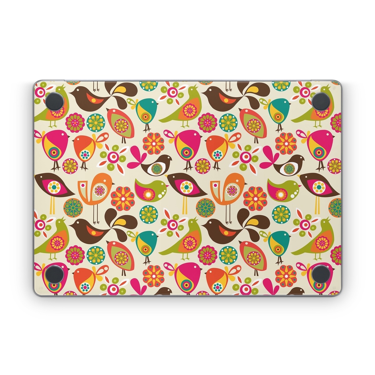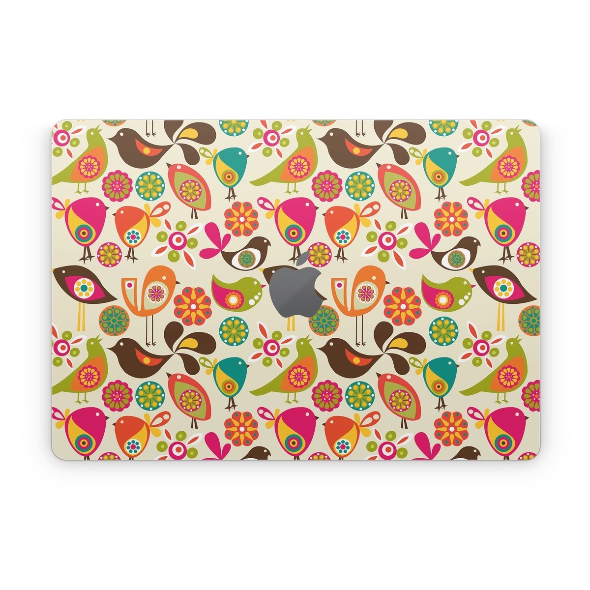 iStyles Apple MacBook Skin design of Pattern, Visual arts, Wrapping paper, Design, Clip art, Textile, Motif, Sticker, Graphics, with yellow, pink, orange, green, brown, blue colors, and tagged with patterns, animals, flowers.