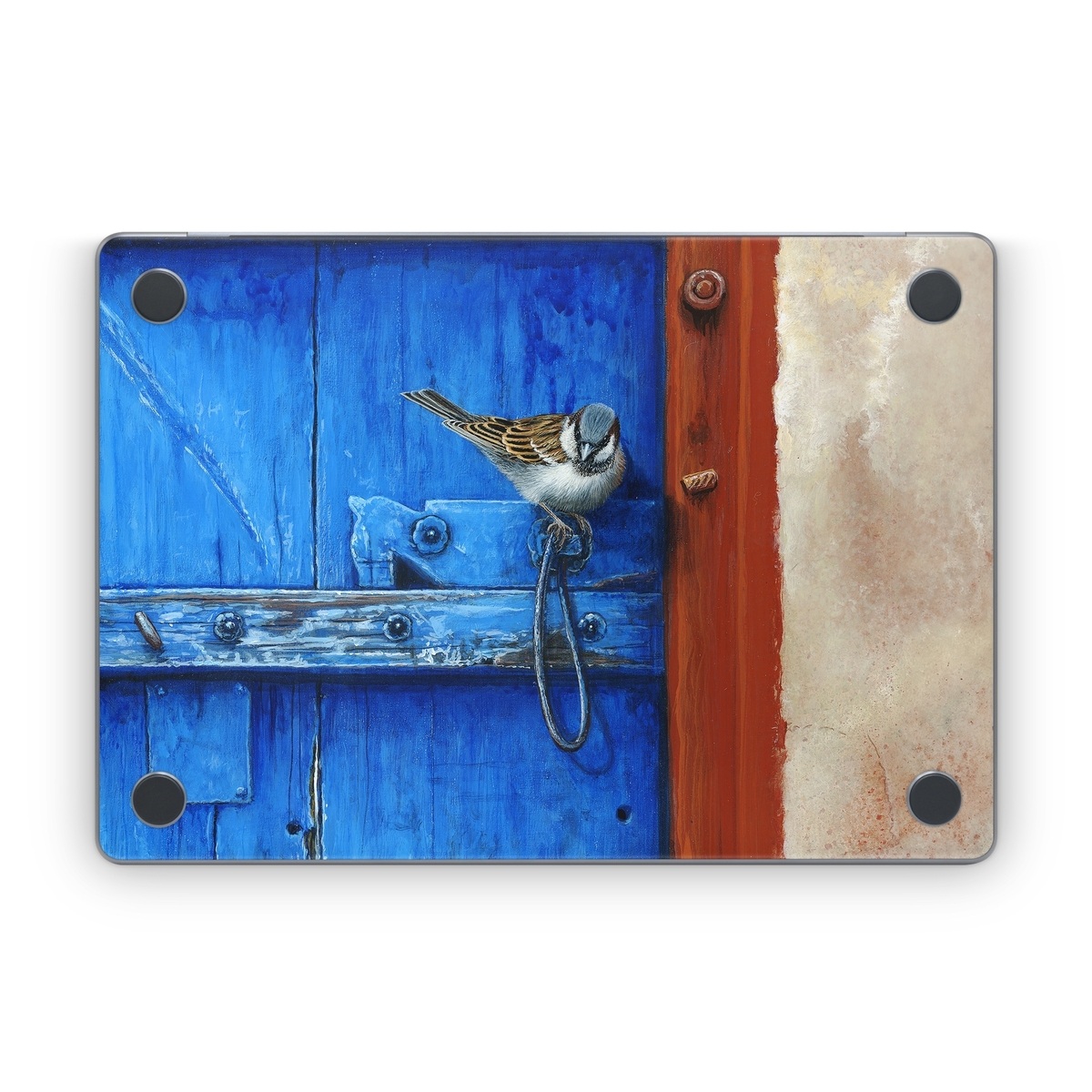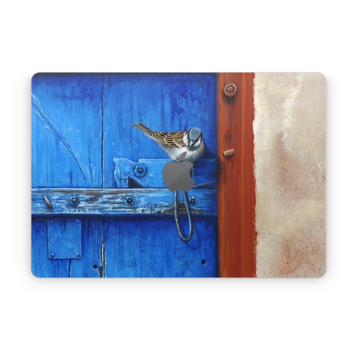 iStyles Apple MacBook Skin design of Blue, Wood, Door handle, Door, Wall, Door knocker, Electric blue, Still life photography, Window, Handle, with red, blue, brown colors, and tagged with animals, fineart, animal, bird, birds, fineart, outdoors.