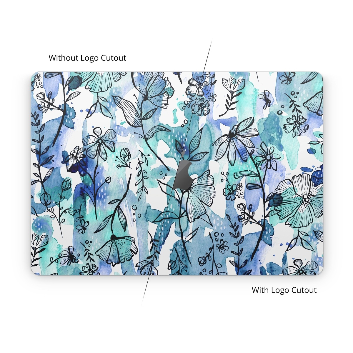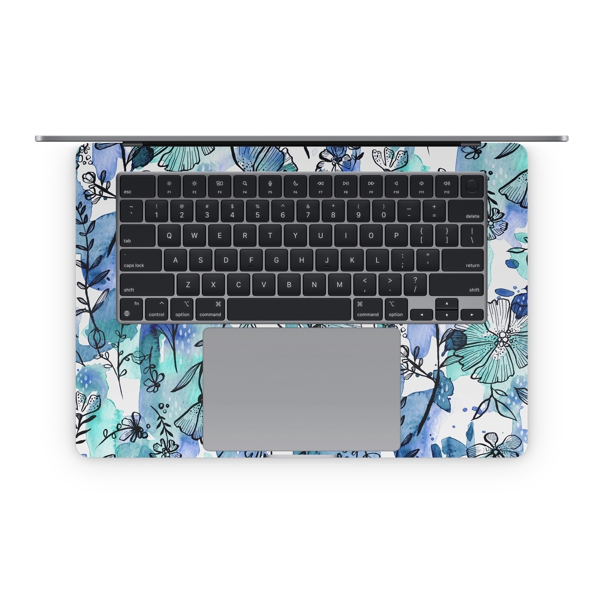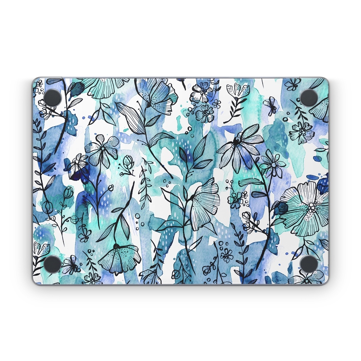 iStyles Apple MacBook Skin design of Blue, Pattern, Turquoise, Aqua, Design, Textile, Wildflower, Plant, Wrapping paper, Gift wrapping, with blue, white, black, purple colors, and tagged with patterns, flowers, blue, floral, flowers, ink, penandink, teal, watercolor.