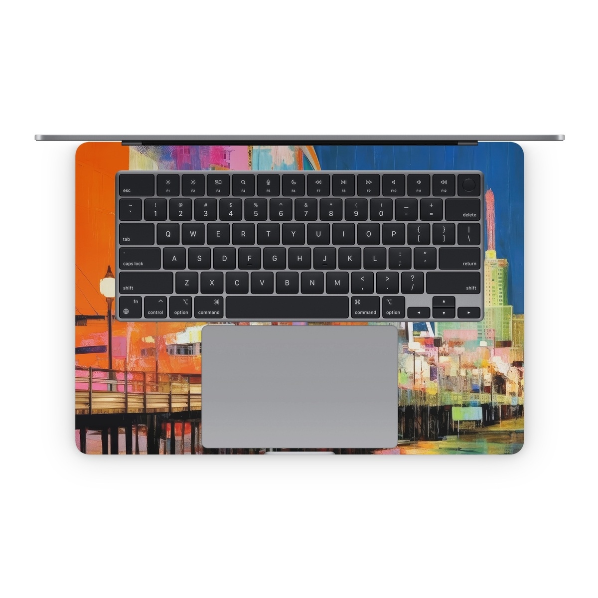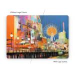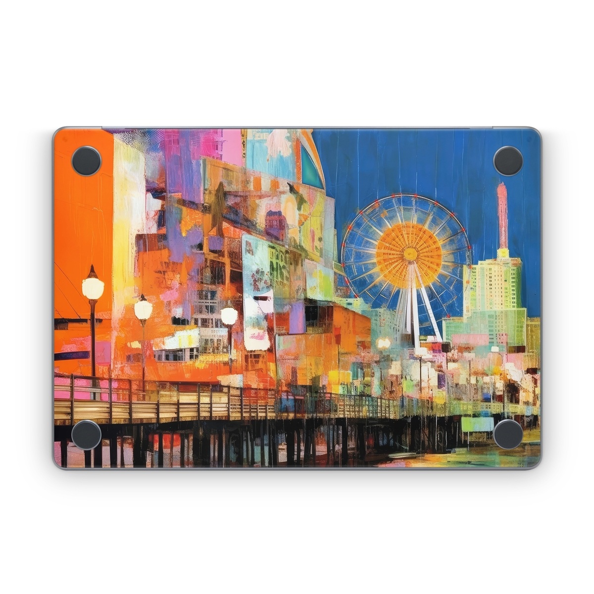 iStyles Apple MacBook Skin design of Light, World, Window, Tints and shades, City, Art, Leisure, Event, Building, Ferris wheel, with black, white, blue, pink, red, orange, yellow, green colors, and tagged with fineart, urban, objects, seaside, ferry, wheel, buildings, stores, reflection.