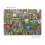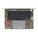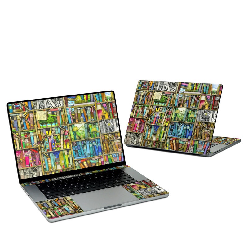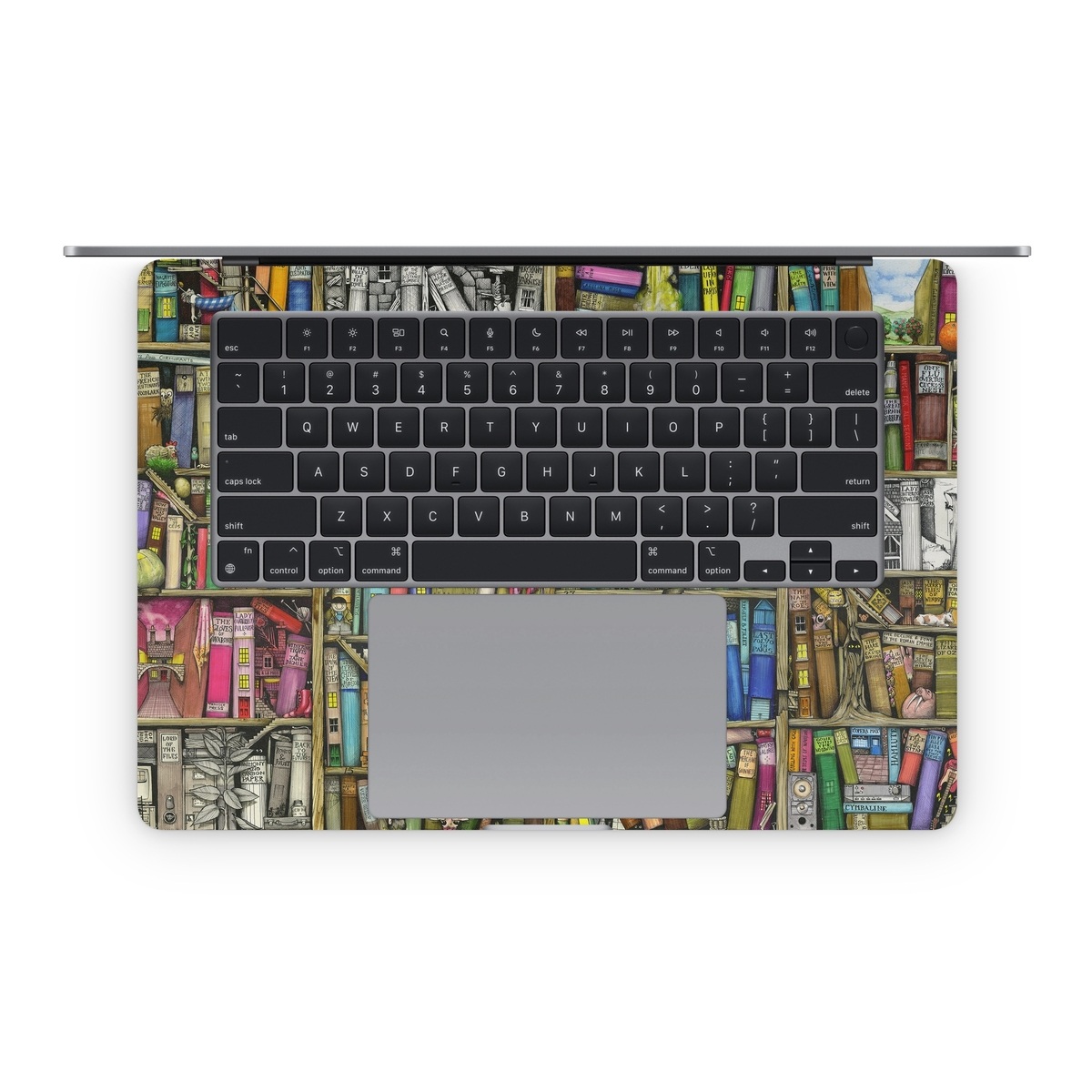 iStyles Apple MacBook Skin design of Collection, Art, Visual arts, Bookselling, Shelving, Painting, Building, Shelf, Publication, Modern art, with brown, green, blue, red, pink colors, and tagged with patterns, objects, animals.