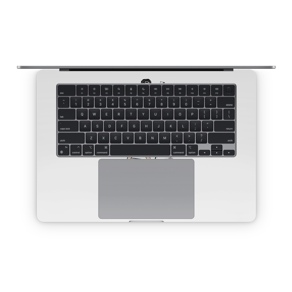 The MacBook inner Skins are precision cut to cover the area around the keyboard - the complexity and large size of this surface does make Skin alignment a little more tricky but the final effect when it's done properly is well worth the effort. What we generally do during Skin application is to first align the Skin to the major physical cutouts, and in this case, that will be the trackpad area. Peel the whole inner Skin off and start with the bottom half; hold the Skin at both ends of the wrist rest area and gently position until it aligns perfectly to the trackpad. One trick will be to keep the top half (the thin stripes that go beside the keyboard) folded back over the bottom half such that the stripes do not get stuck on your MacBook when you're positioning the bottom half. Once you've aligned the trackpad, everything else will fall in place with a little guidance.
