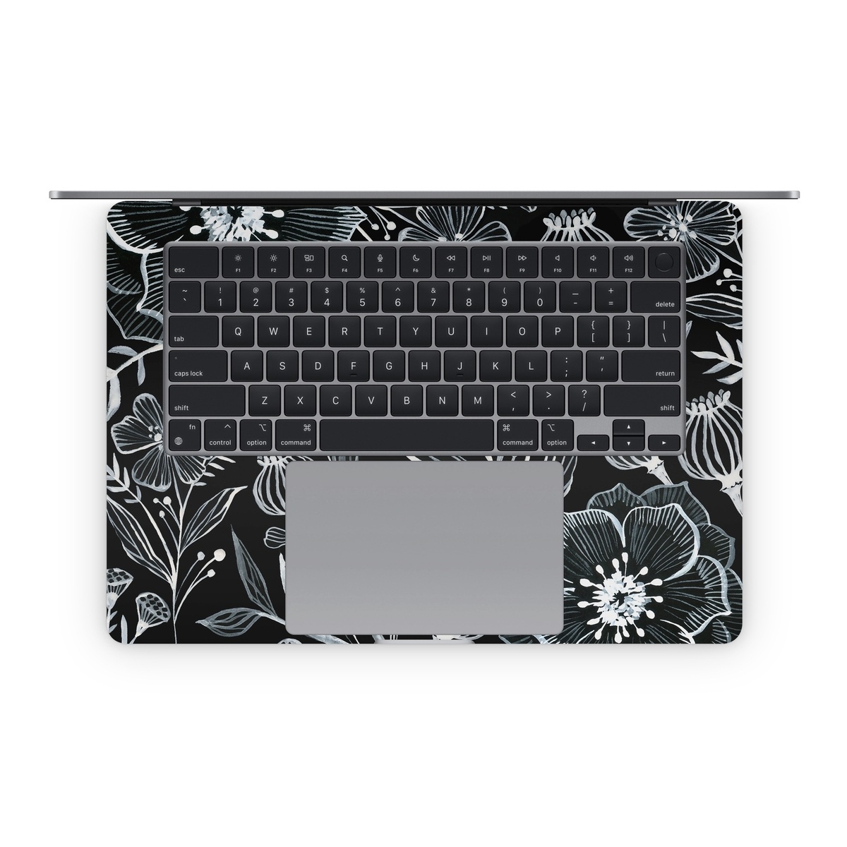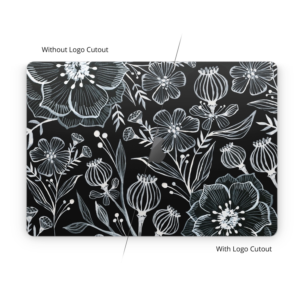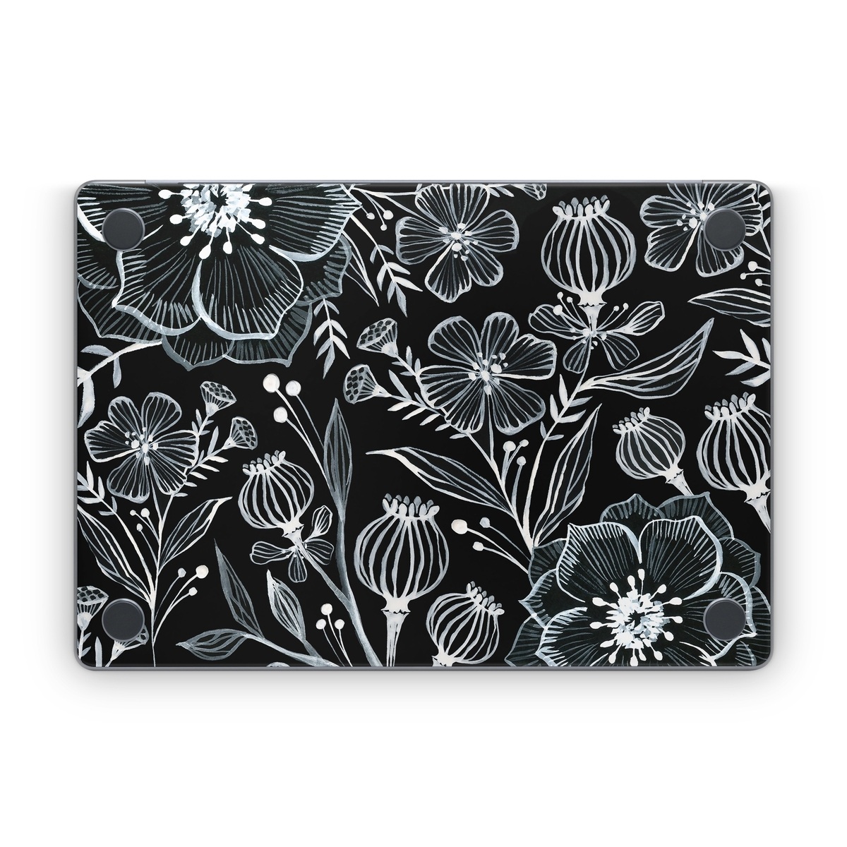 iStyles Apple MacBook Skin design of Pattern, Black-and-white, Flower, Monochrome photography, Plant, Design, Monochrome, Botany, Wildflower, Visual arts, with black, white colors, and tagged with flowers, patterns, blackandwhite, botanical, floral, flowerpattern, flowers.