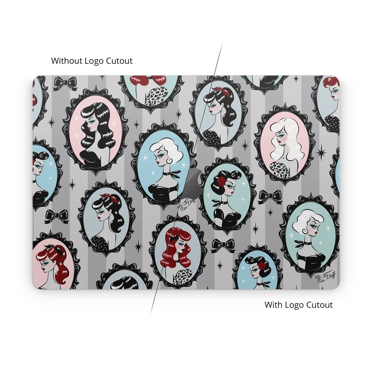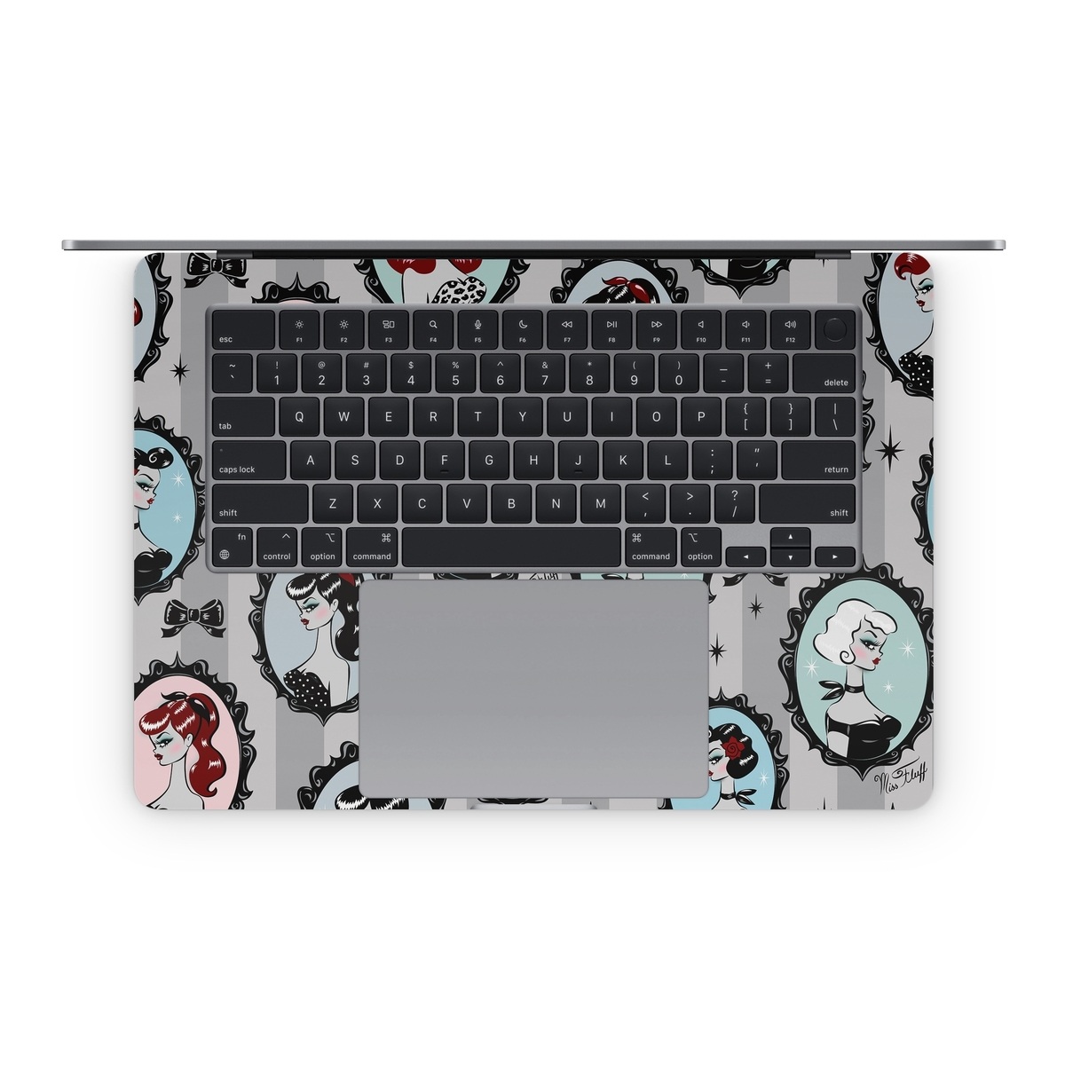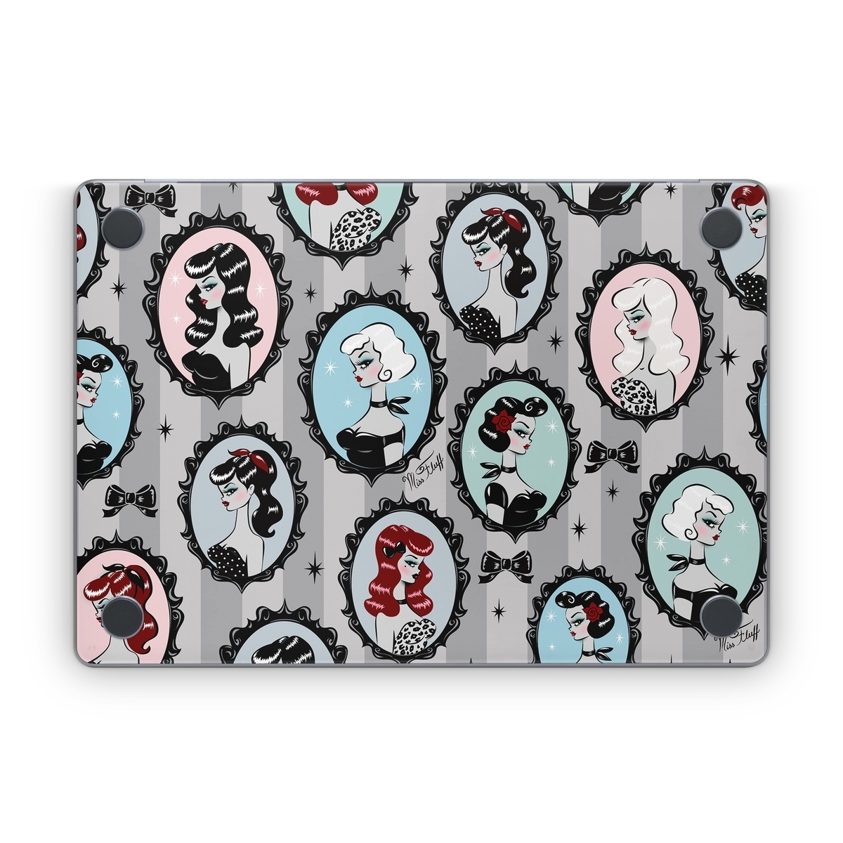 iStyles Apple MacBook Skin design of Pattern, Design, Textile, Visual arts, Circle, Art, with black, blue, gray, yellow, red, pink colors, and tagged with patterns, people, objects, bows, cameo, dolls, pinup.