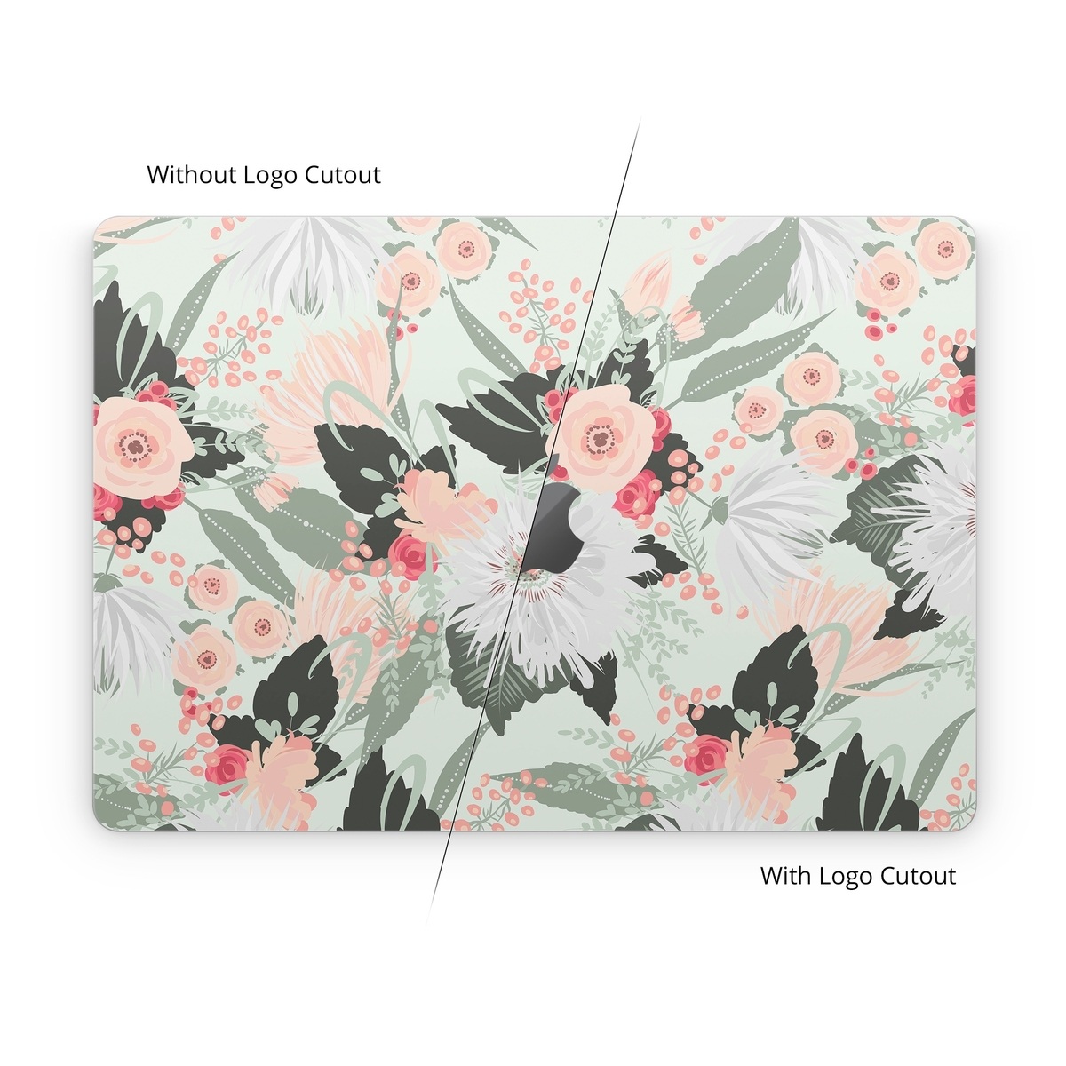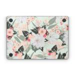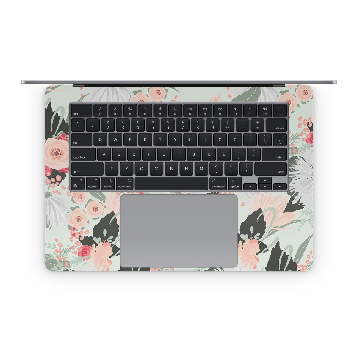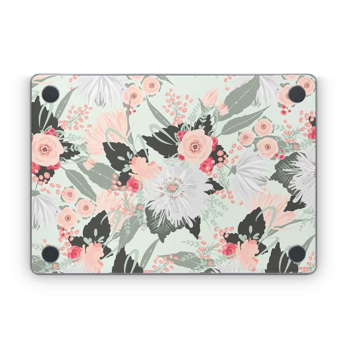 iStyles Apple MacBook Skin design of Pattern, Pink, Floral design, Design, Textile, Wrapping paper, Plant, Peach, Flower, with green, red, white, pink colors, and tagged with patterns, flowers, nature, bouquet, filigree, floral, flower, flowers, leaf, leaves, pastel.