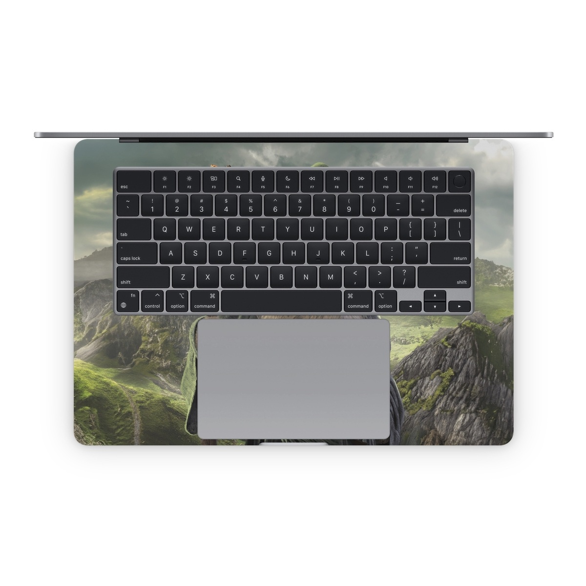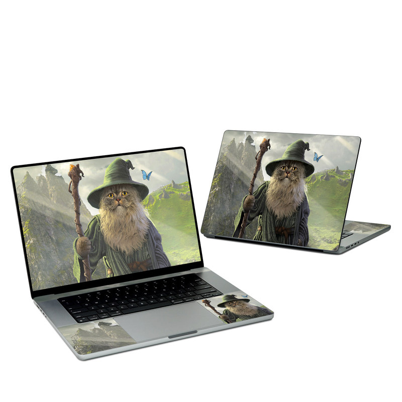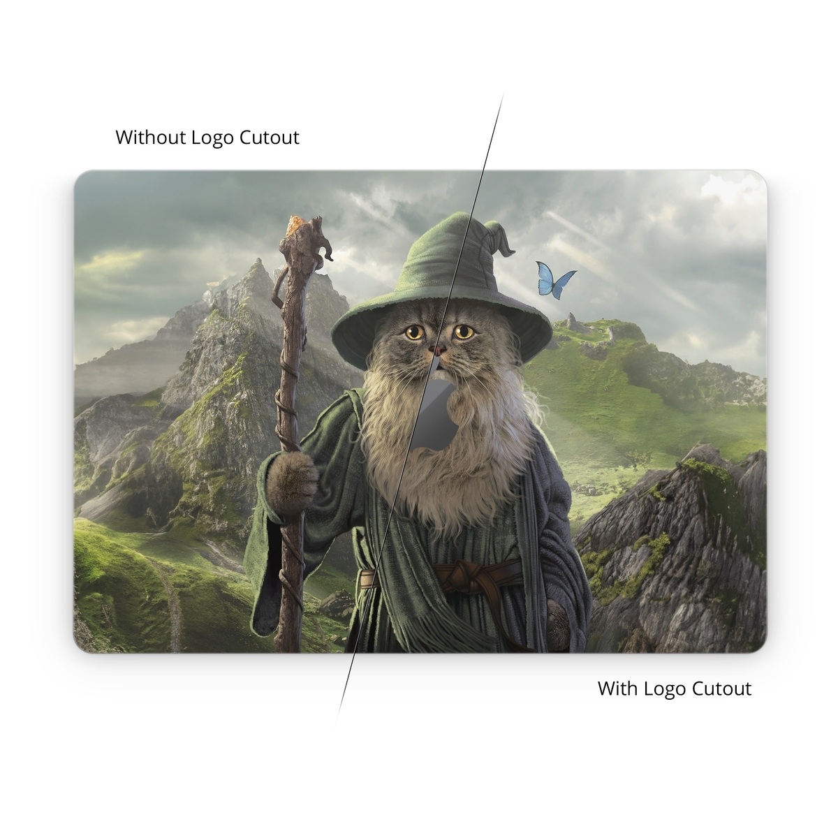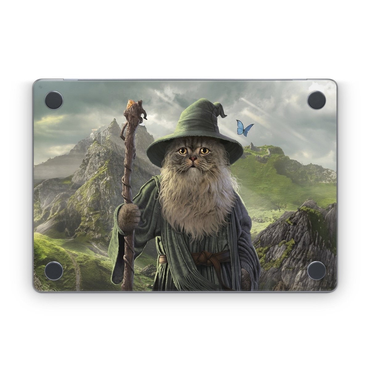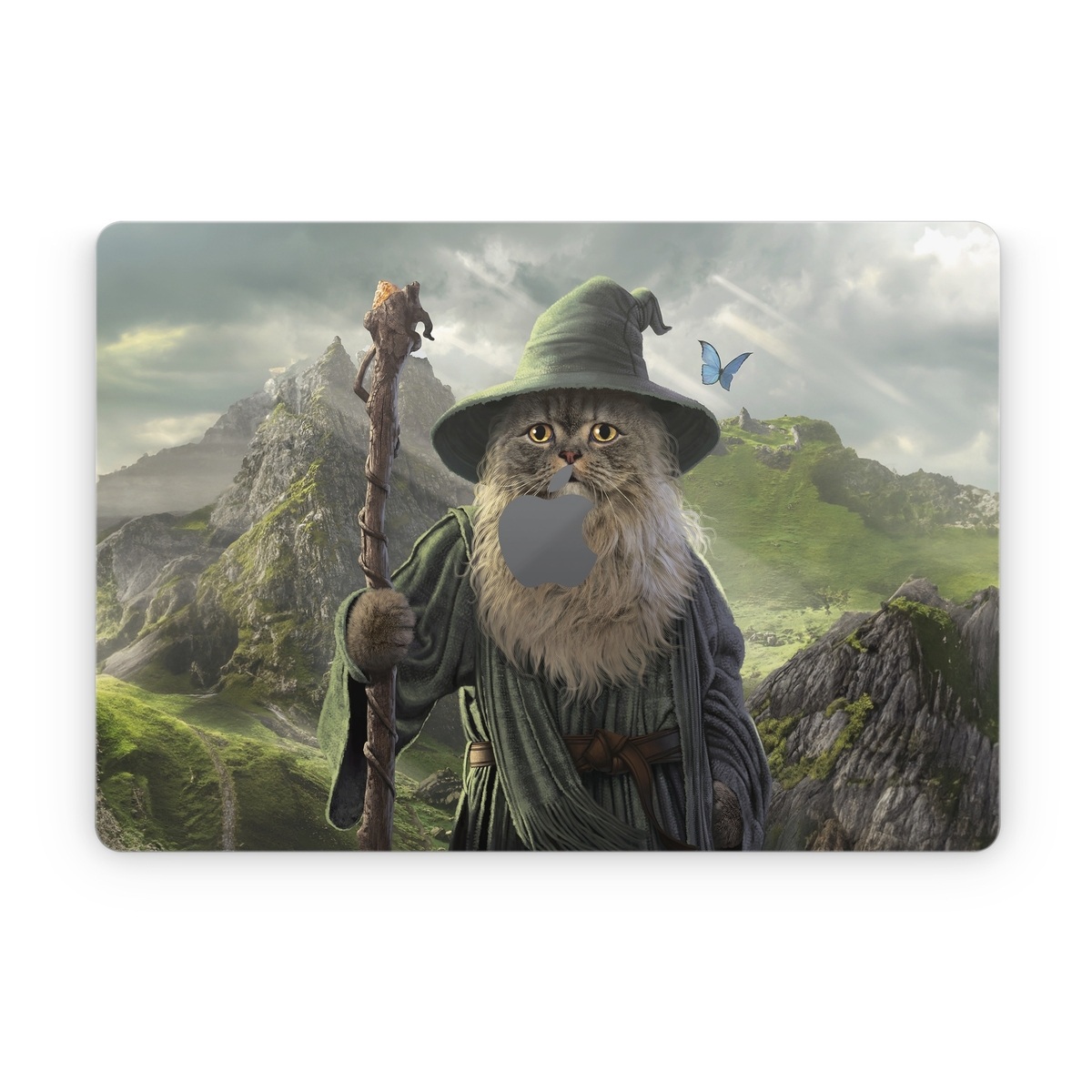 iStyles Apple MacBook Skin design of Beard, Facial hair, Illustration, Mythology, Magician, Fictional character, Cg artwork, Games, Art, with green, gray, brown, blue, green, white, yellow, black colors, and tagged with animals, fantasy, objects, cat, fantasy, middleearth, movie, movies, wizard, hat, staff.