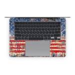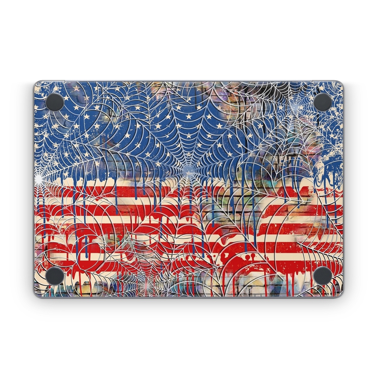 iStyles Apple MacBook Skin design of Graffiti, Art, Pattern, Flag, Street art, Line, Textile, Mural, Modern art, with red, blue, white, black colors, and tagged with patterns, flags, animals, bricks, cobweb, flag, spider, usa, web.
