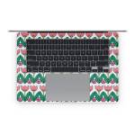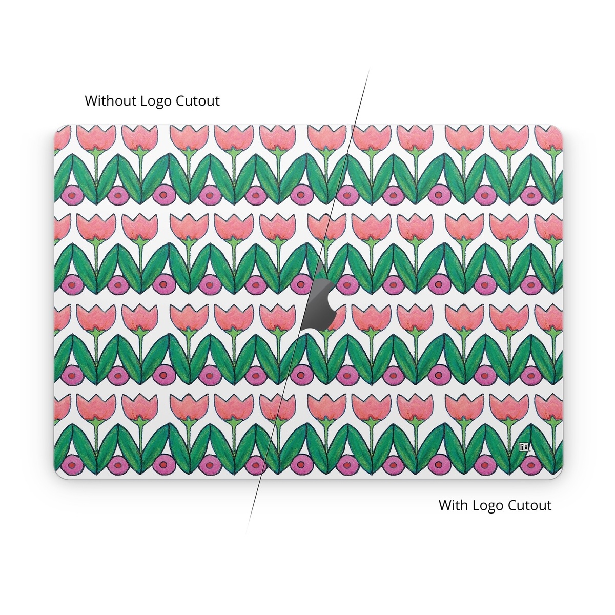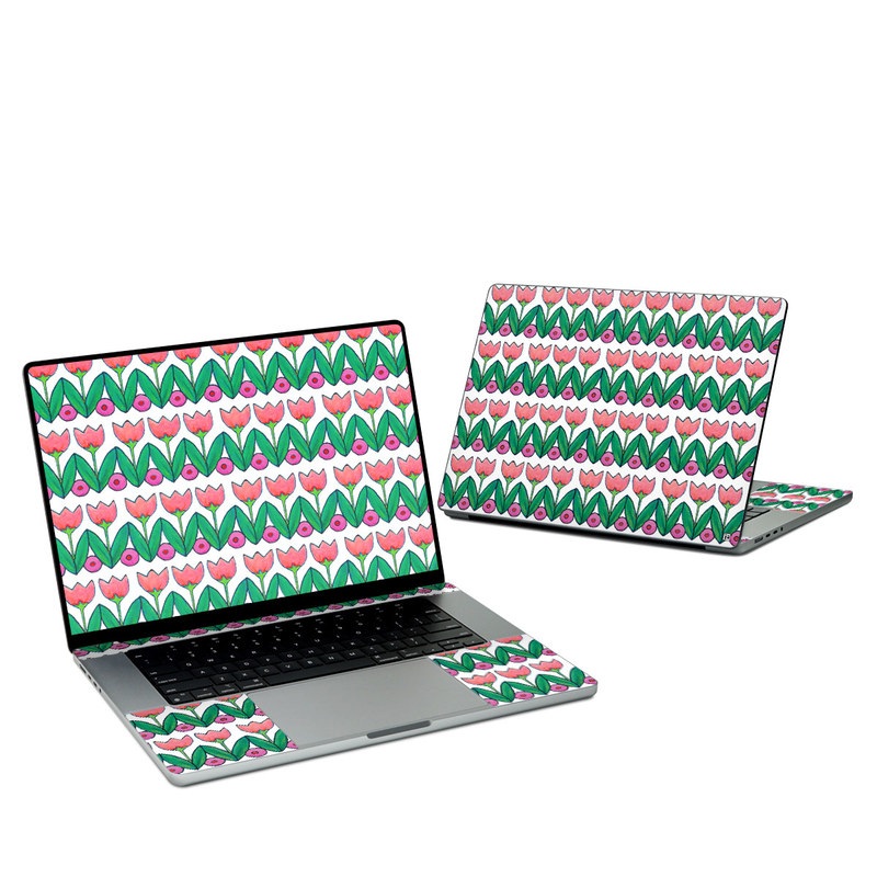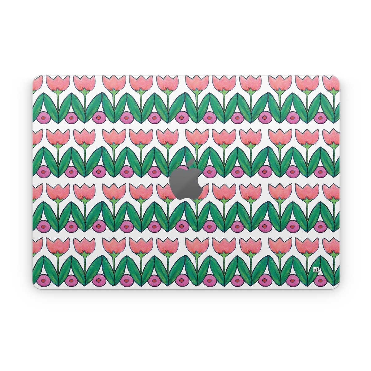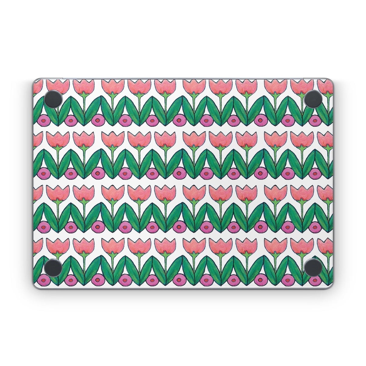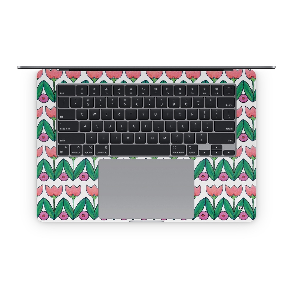 iStyles Apple MacBook Skin design of Green, Rectangle, Textile, Botany, Line, Symmetry, Art, Font, Pattern, Magenta, with white, green, pink, purple colors, and tagged with patterns, flowers, tulip, drawing, repetative.