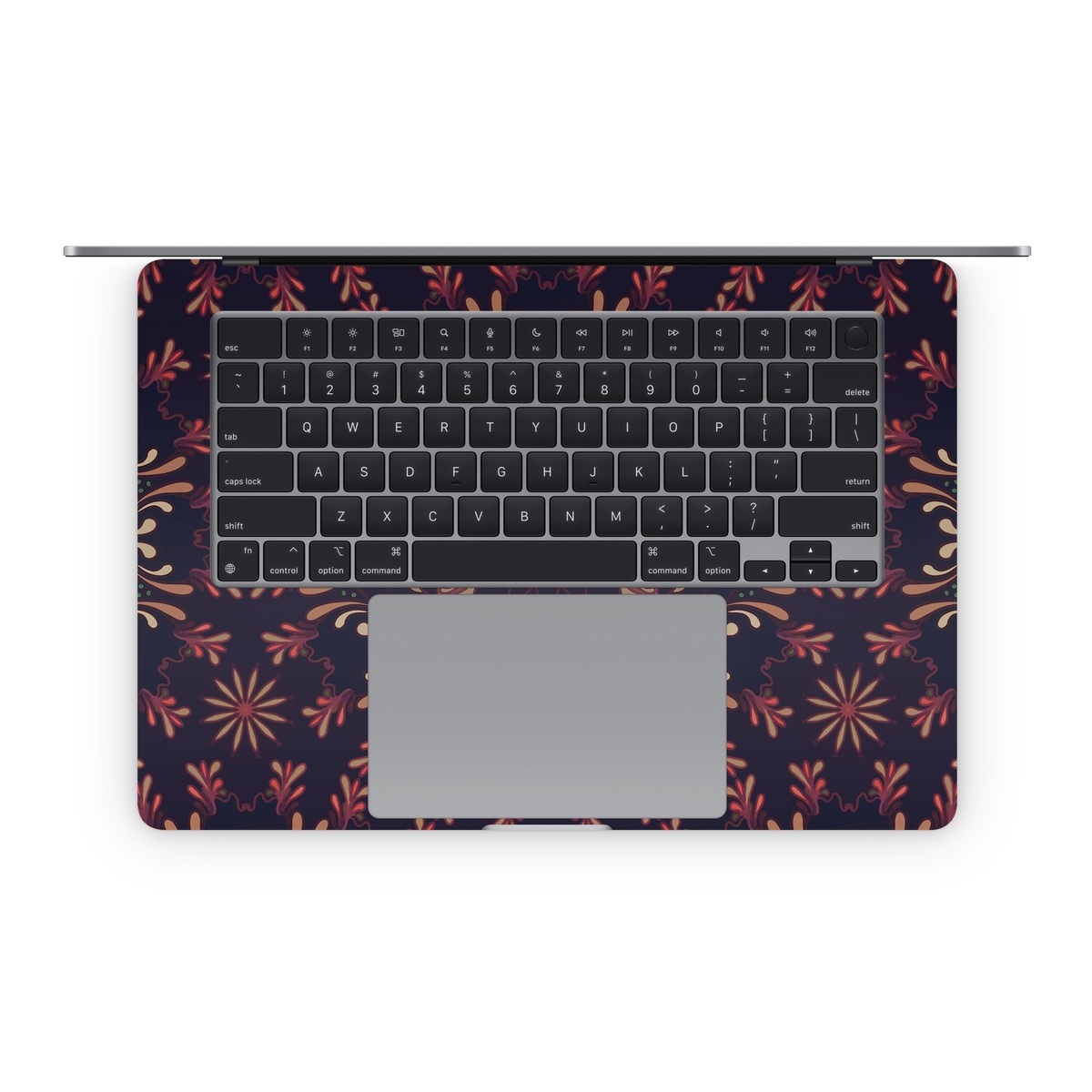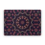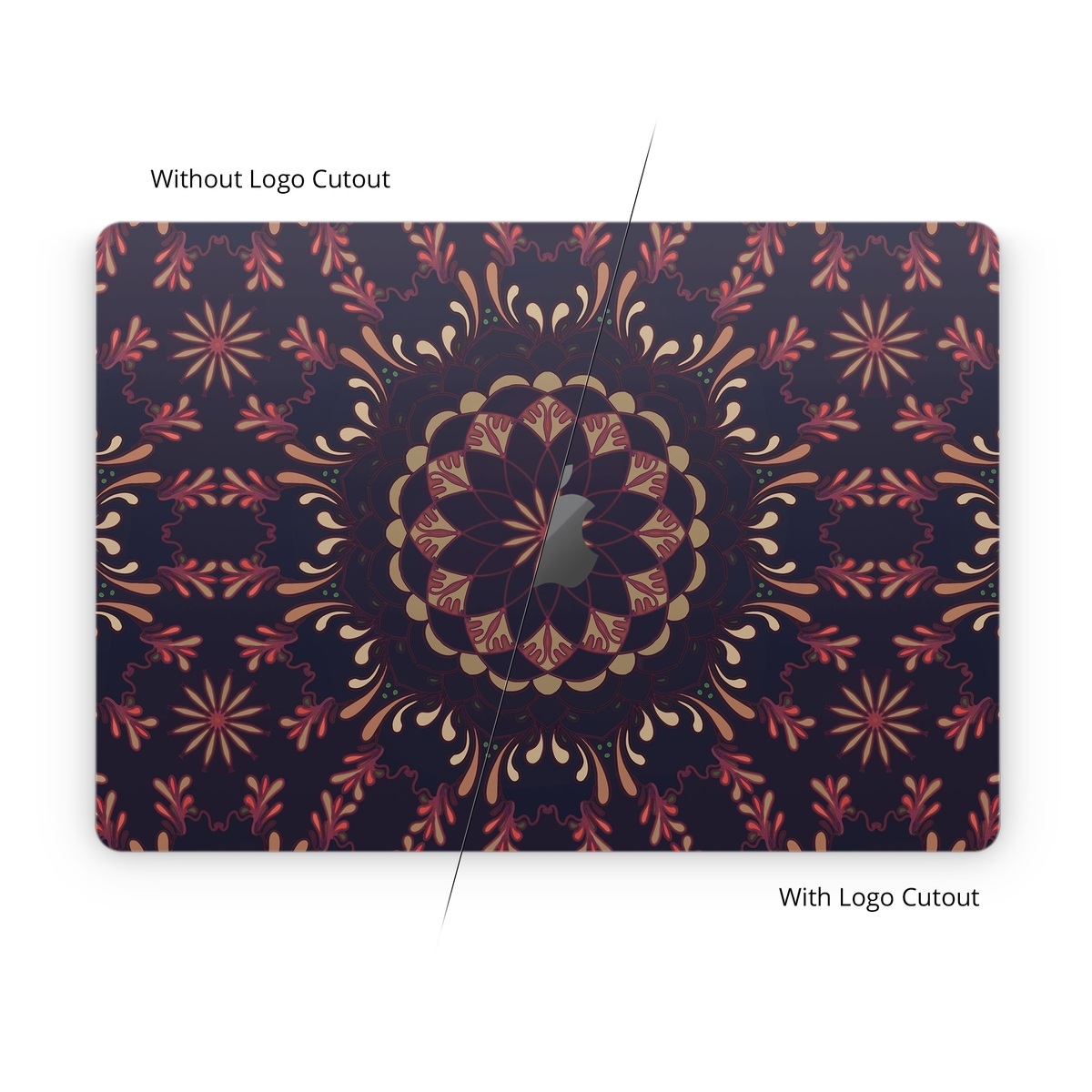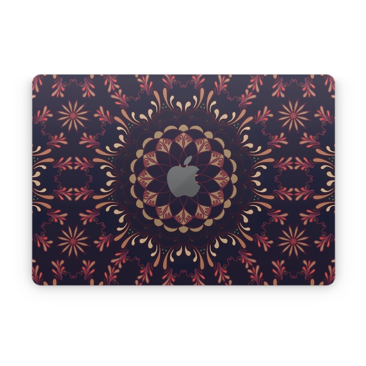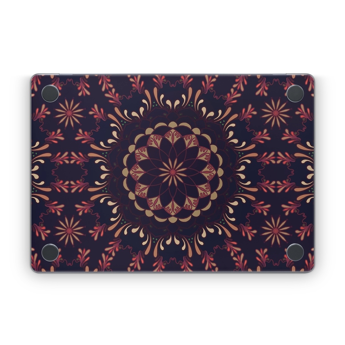 iStyles Apple MacBook Skin design of Pattern, Brown, Red, Symmetry, Textile, Design, Visual arts, Tapestry, Kaleidoscope, with black, red, orange, yellow, brown colors, and tagged with patterns, flowers, boho, filigree, kaleidoscope, mandala.