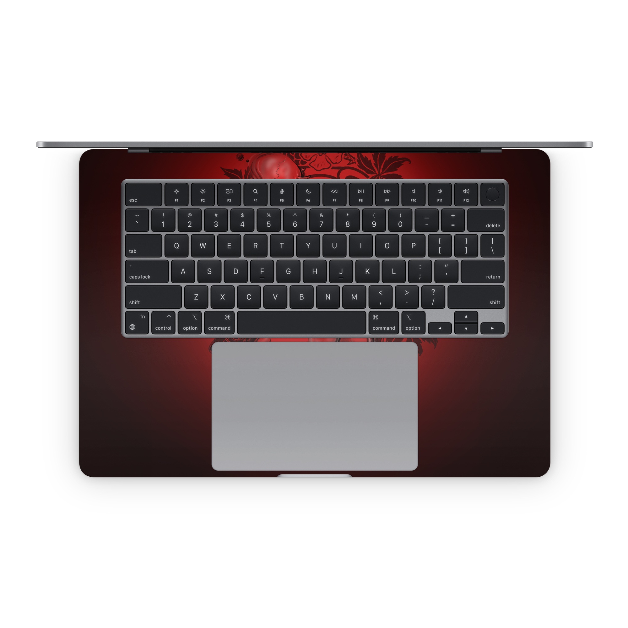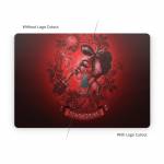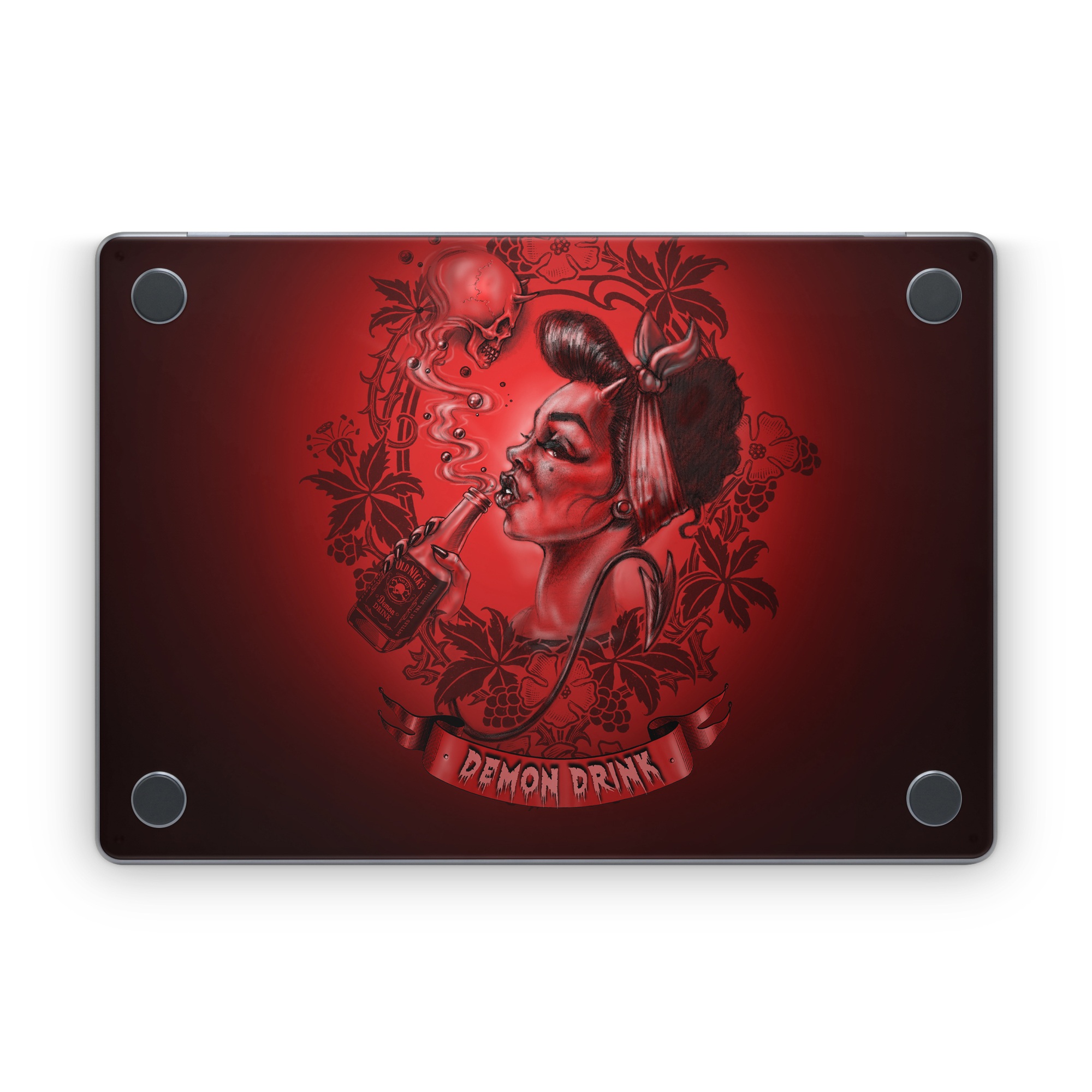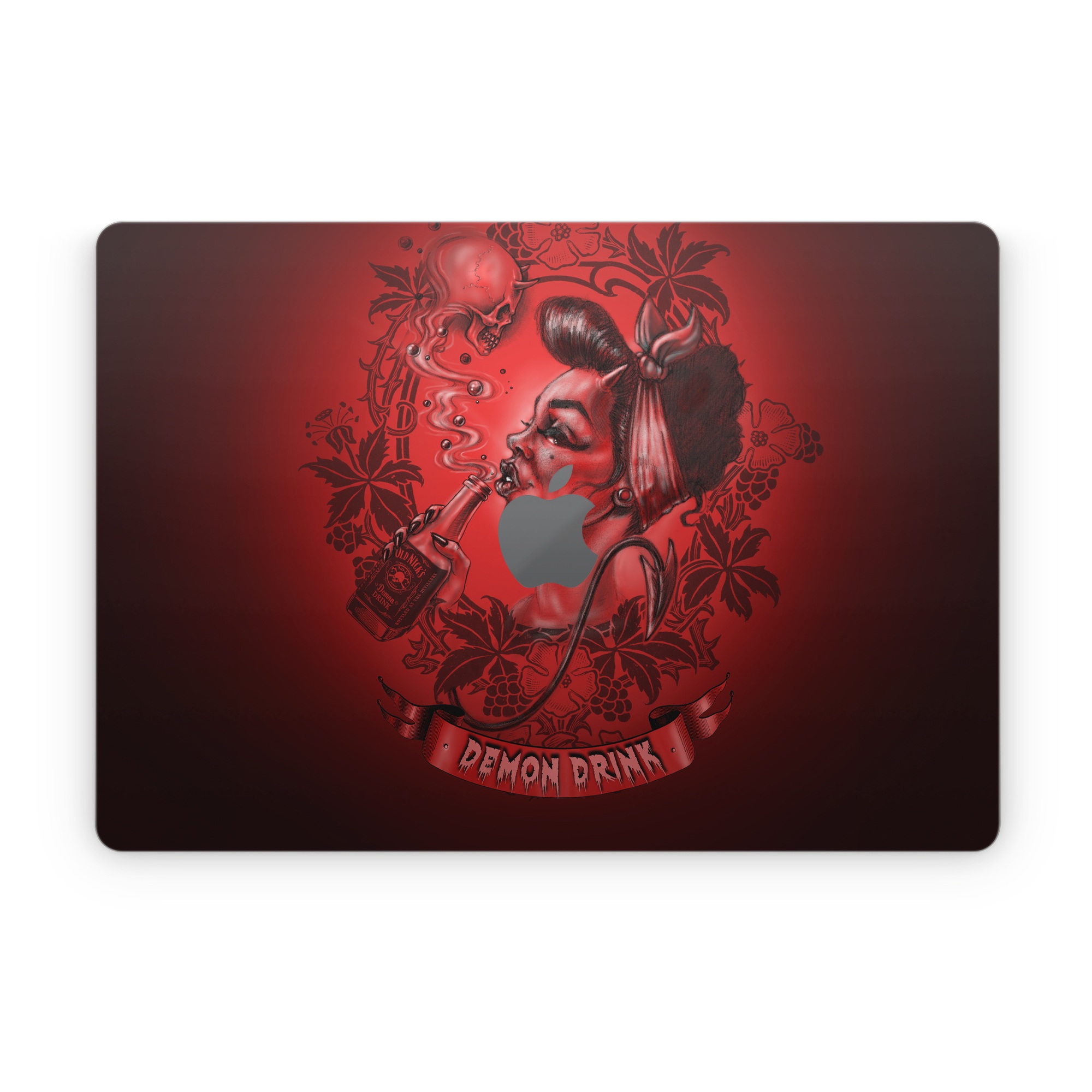 iStyles Apple MacBook Skin design of Font, Art, Magenta, Pattern, Graphics, Visual arts, Painting, Carmine, Illustration, Drawing, with black, red, white colors, and tagged with skulls, signs, people, objects, fantasy, addiction, alcohol, bottle.