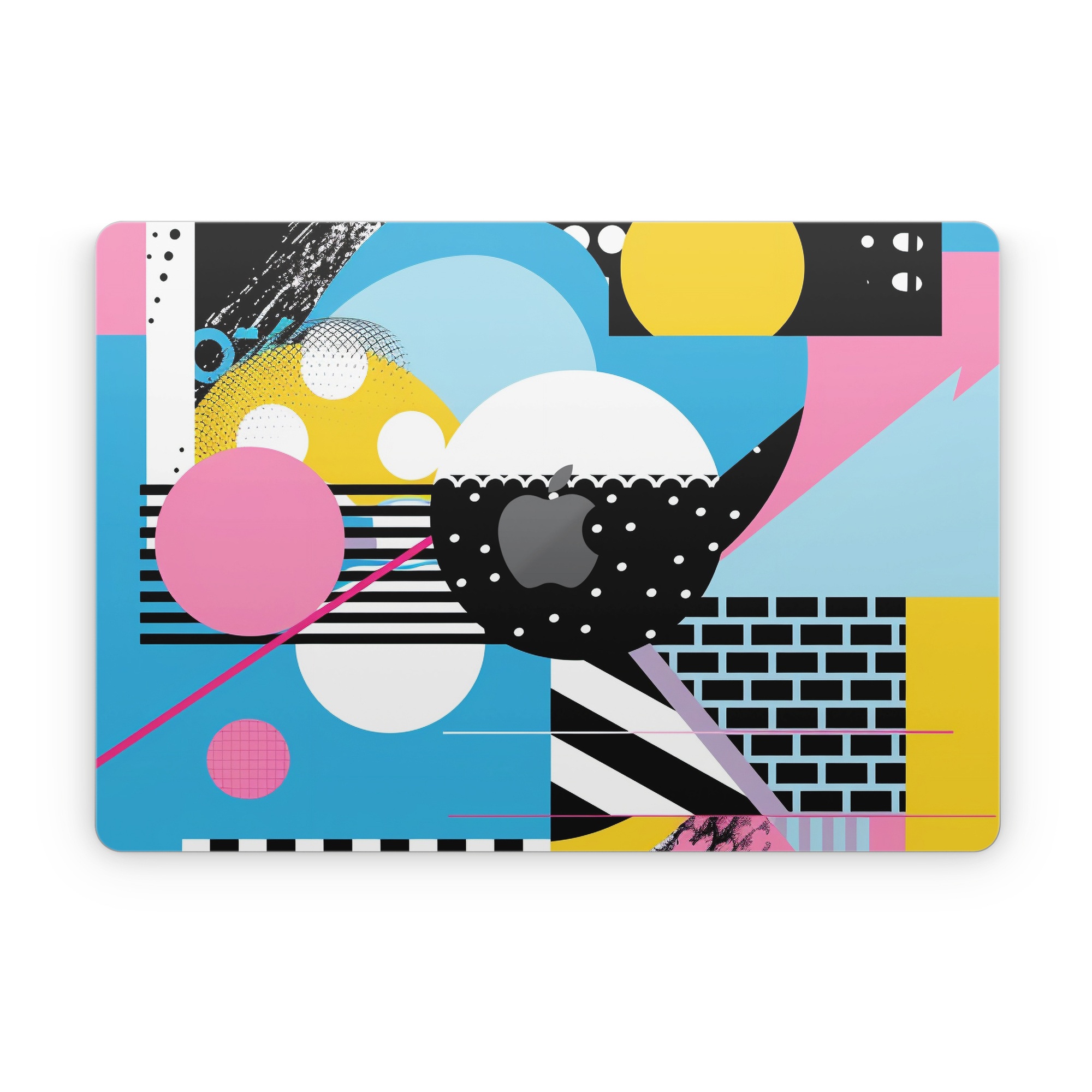 iStyles Apple MacBook Skin design of White, Yellow, Art, Font, Pattern, Circle, Design, Creative arts, Graphics, Electric blue, with blue, pink, white, black, yellow colors, and tagged with abstract, abstract, checkered, bricks, circles, lines.