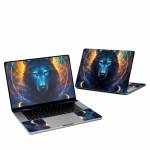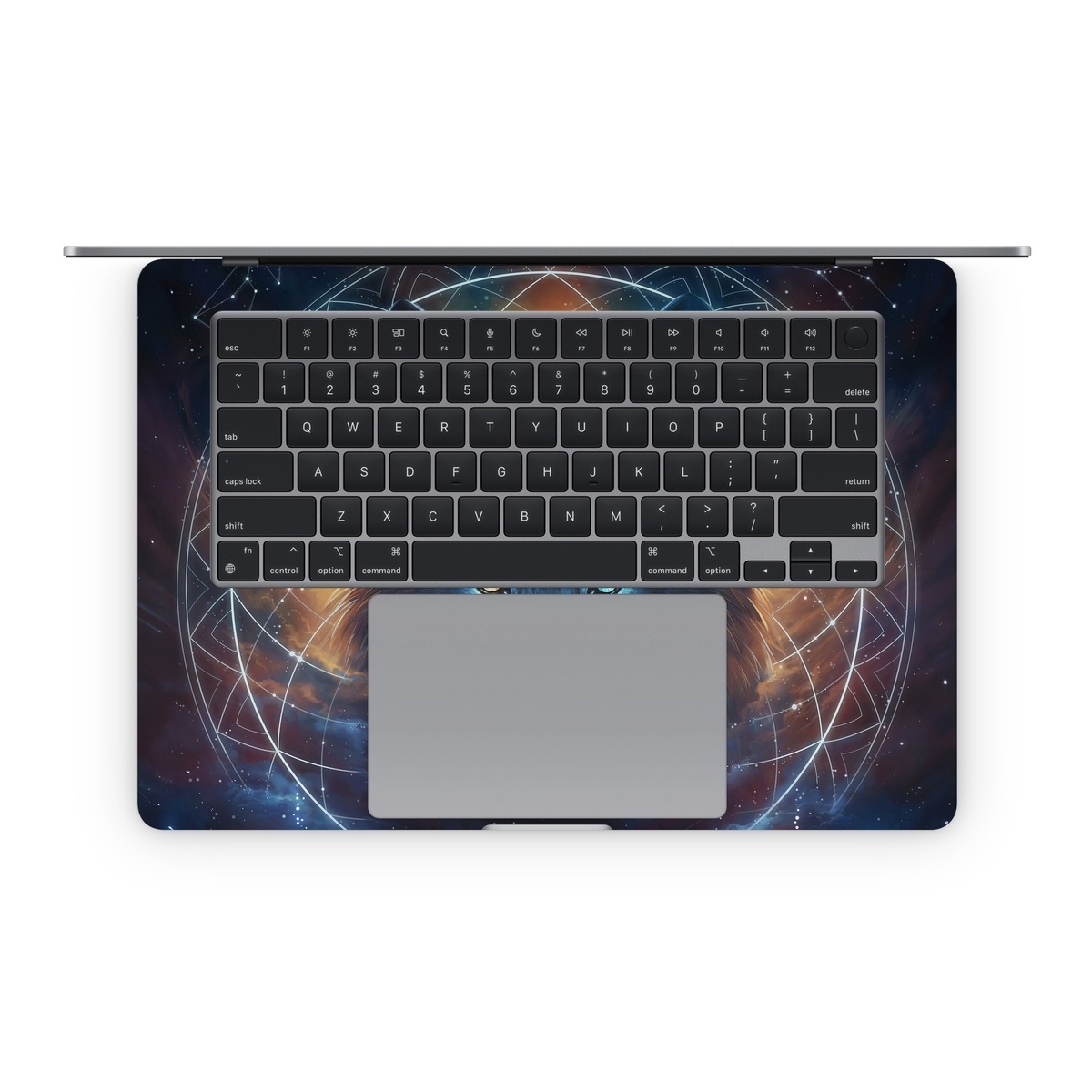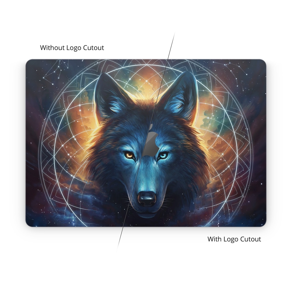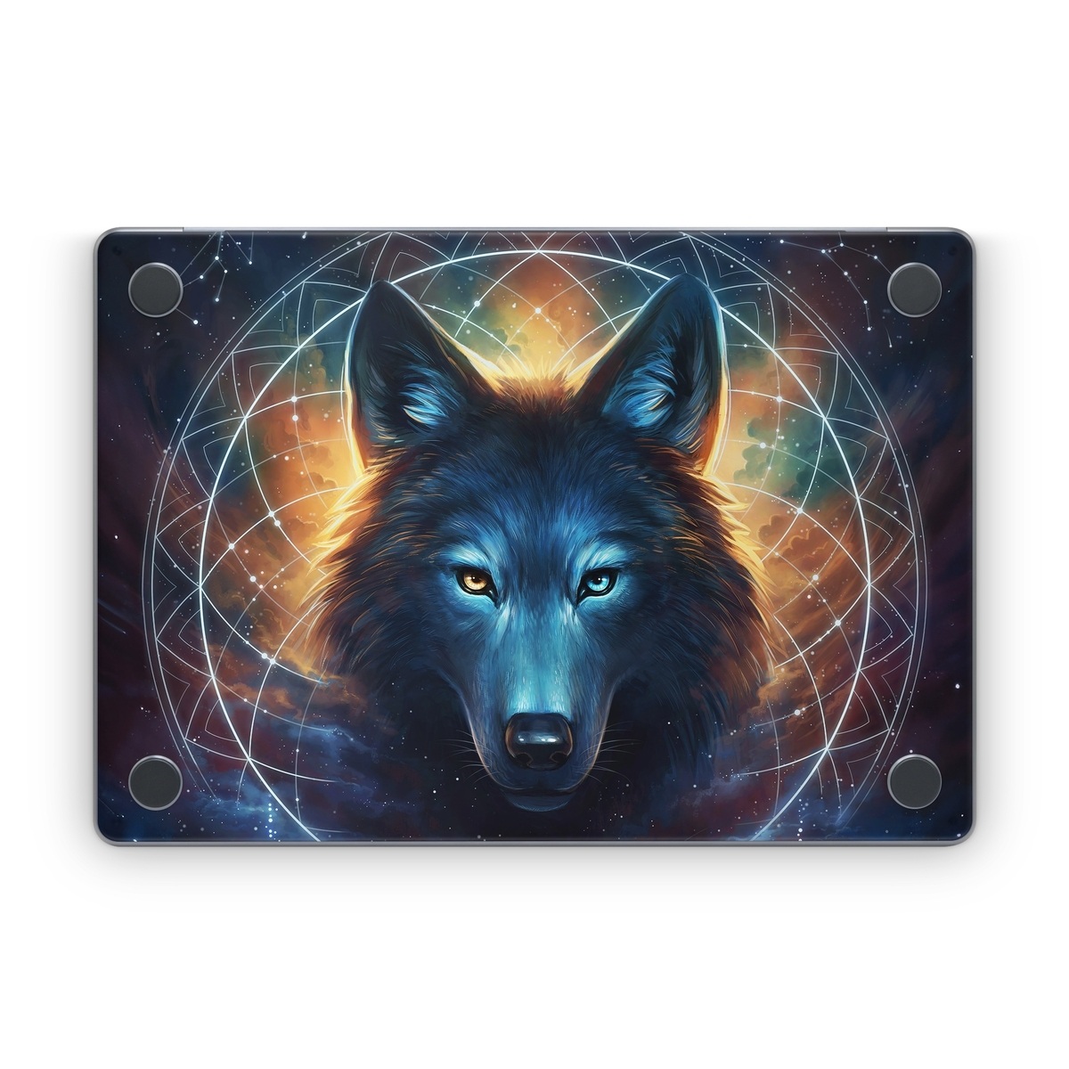 iStyles Apple MacBook Skin design of Light, Nature, Carnivore, Organism, Dog breed, Art, Electric blue, Space, Midnight, Illustration, with black, blue, yellow, orange, green, red, white colors, and tagged with animals, signs, space, fantasy, blue, feathers, moon, sky, wolf, yellow.
