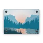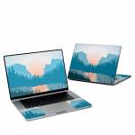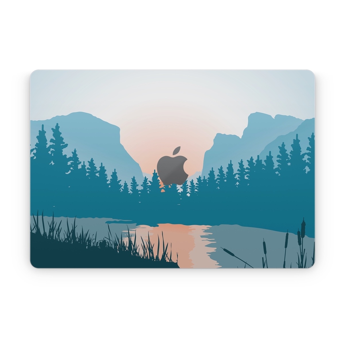 iStyles Apple MacBook Skin design of Sky, Atmosphere, Mountain, Ecoregion, Plant, Natural landscape, Larch, Highland, Fog, Atmospheric phenomenon, with blue, yellow, orange, green colors, and tagged with nature, sunset, mountain, forest, landscape, grass.