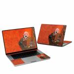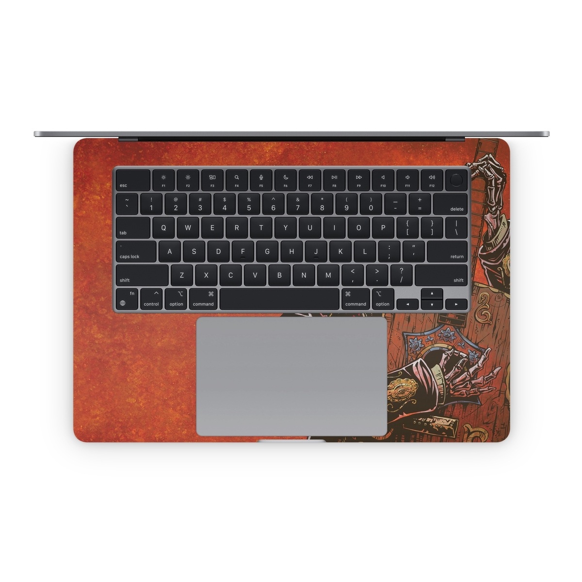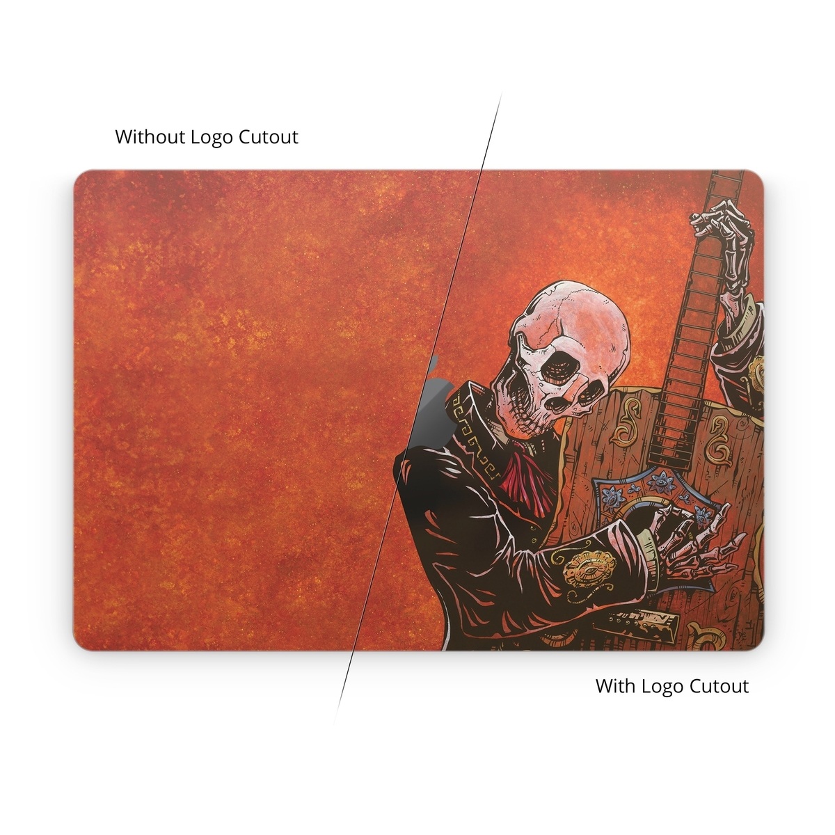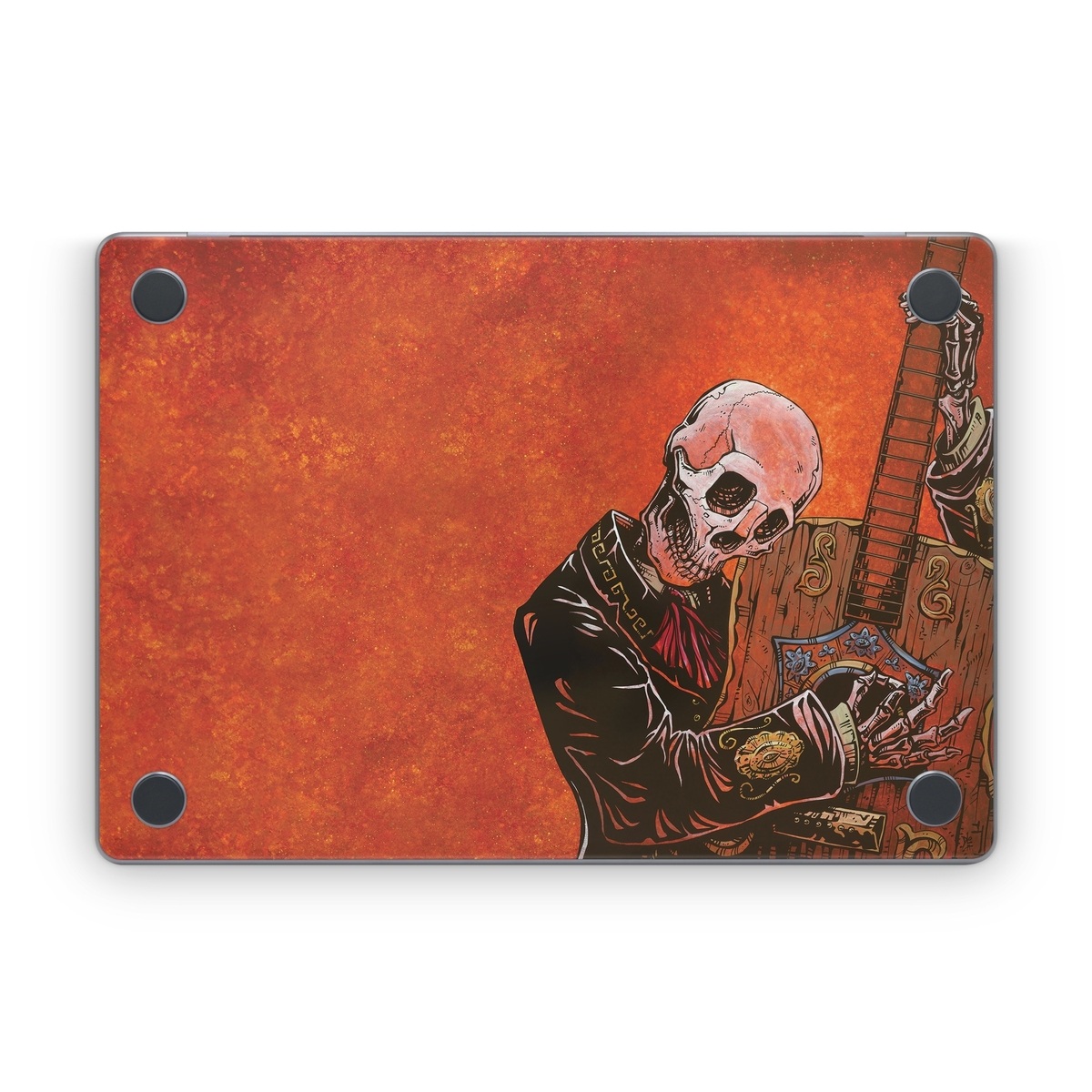iStyles Apple MacBook Skin design of Sleeve, Art, Painting, Personal protective equipment, Artist, Music, Font, Visual arts, Drawing, Skull, with white, black, gray, brown, orange, yellow, red colors, and tagged with skulls, objects, music, guitar, player.