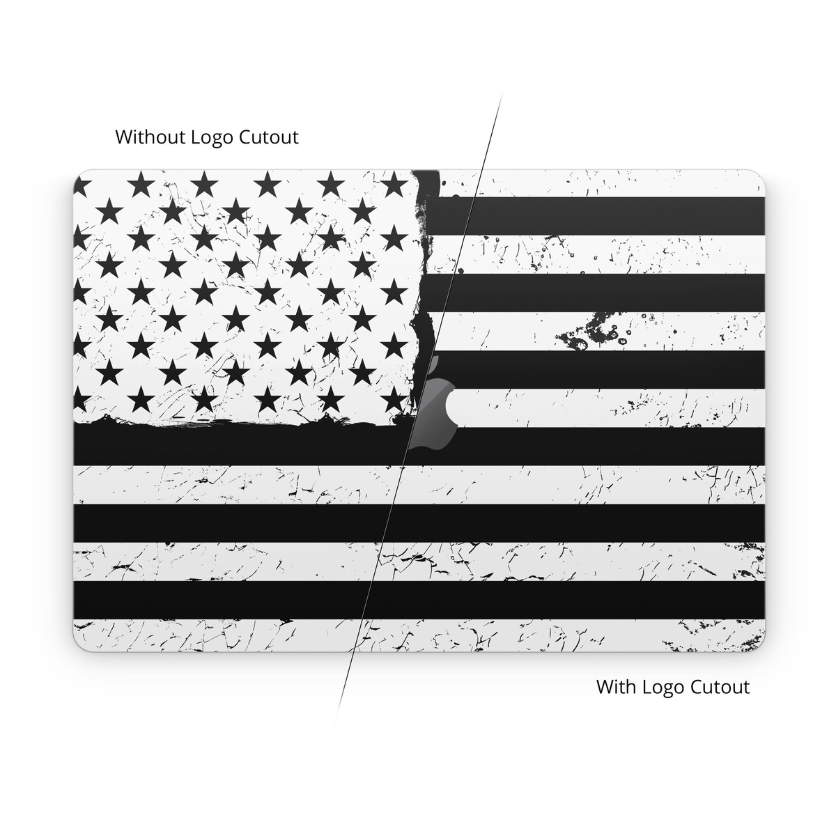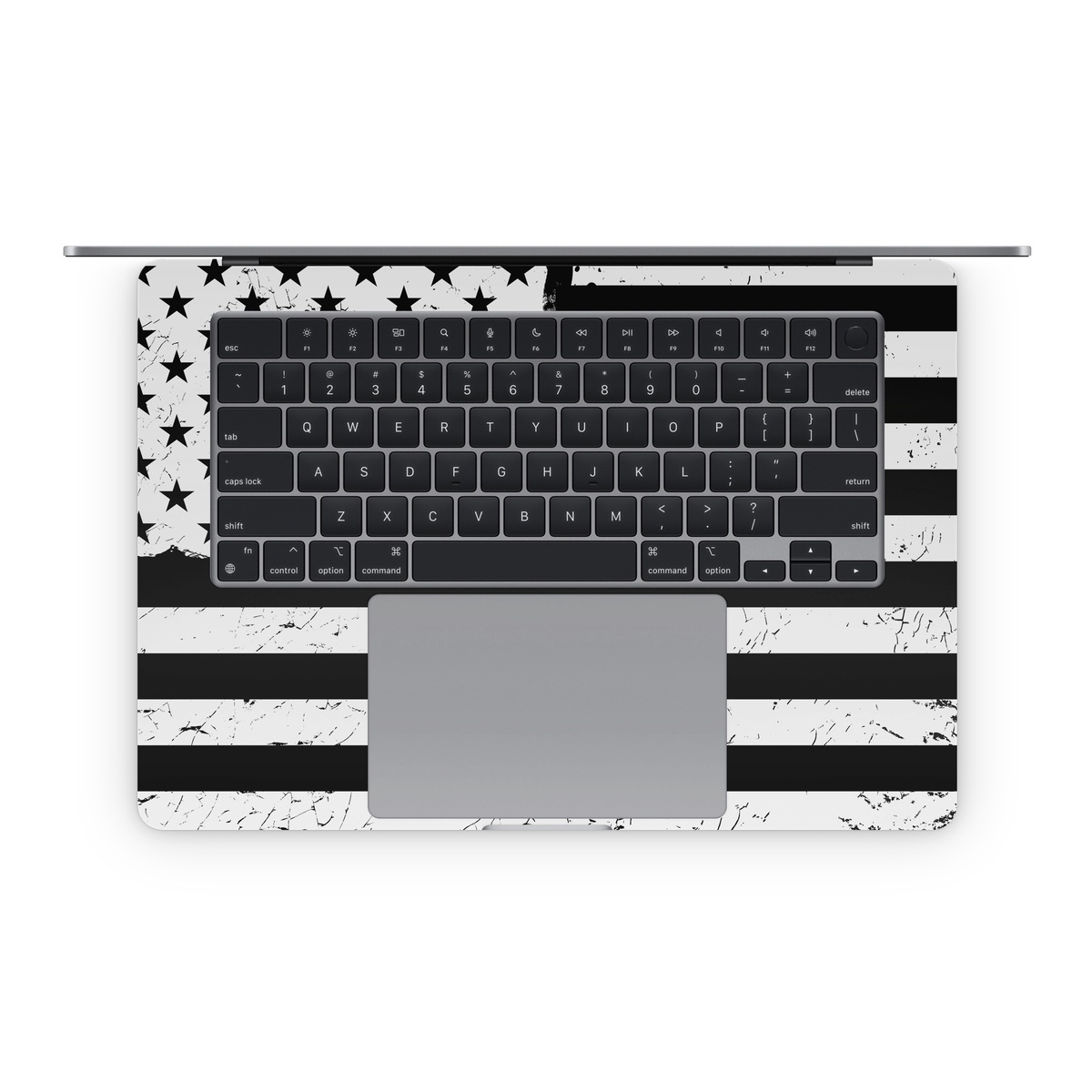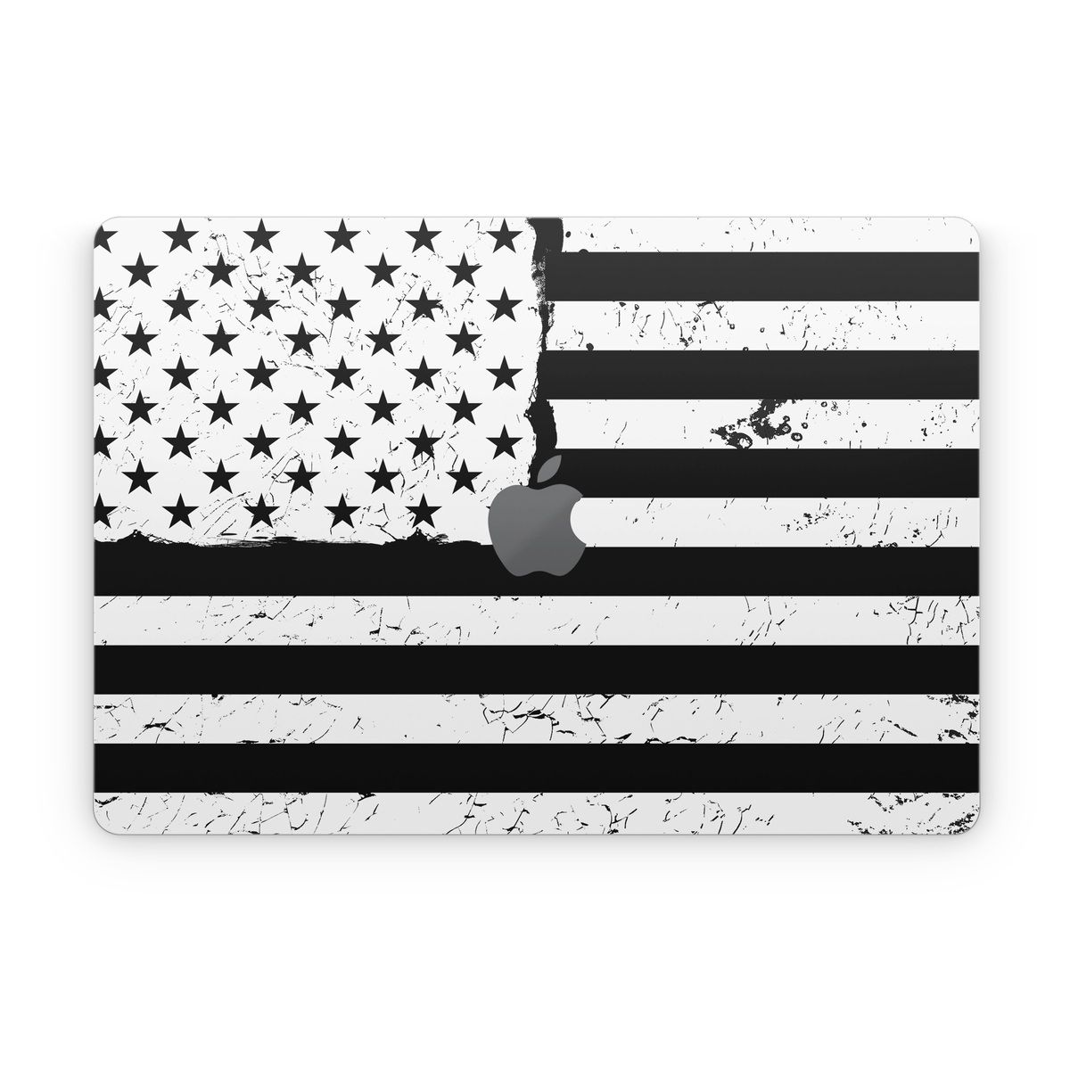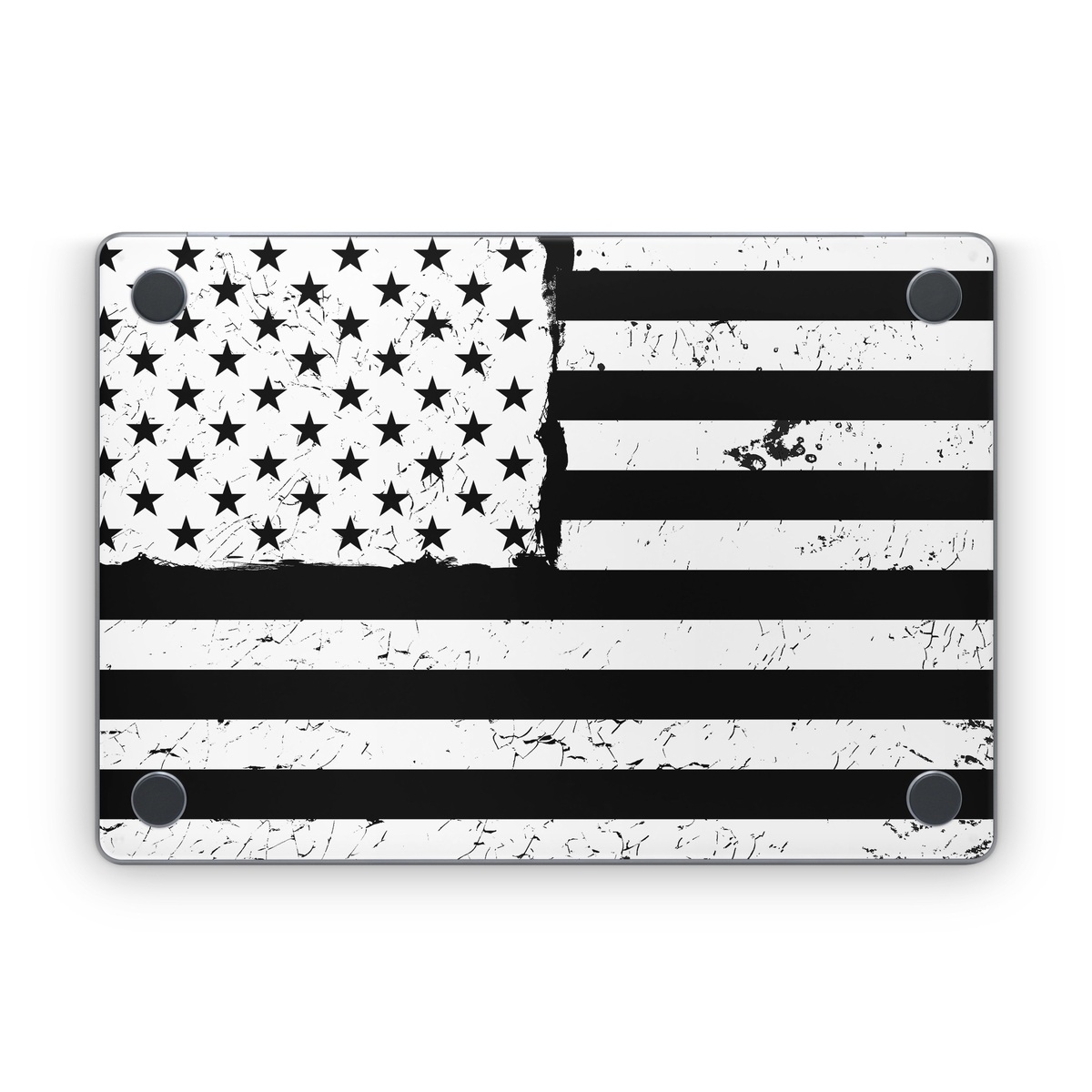 iStyles Apple MacBook Skin design of Line, Black-and-white, Text, Monochrome, Pattern, Design, Monochrome photography, Font, Parallel, Style, with white, black colors, and tagged with flags, patterns, america, b&w, black, flag, grunge, patriotic, usa, white, worn.