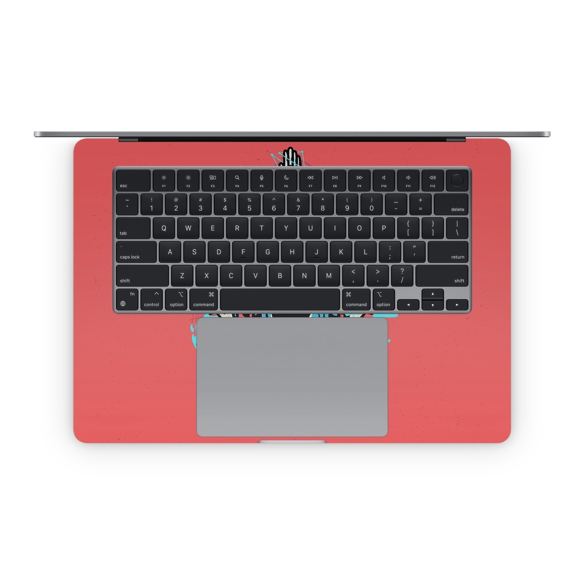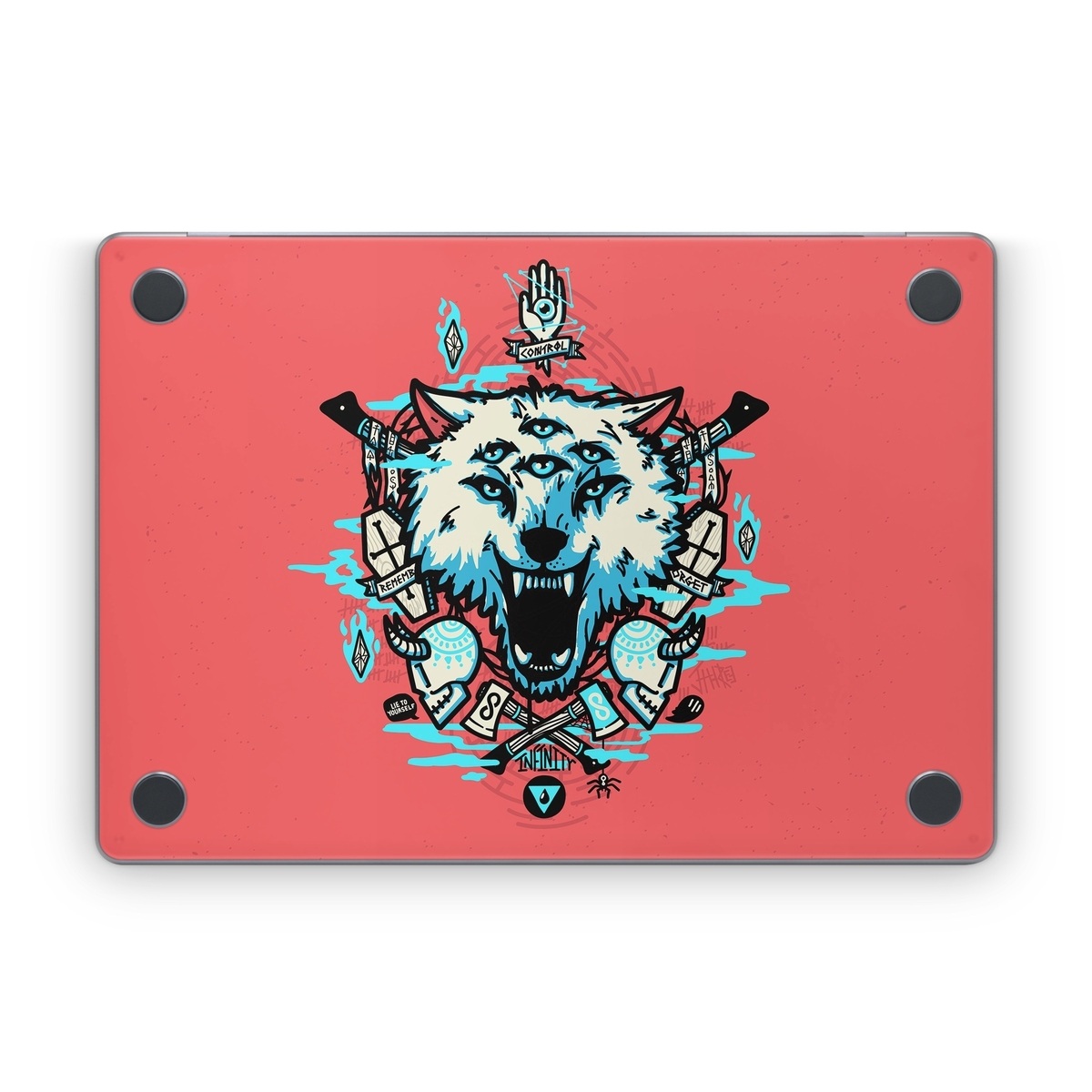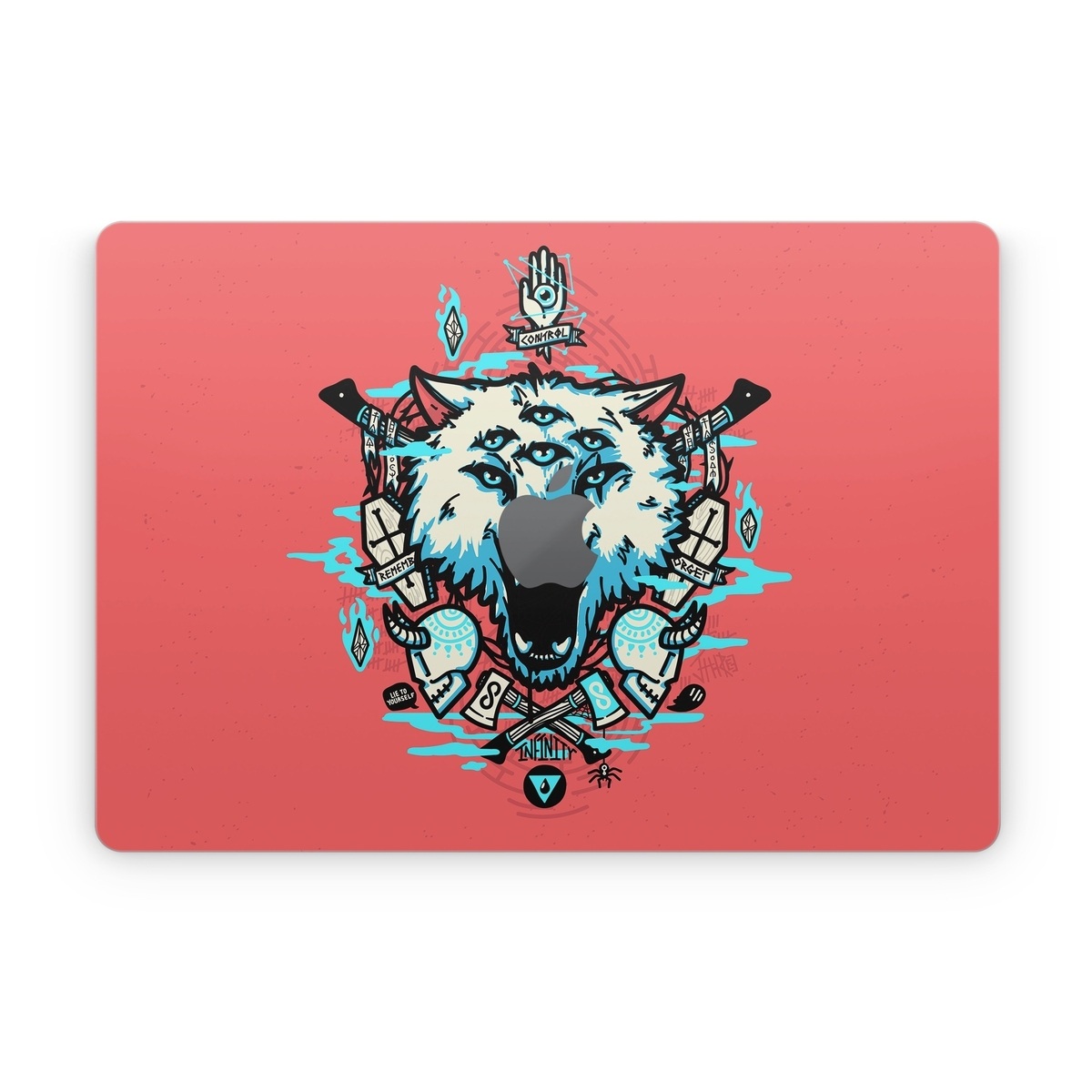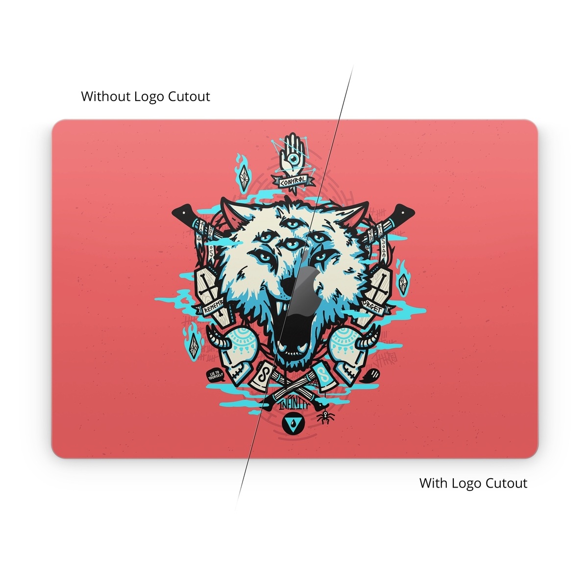 iStyles Apple MacBook Skin design of Graphic design, Illustration, Crest, Logo, T-shirt, Symbol, Font, Graphics, Emblem, Pattern, with red, blue, black, gray colors, and tagged with animals, objects, signs.