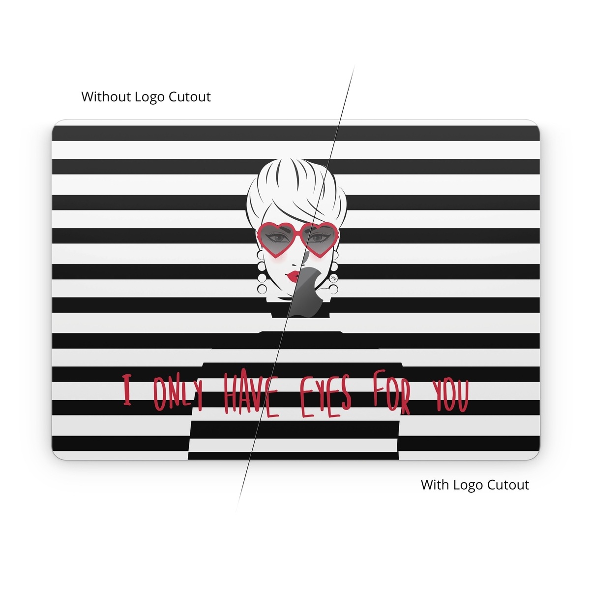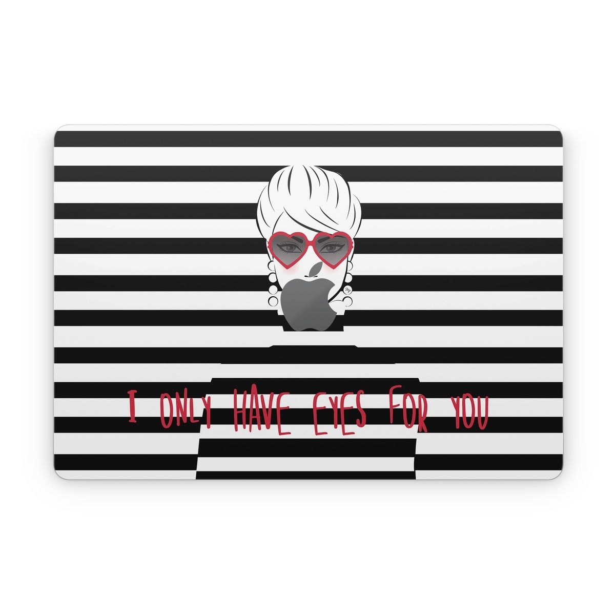 iStyles Apple MacBook Skin design of Rectangle, Font, Gesture, Eyewear, Art, Technology, Personal protective equipment, Goggles, Logo, Eyelash, with black, white, yellow, red colors, and tagged with signs, objects, people, patterns, blackandwhite, girl, glasses, red, stripes, only, have, eyes, for, you.
