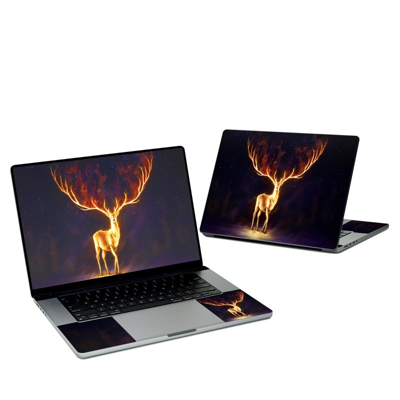 iStyles Apple MacBook Skin design of Plant, Tree, Organism, Entertainment, Fawn, Art, Heat, Performing arts, Landscape, Sky, with black, yellow, red, orange, purple colors, and tagged with animals, space, fantasy, antlers, deer, fire, glow, sky.