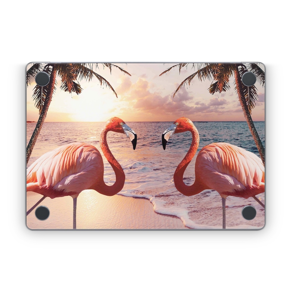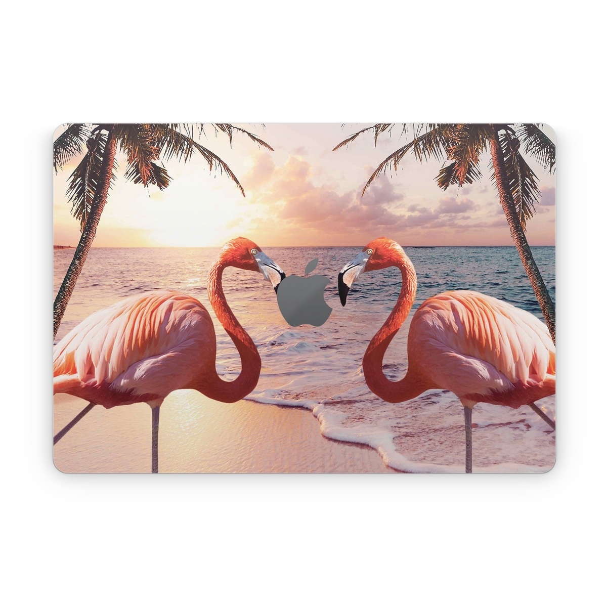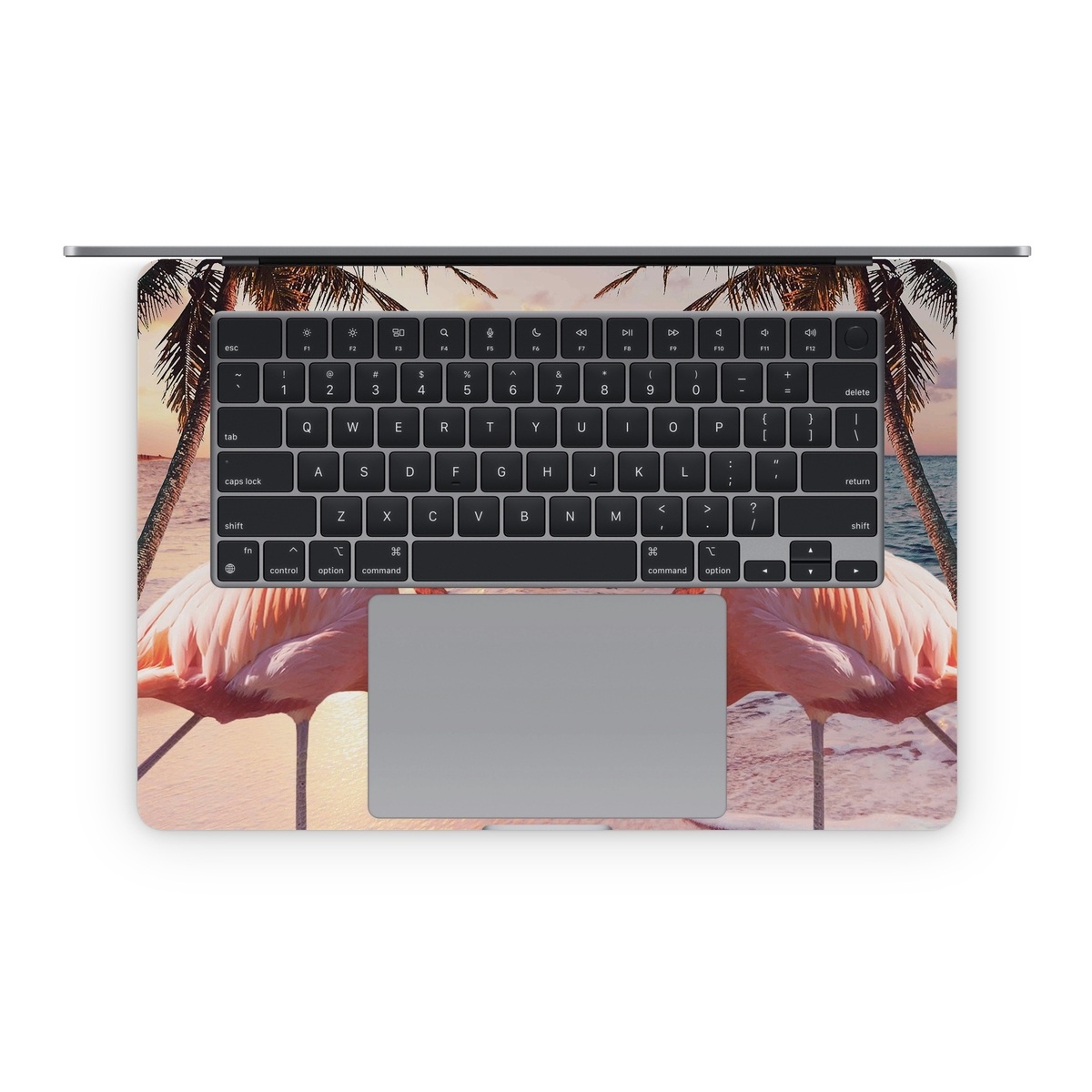 iStyles Apple MacBook Skin design of Flamingo, Greater flamingo, Bird, Water bird, Pink, Wildlife, Sky, Tree, Organism, Beak, with pink, blue, green, yellow, white, orange, black colors, and tagged with animals, nature, animal, animals, beach, bird, birds, flamingo, ocean, palm, palmtrees, pink, sunset, tropical, tropics.