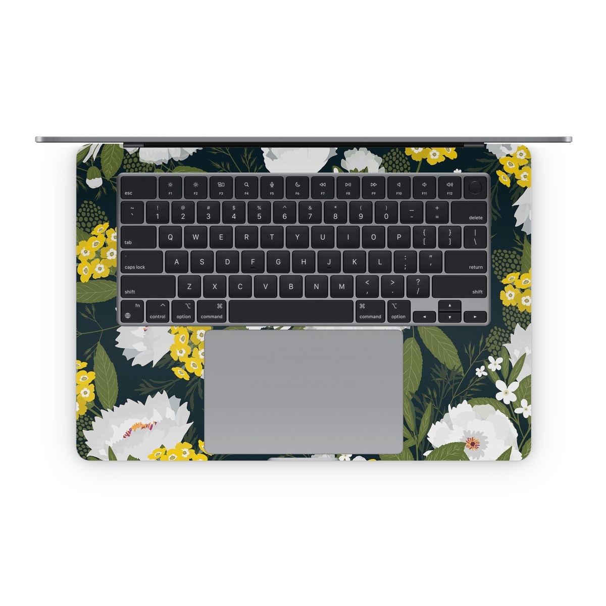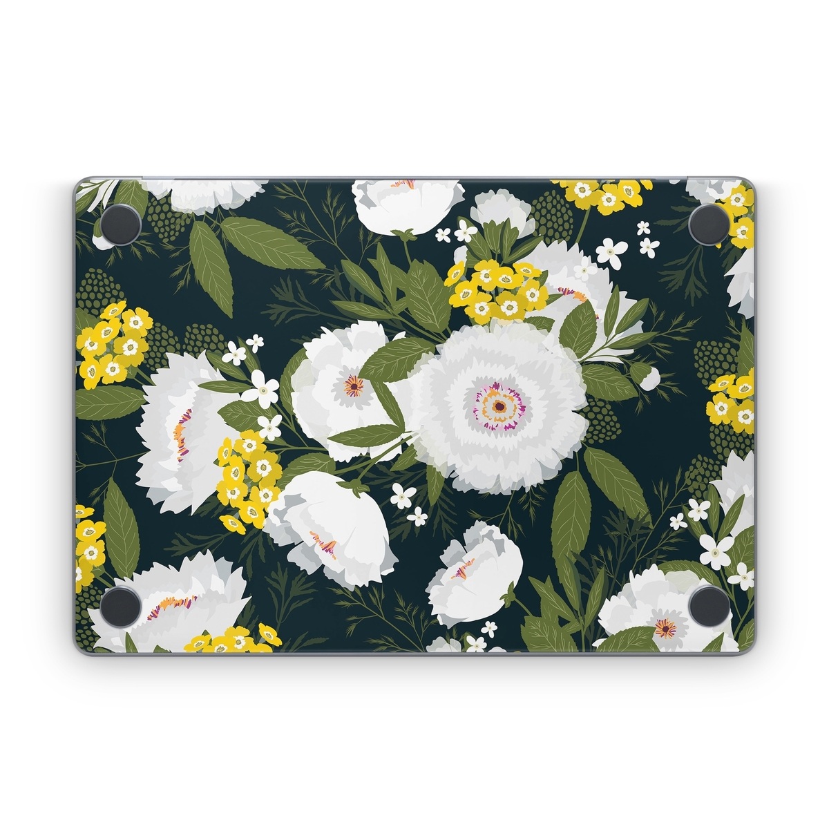 iStyles Apple MacBook Skin design of Flower, Flowering plant, Plant, Petal, Daisy, mayweed, Wildflower, Floral design, Annual plant, with green, yellow, white, orange colors, and tagged with patterns, flowers, filigree, floral, flower, flowers, pattern.