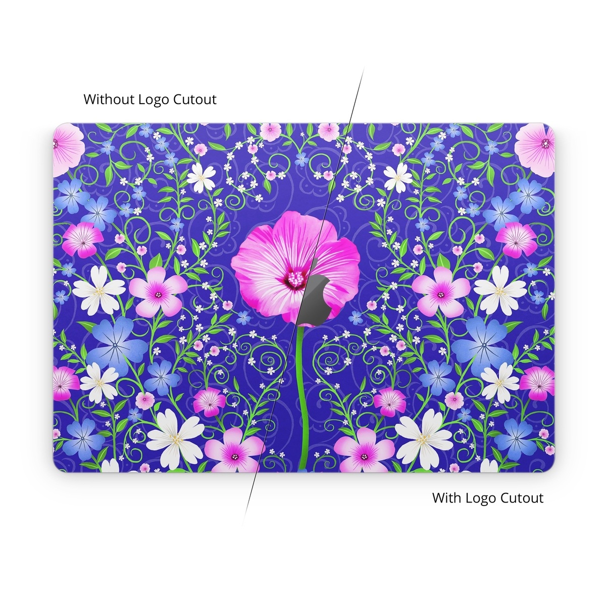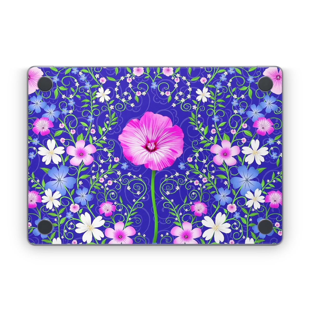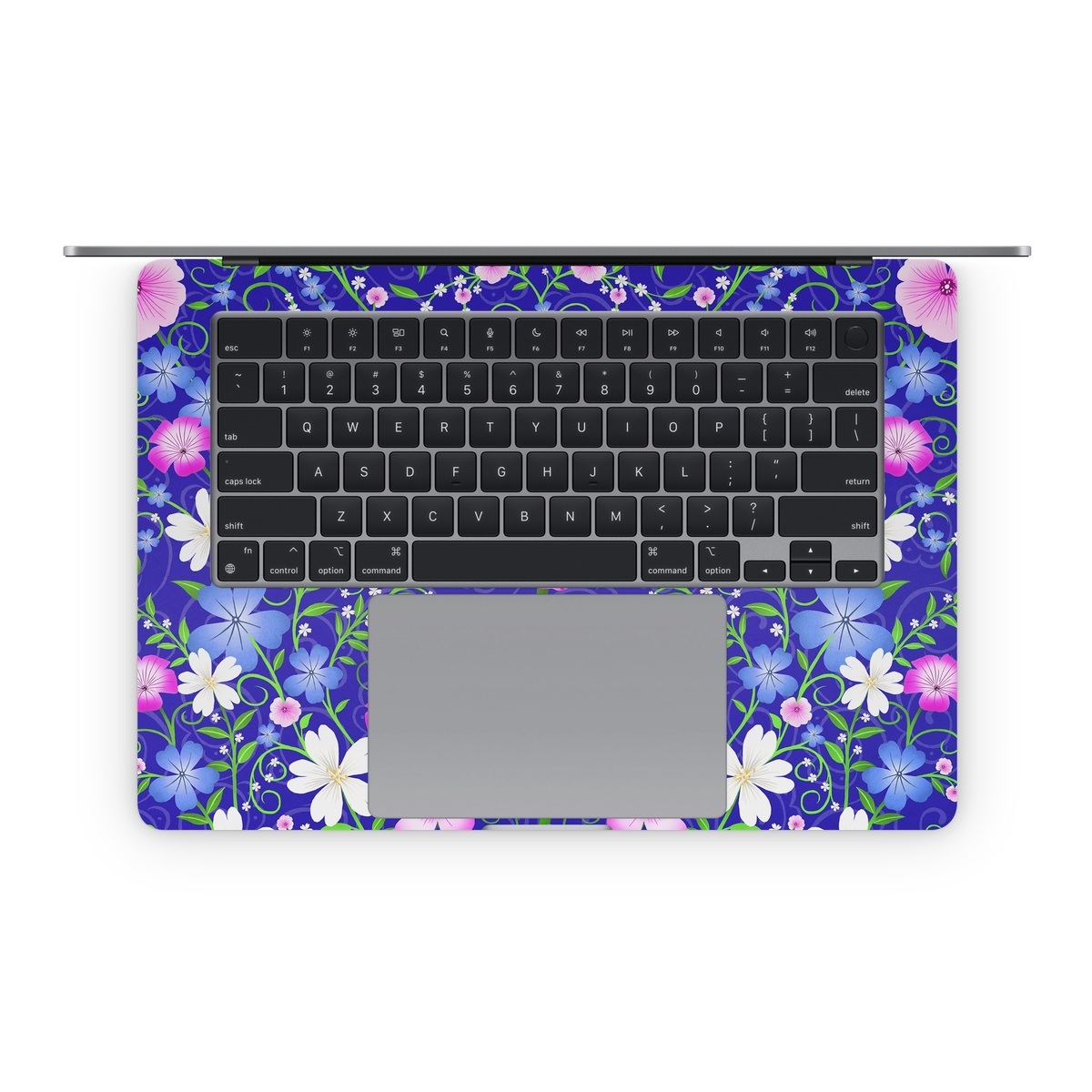 iStyles Apple MacBook Skin design of Purple, Violet, Flower, Plant, Wildflower, Pattern, Petal, Design, Graphics, Morning glory, with blue, purple, pink, green, white, yellow colors, and tagged with flowers, patterns, floral, flowers, nature.