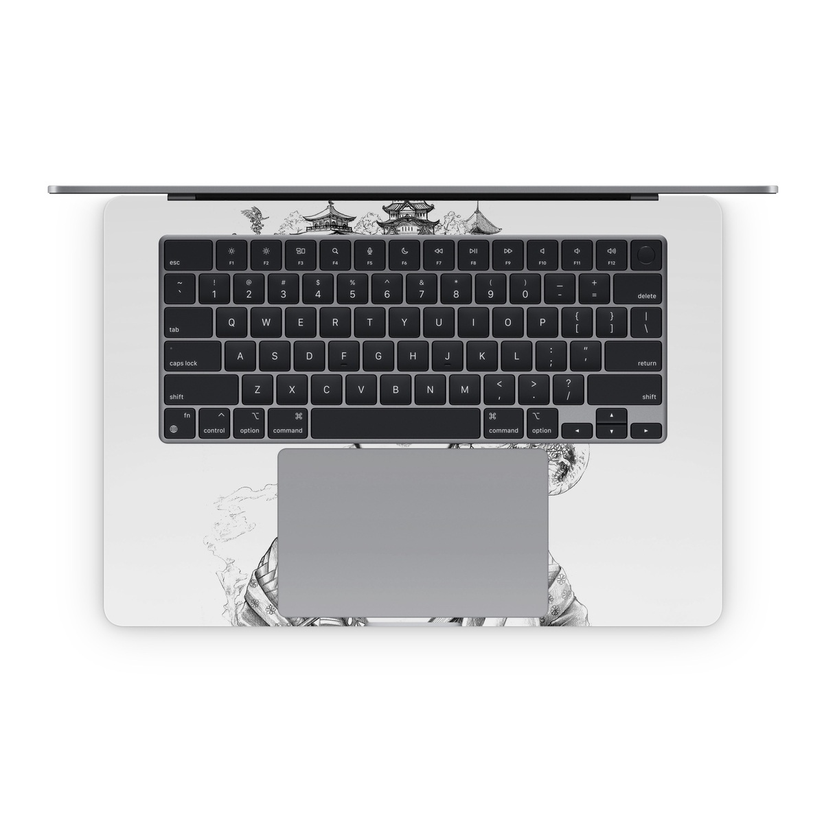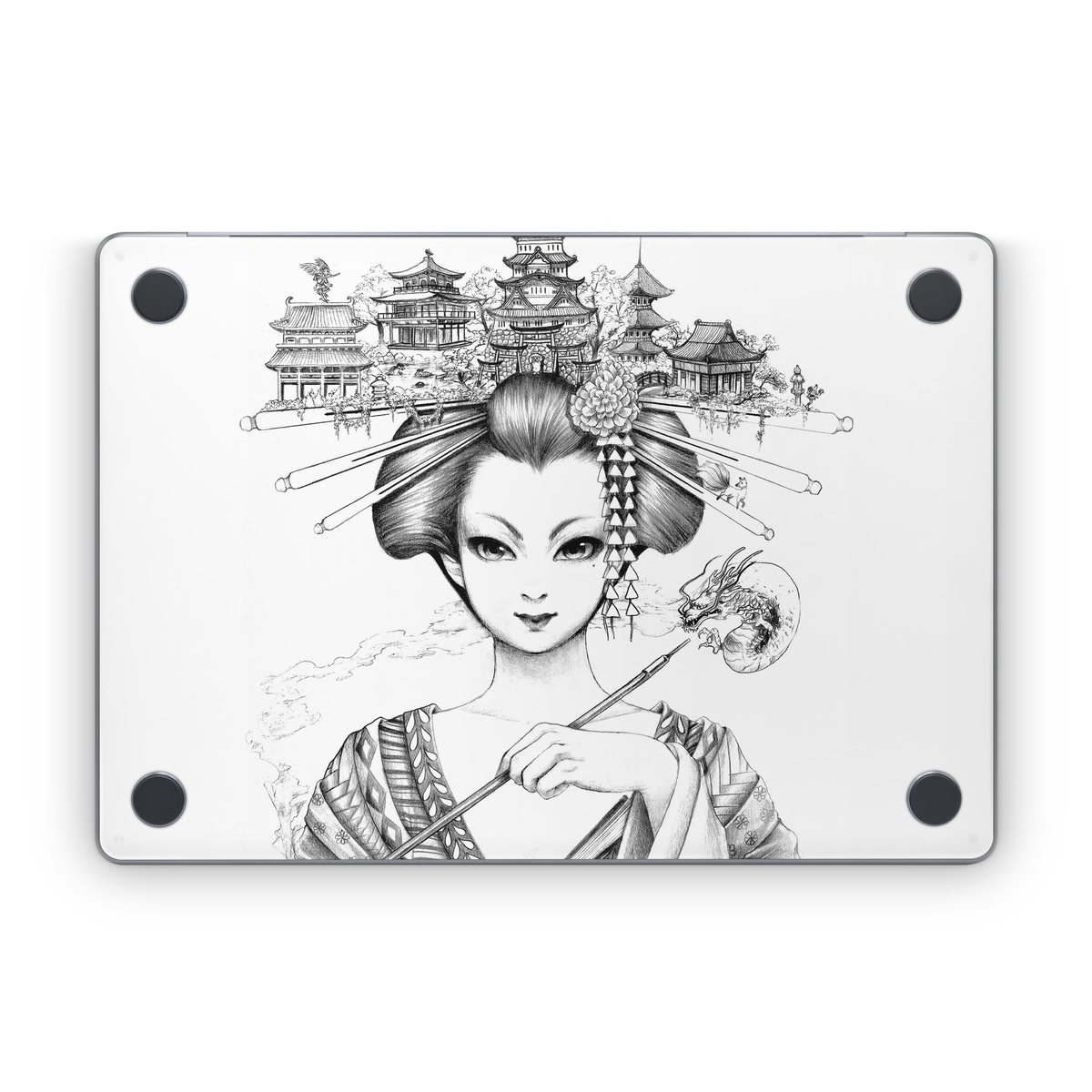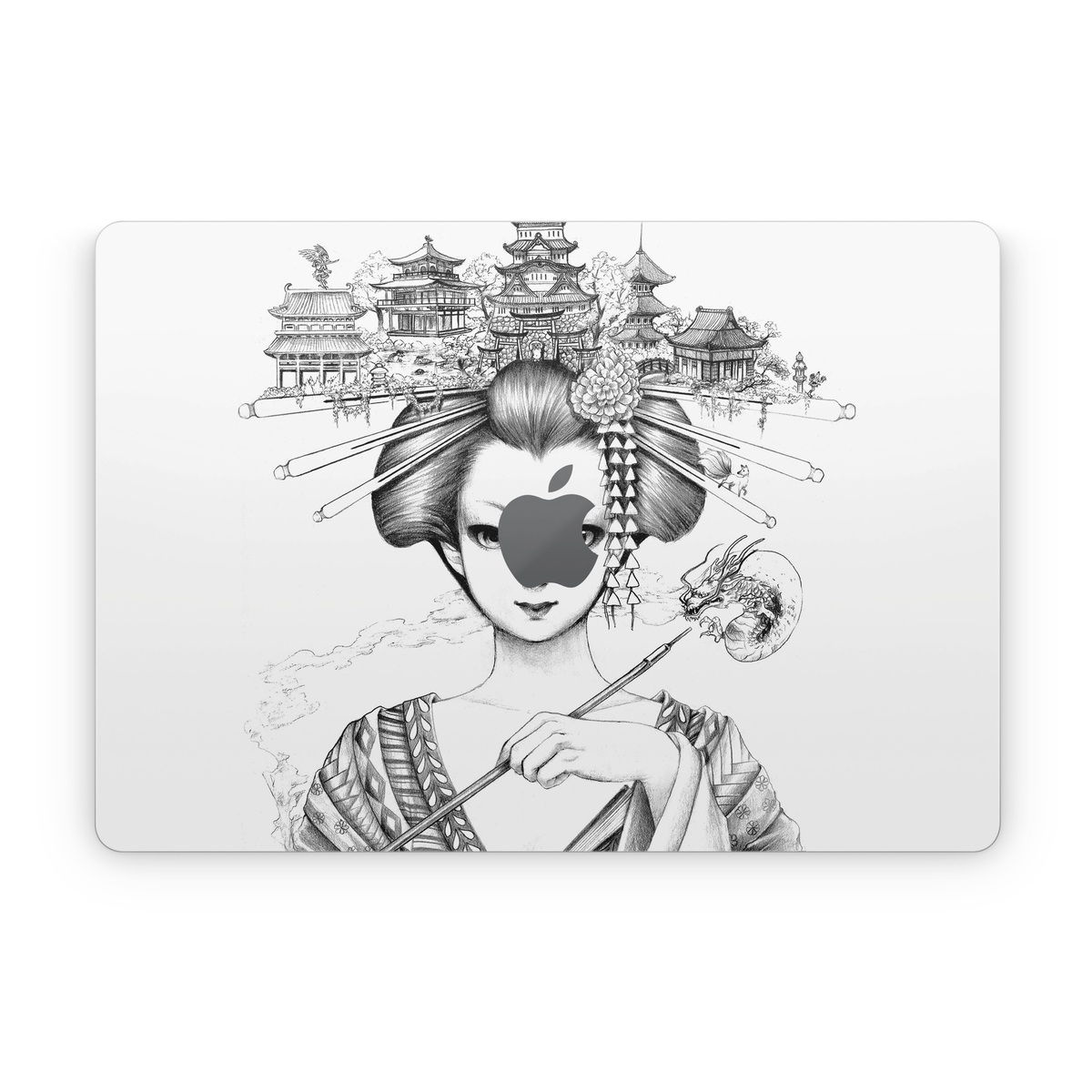 iStyles Apple MacBook Skin design of Illustration, Head, Hairstyle, Line art, Art, Fashion illustration, Drawing, Coloring book, Black-and-white, Clip art, with black, white, gray colors, and tagged with people, fineart, urban, flowers, objects, animals, blackandwhite, drawn, geisha, geishagirl, handdrawn, sketch.