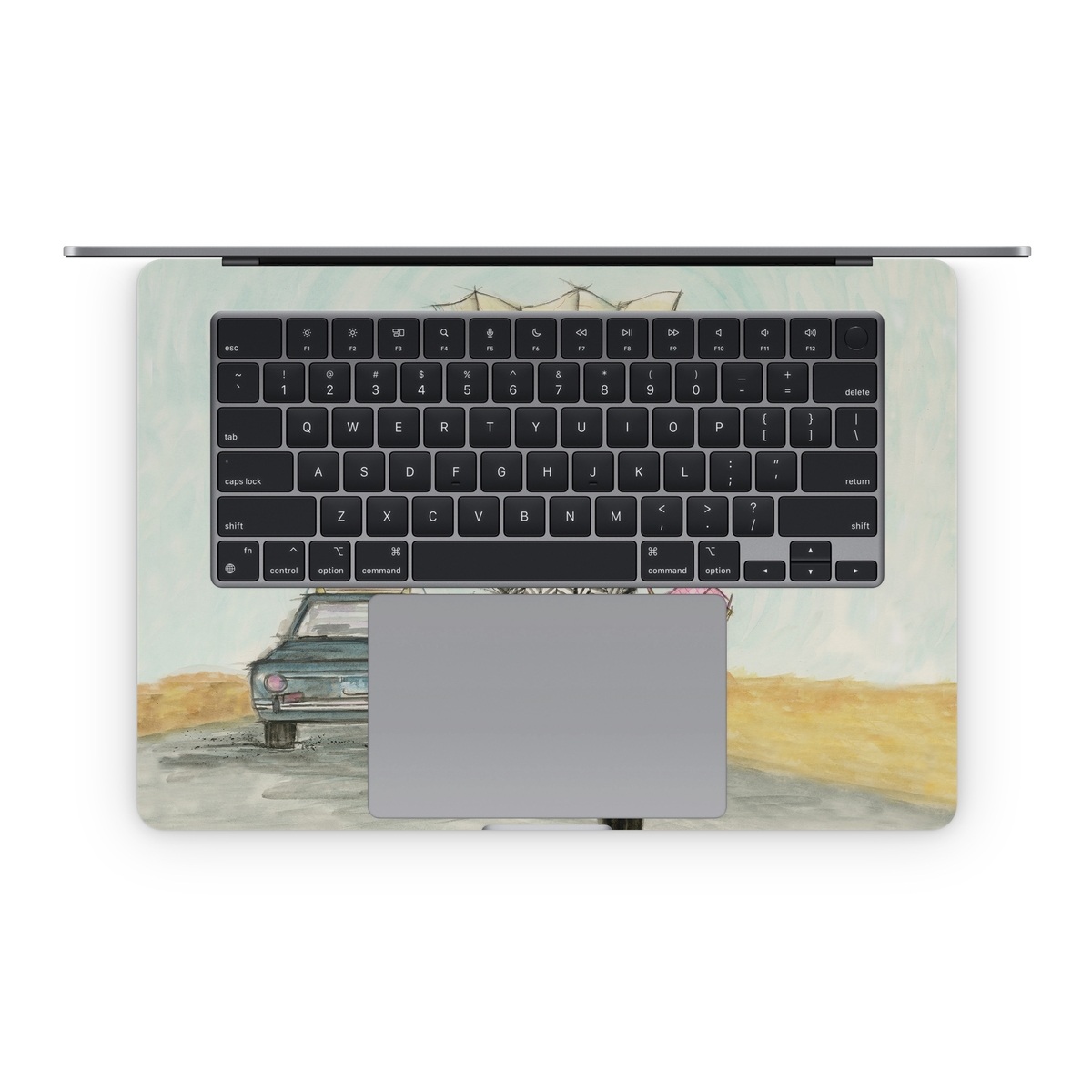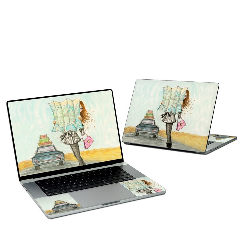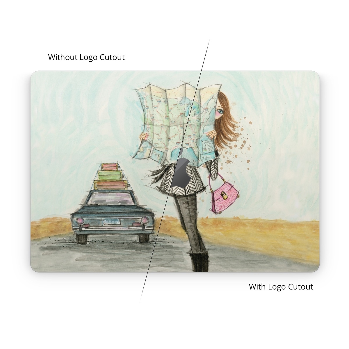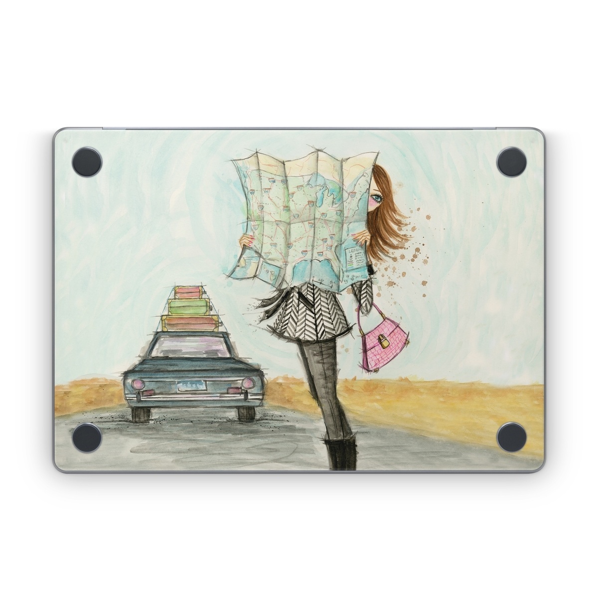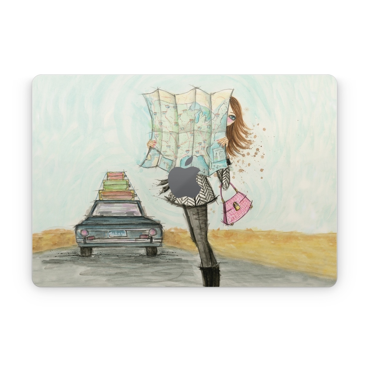 iStyles Apple MacBook Skin design of Fashion illustration, Sketch, Watercolor paint, Illustration, Drawing, Art, Footwear, Vehicle, Painting, Fashion design, with blue, black, gray, white, pink, brown, green, orange, yellow colors, and tagged with people, fineart, objects, fashion, maps, adventure, driving, fashion, map, roadtrip.