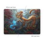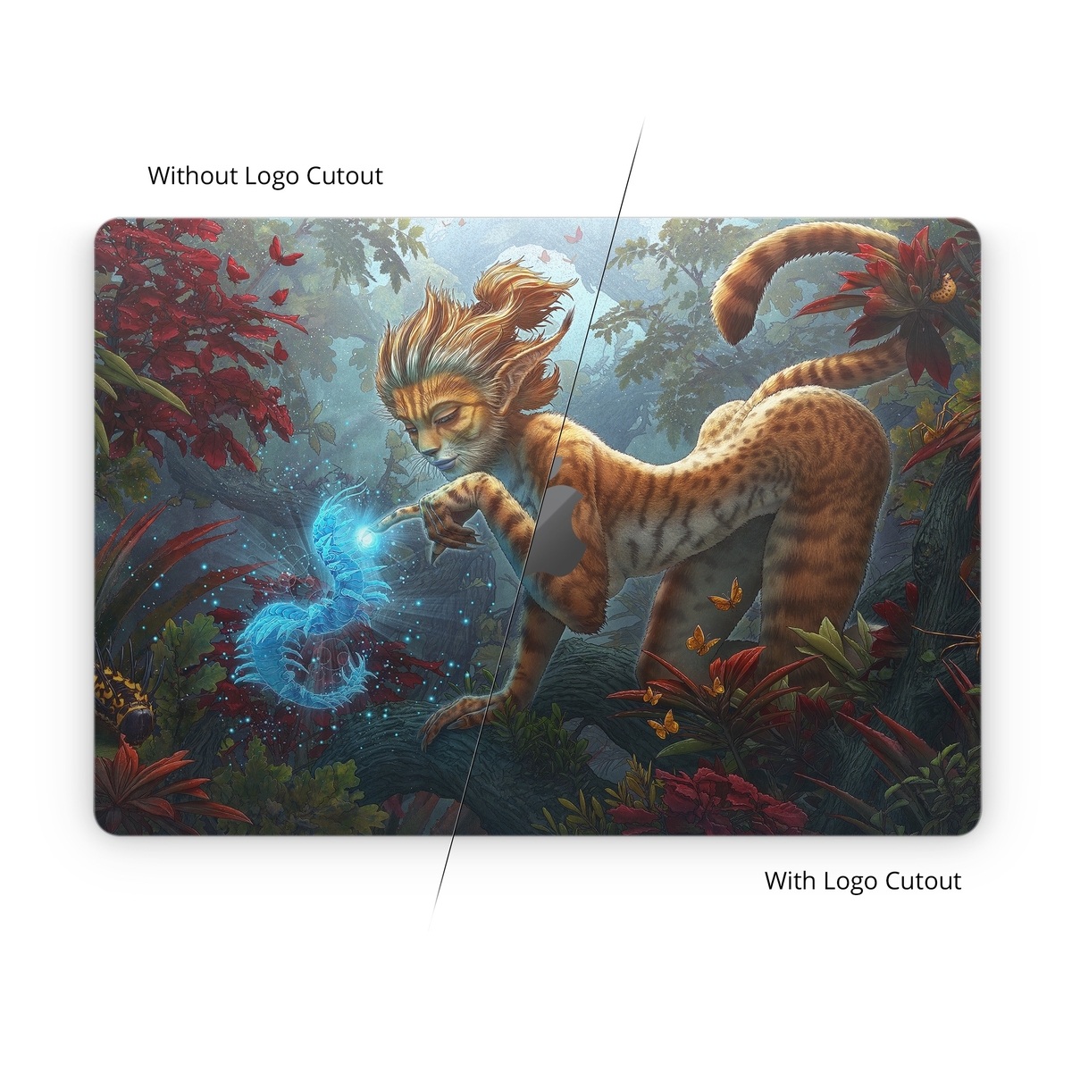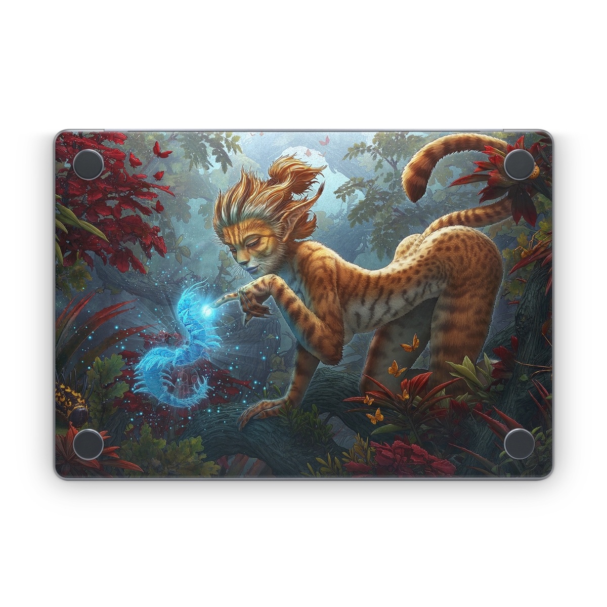 iStyles Apple MacBook Skin design of Fictional character, Mythology, Illustration, Cg artwork, Sky, Organism, Dragon, Felidae, Mythical creature, Art, with yellow, red, black, green, blue colors, and tagged with fantasy, animals, patterns, people, nature, cat, fantasy, forest, nature, woman.