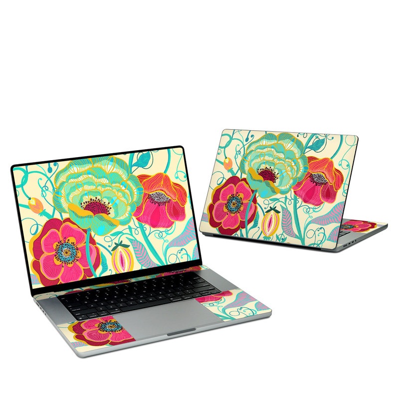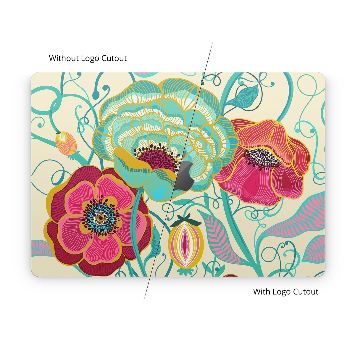 iStyles Apple MacBook Skin design of Plant, Botany, Textile, Pink, Creative arts, Petal, Magenta, Art, Pattern, Rectangle, with white, red, pink, yellow, green, blue, black colors, and tagged with patterns, flowers, flowers, garden, vine.