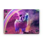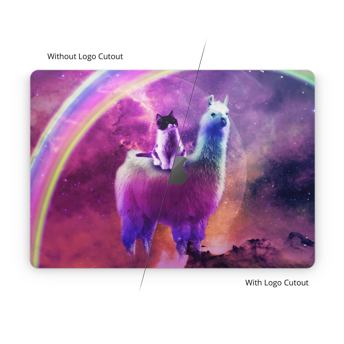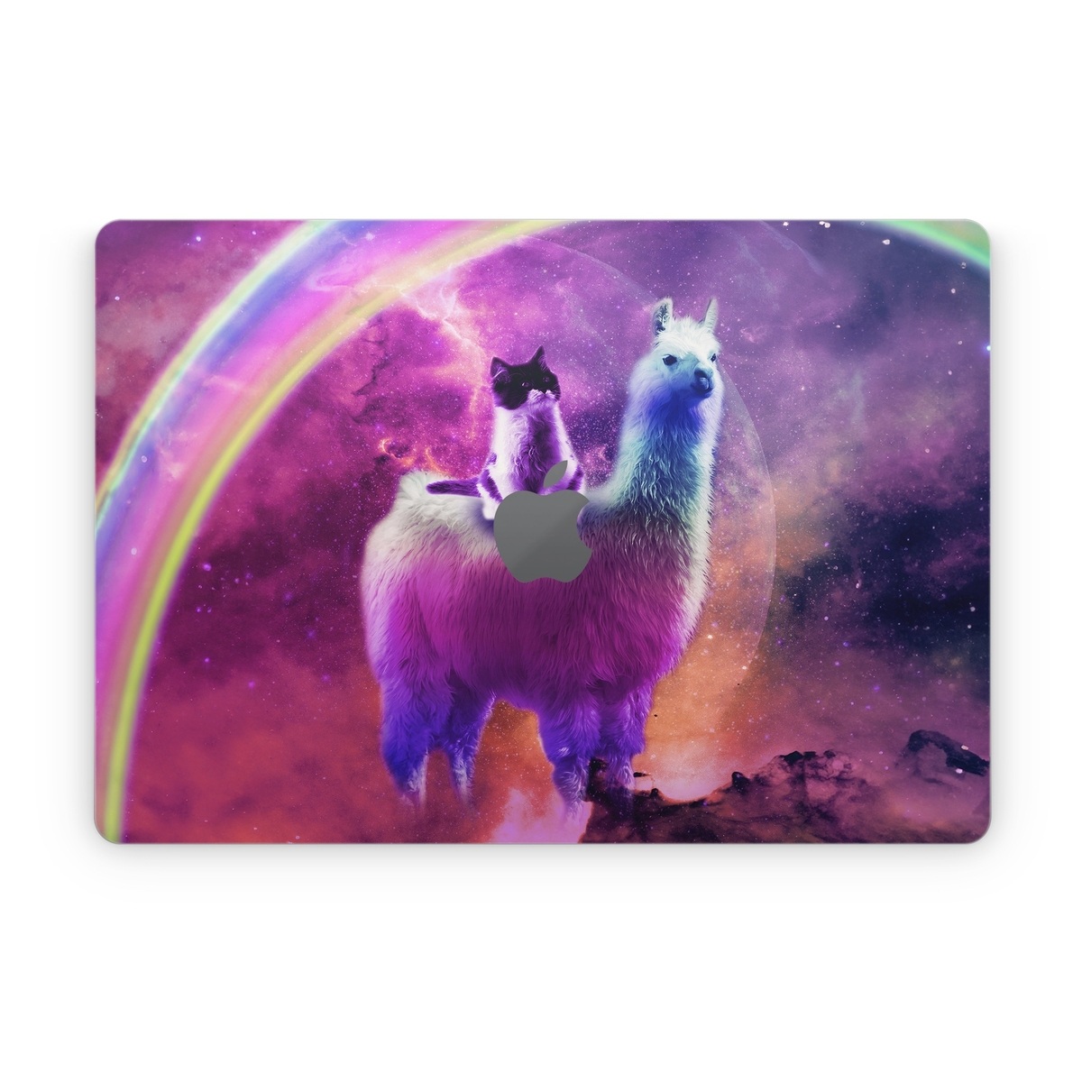 iStyles Apple MacBook Skin design of Llama, Purple, Camelid, Alpaca, Sky, Livestock, Space, with purple, white, blue, pink, yellow, black colors, and tagged with space, animals, fantasy, animals, funny, galaxy, lasers, random, space, weird.