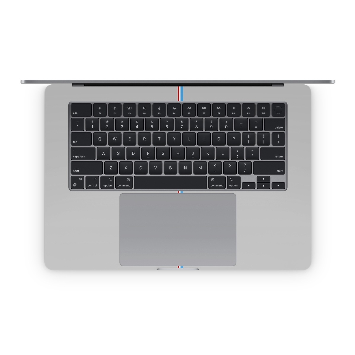 The MacBook inner Skins are precision cut to cover the area around the keyboard - the complexity and large size of this surface does make Skin alignment a little more tricky but the final effect when it's done properly is well worth the effort. What we generally do during Skin application is to first align the Skin to the major physical cutouts, and in this case, that will be the trackpad area. Peel the whole inner Skin off and start with the bottom half; hold the Skin at both ends of the wrist rest area and gently position until it aligns perfectly to the trackpad. One trick will be to keep the top half (the thin stripes that go beside the keyboard) folded back over the bottom half such that the stripes do not get stuck on your MacBook when you're positioning the bottom half. Once you've aligned the trackpad, everything else will fall in place with a little guidance.