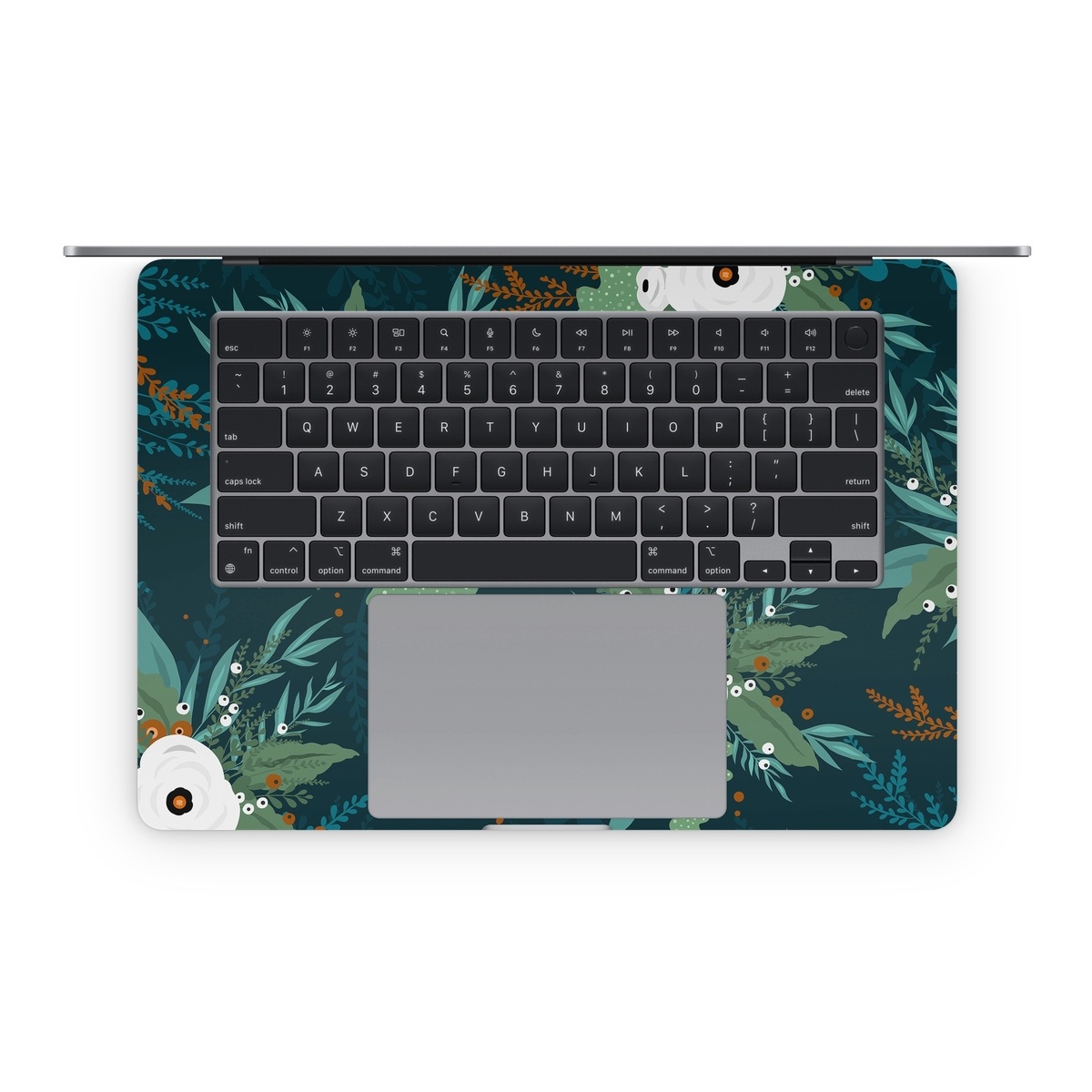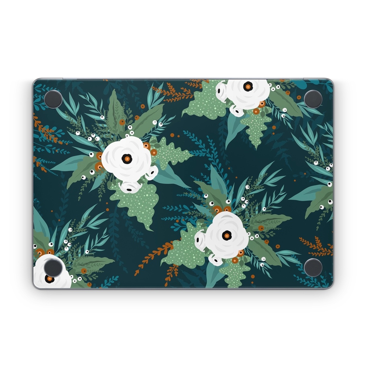 iStyles Apple MacBook Skin design of Pattern, Branch, Tree, Illustration, Design, Plant, Textile, Art, Visual arts, Space, with green, white, red, blue colors, and tagged with patterns, flowers, blue, florals, flowers, garden, green, pattern.