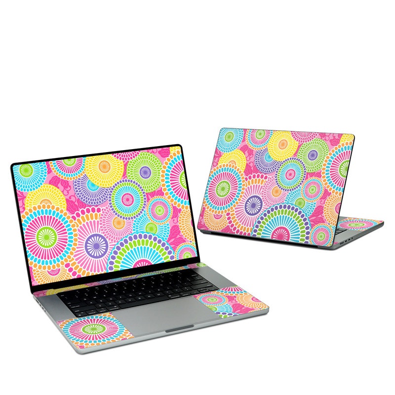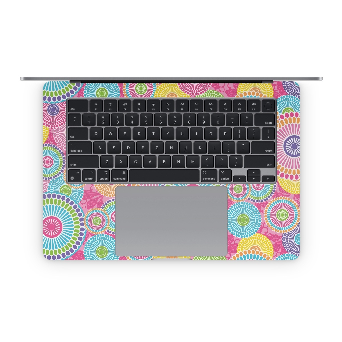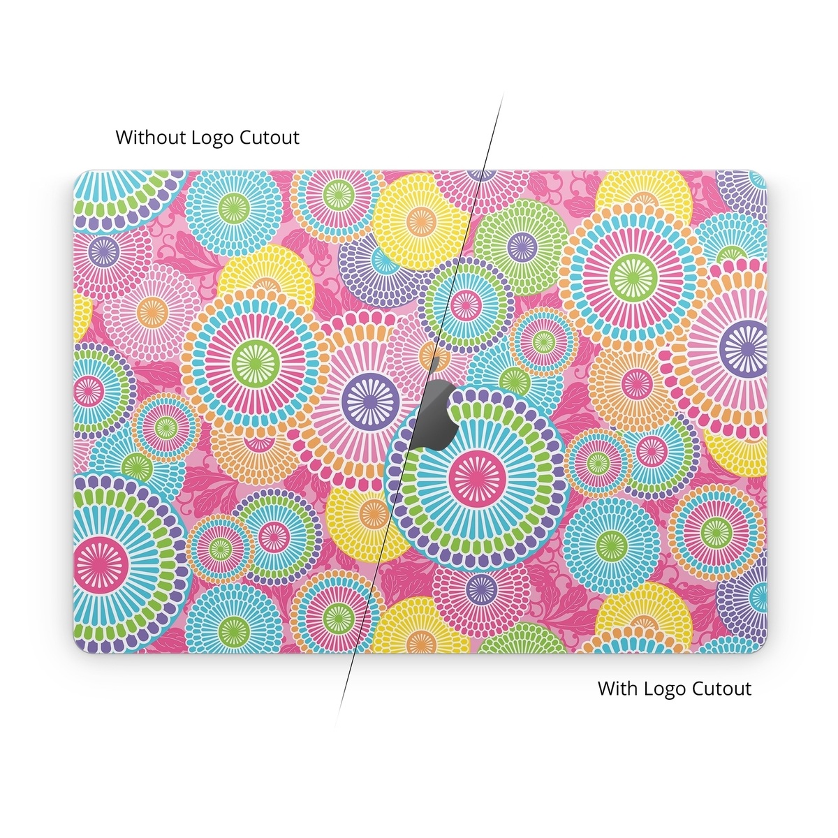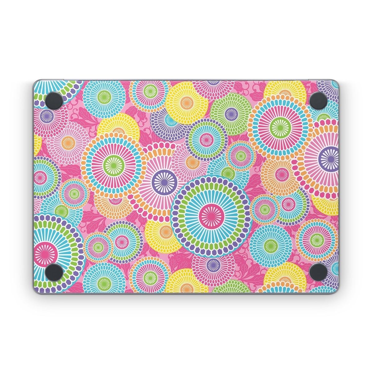 iStyles Apple MacBook Skin design of Pattern, Circle, Textile, Design, Visual arts, Wrapping paper, with gray, pink, purple, orange, blue, green colors, and tagged with patterns, flowers.