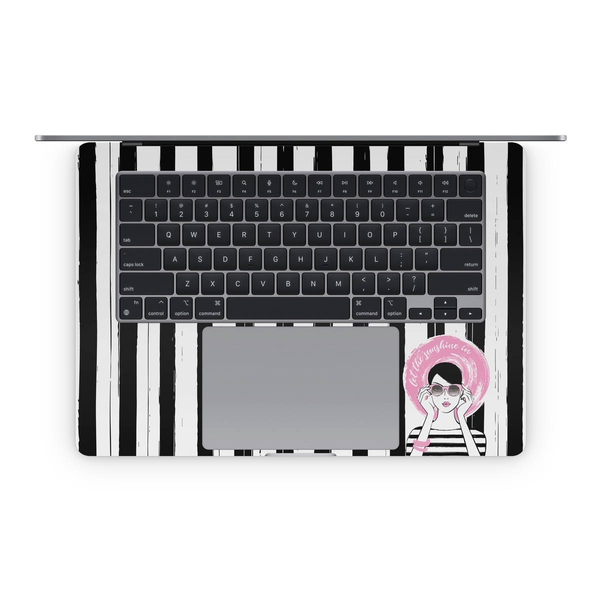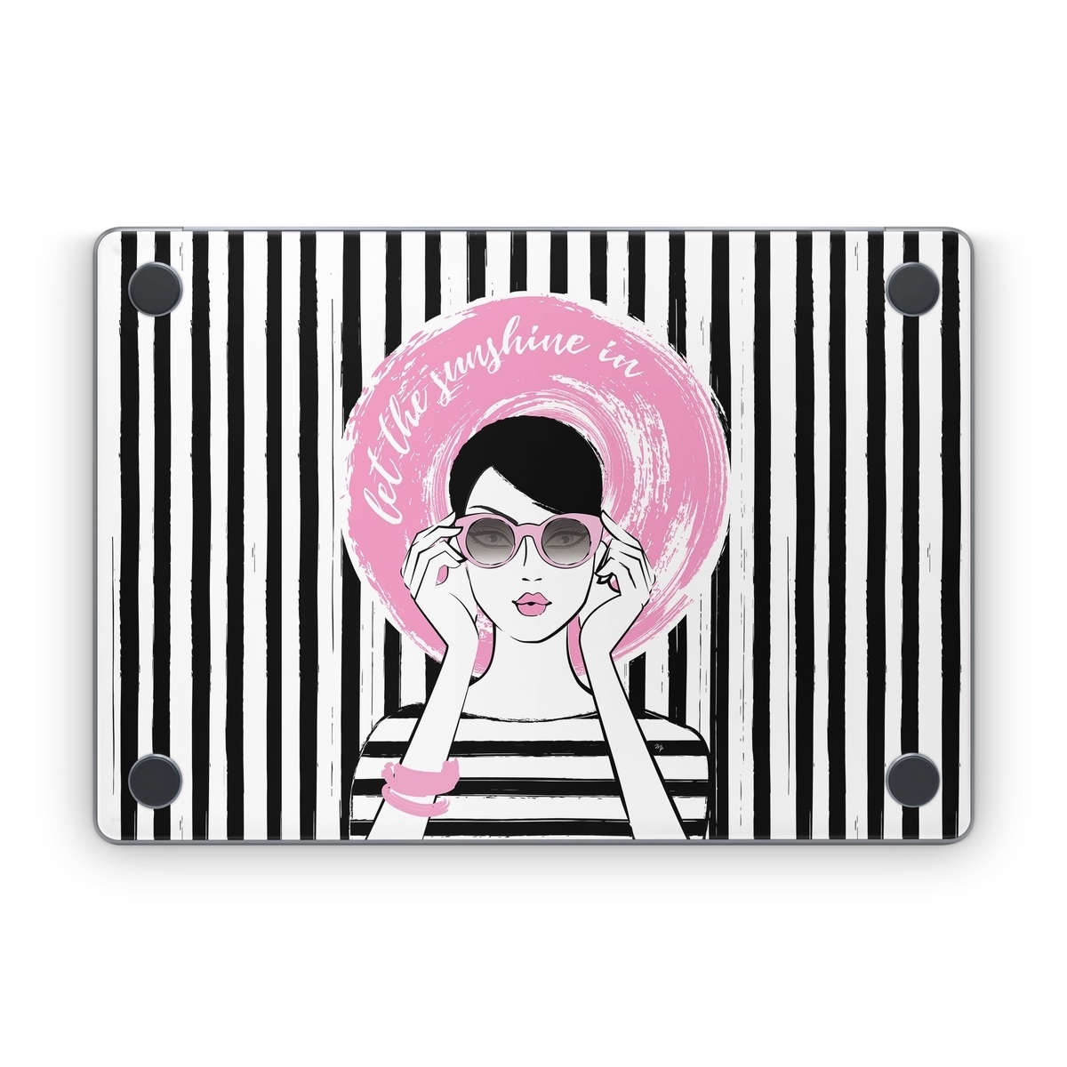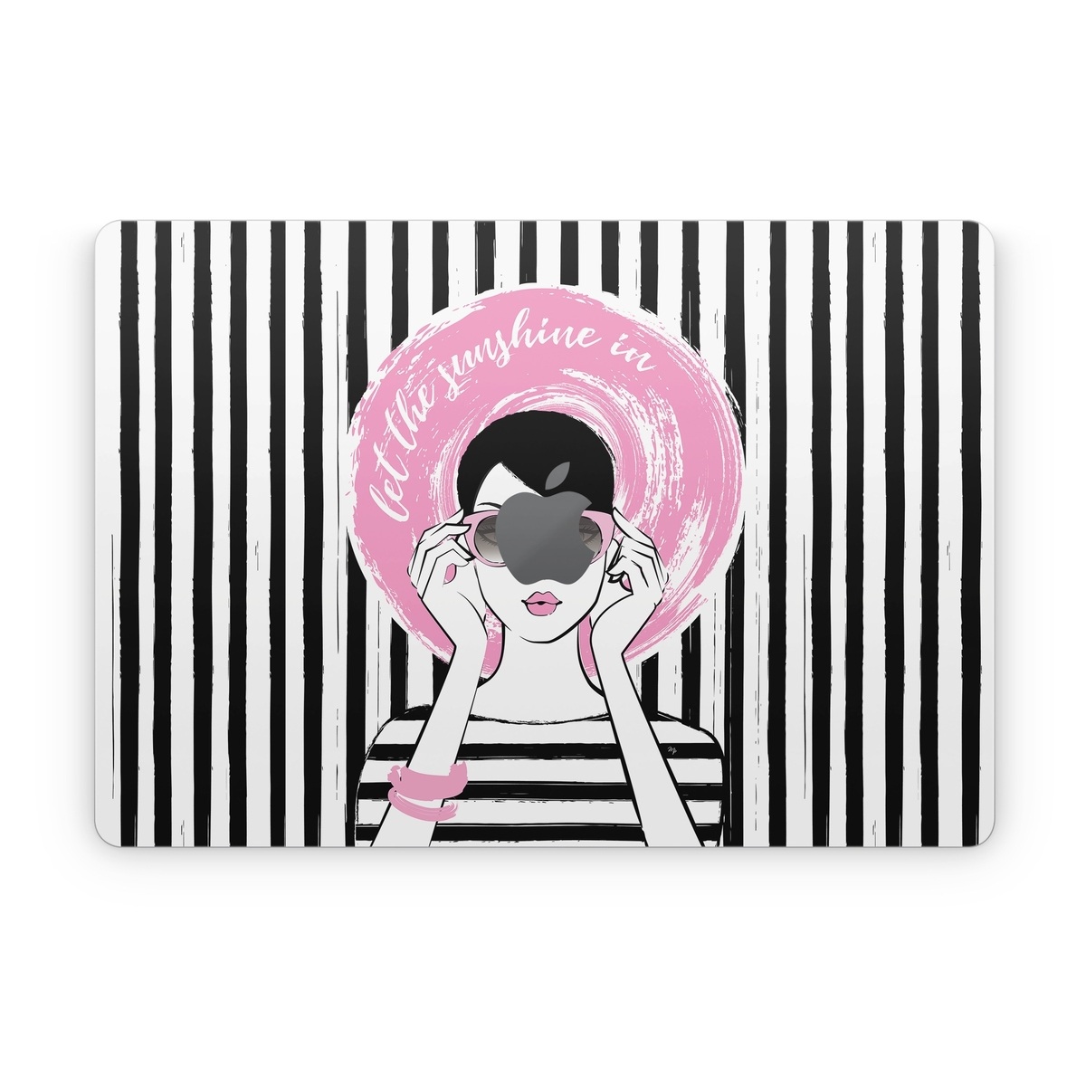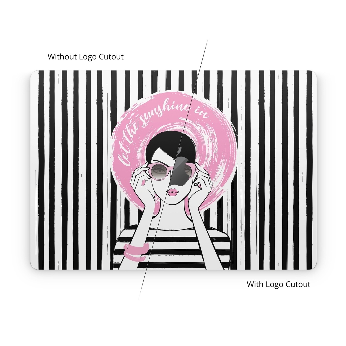 iStyles Apple MacBook Skin design of Organ, Vision care, Purple, Pink, Violet, Font, Eyewear, Magenta, Line, Art, with black, white, pink, gray colors, and tagged with signs, objects, people, patterns, blackandwhite, girl, glasses, hat, pink, stripes.