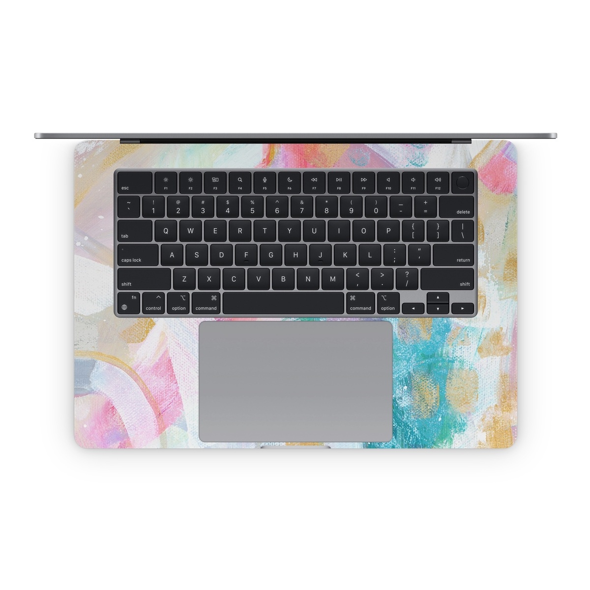 iStyles Apple MacBook Skin design of Colorfulness, Art paint, Paint, Pink, Creative arts, Art, Aqua, Magenta, Tints and shades, Font, with white, blue, pink, purple, green, yellow colors, and tagged with abstract, absrtact, brush, brushstrokes, gold, paint, painting, pastel, splatter, stamps.