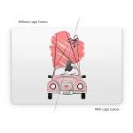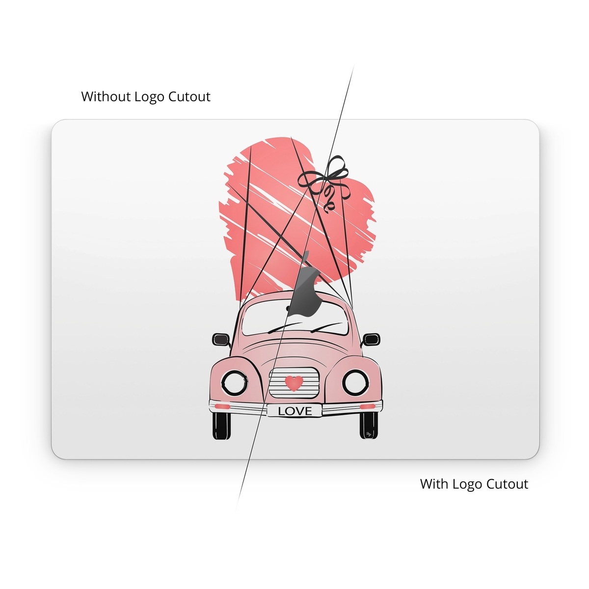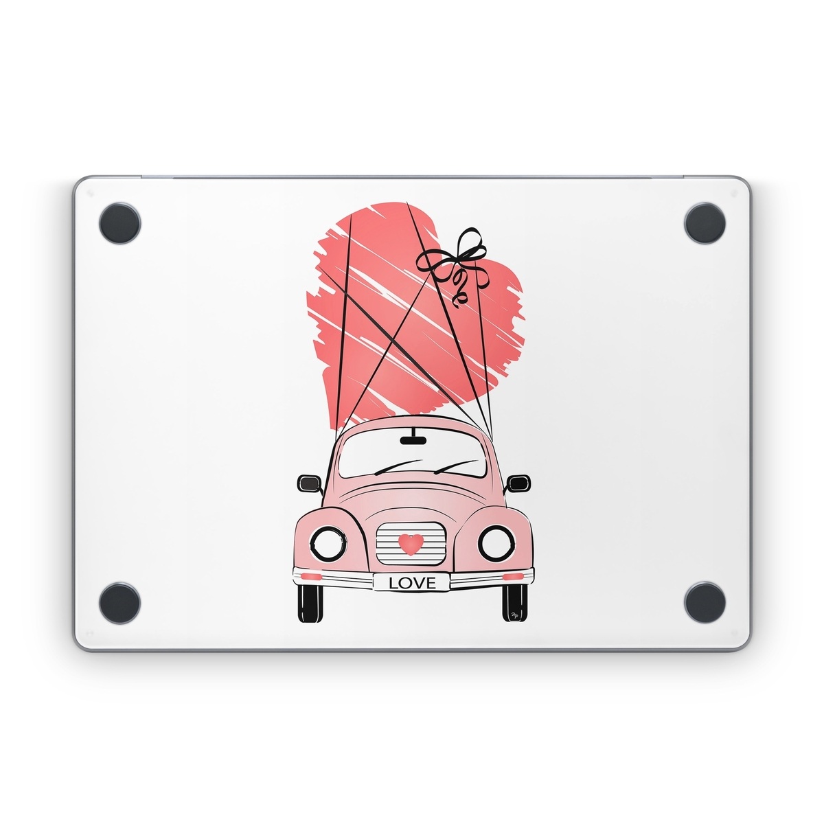 iStyles Apple MacBook Skin design of Land vehicle, Wheel, Vehicle, Tire, Hood, Automotive lighting, Car, Motor vehicle, Kit car, Cartoon, with white, pink, black, red colors, and tagged with hearts, objects, car, carrying, travel, big, heart, present, love, valentine.