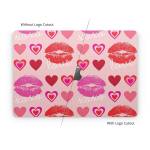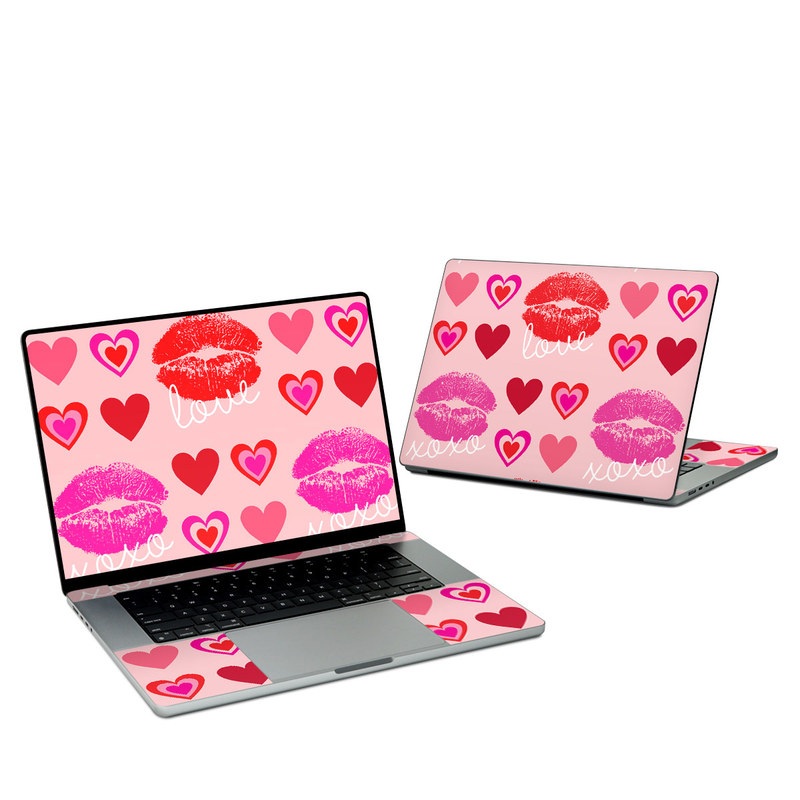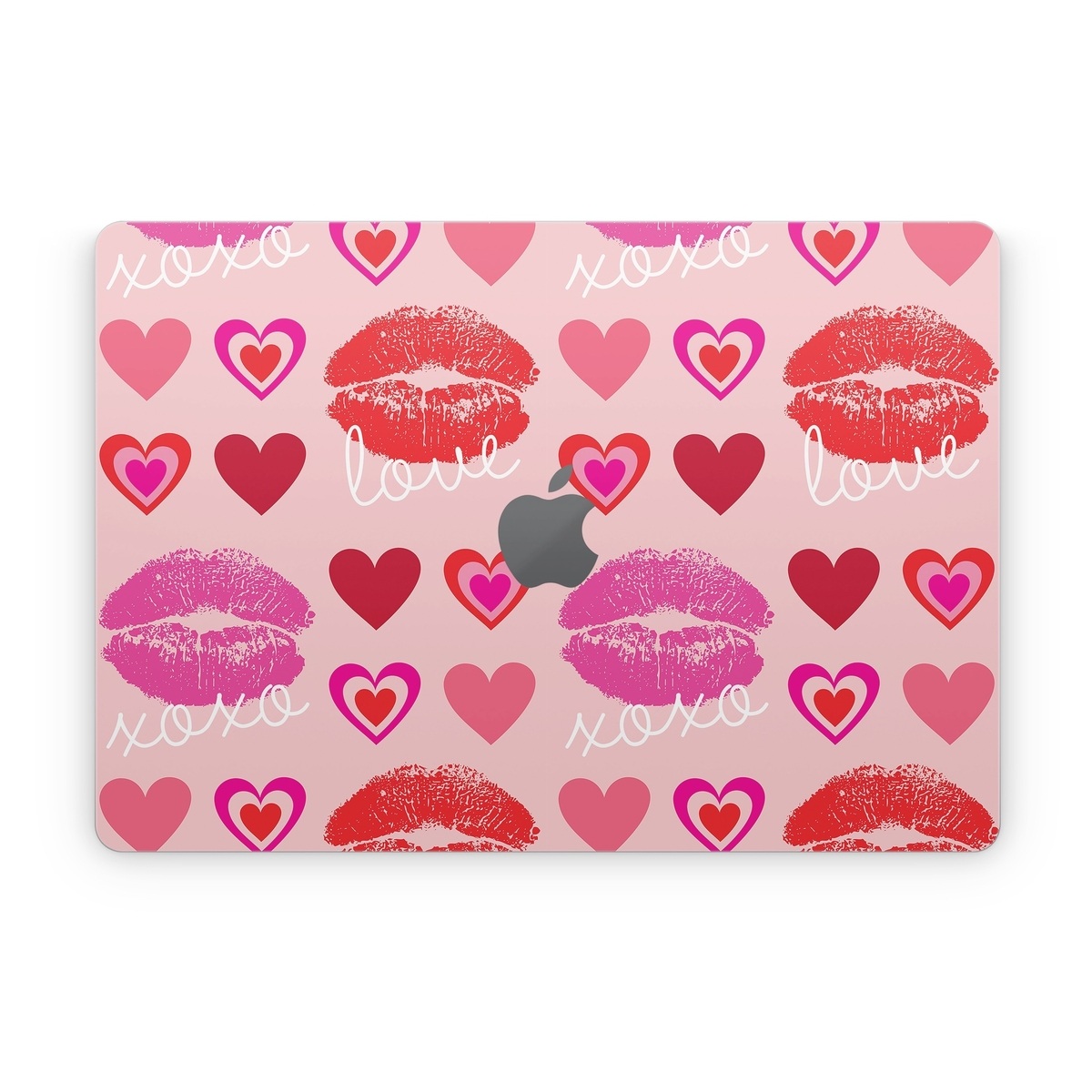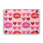 iStyles Apple MacBook Skin design of Organ, Pink, Red, Font, Material property, Magenta, Heart, Pattern, Happy, Love, with pink, red, white colors, and tagged with patterns, hearts, signs, lips, lipstick, xoxo, love.