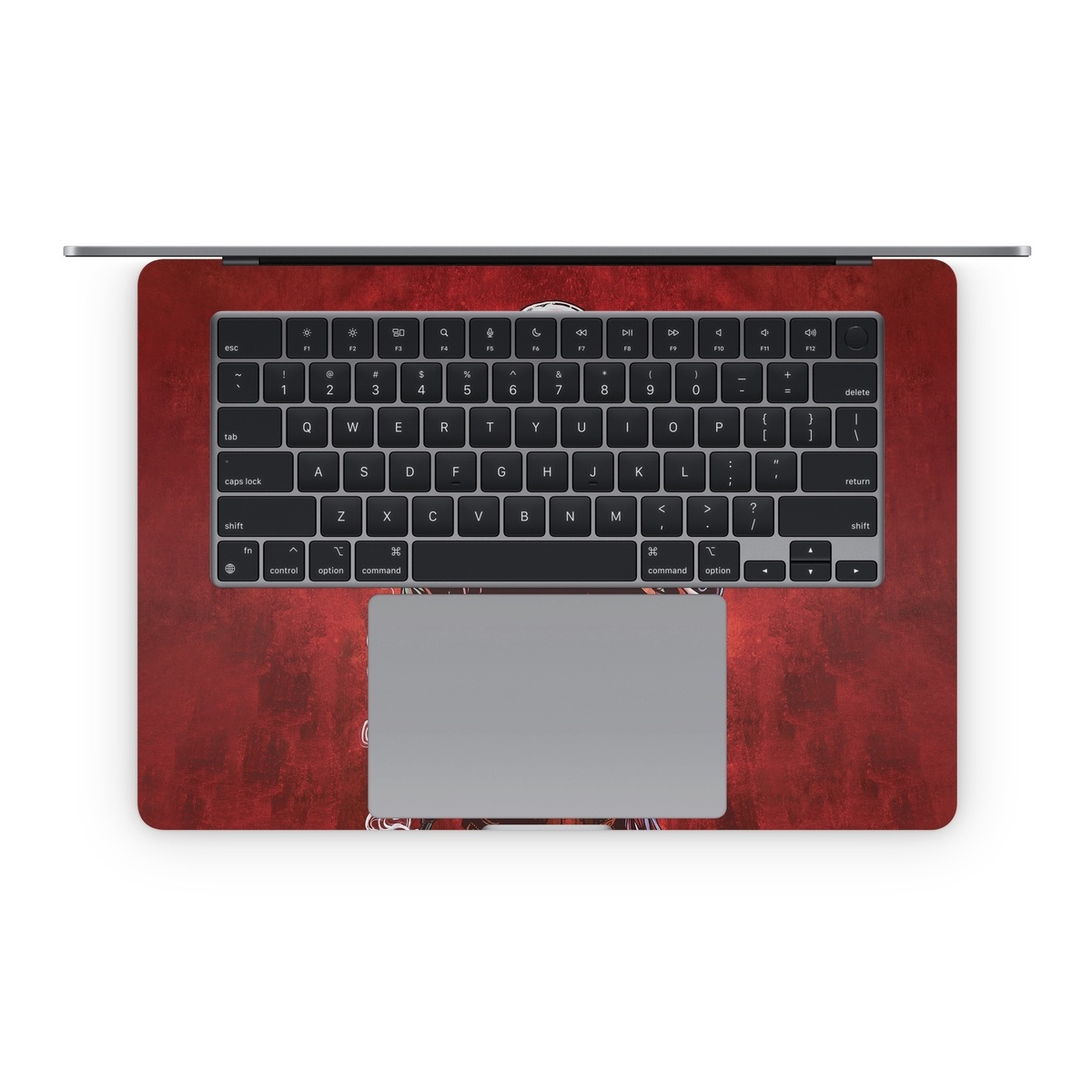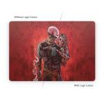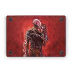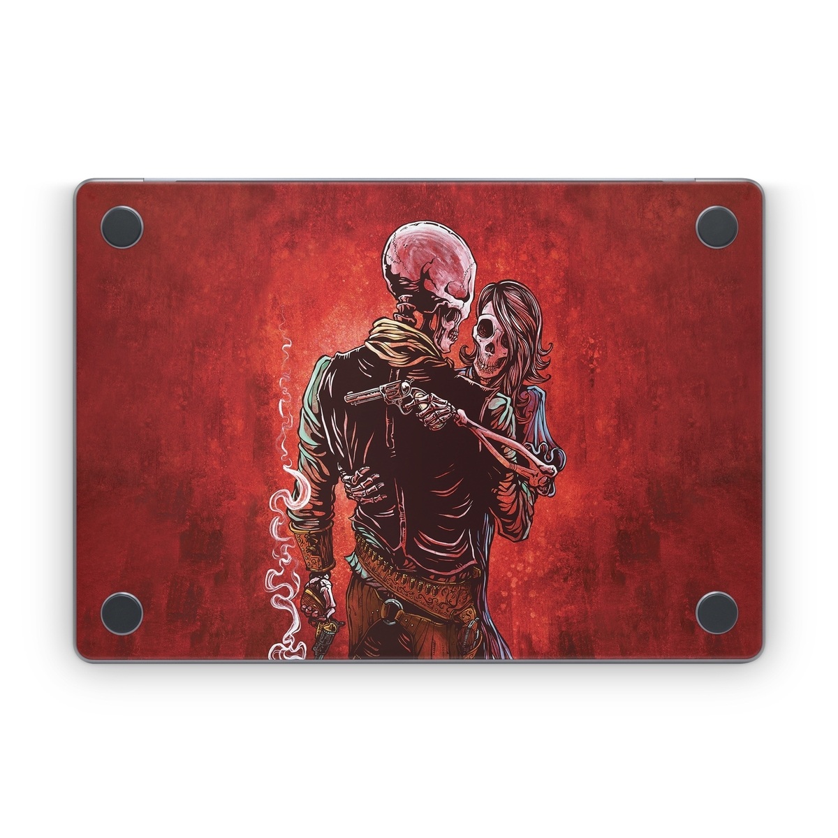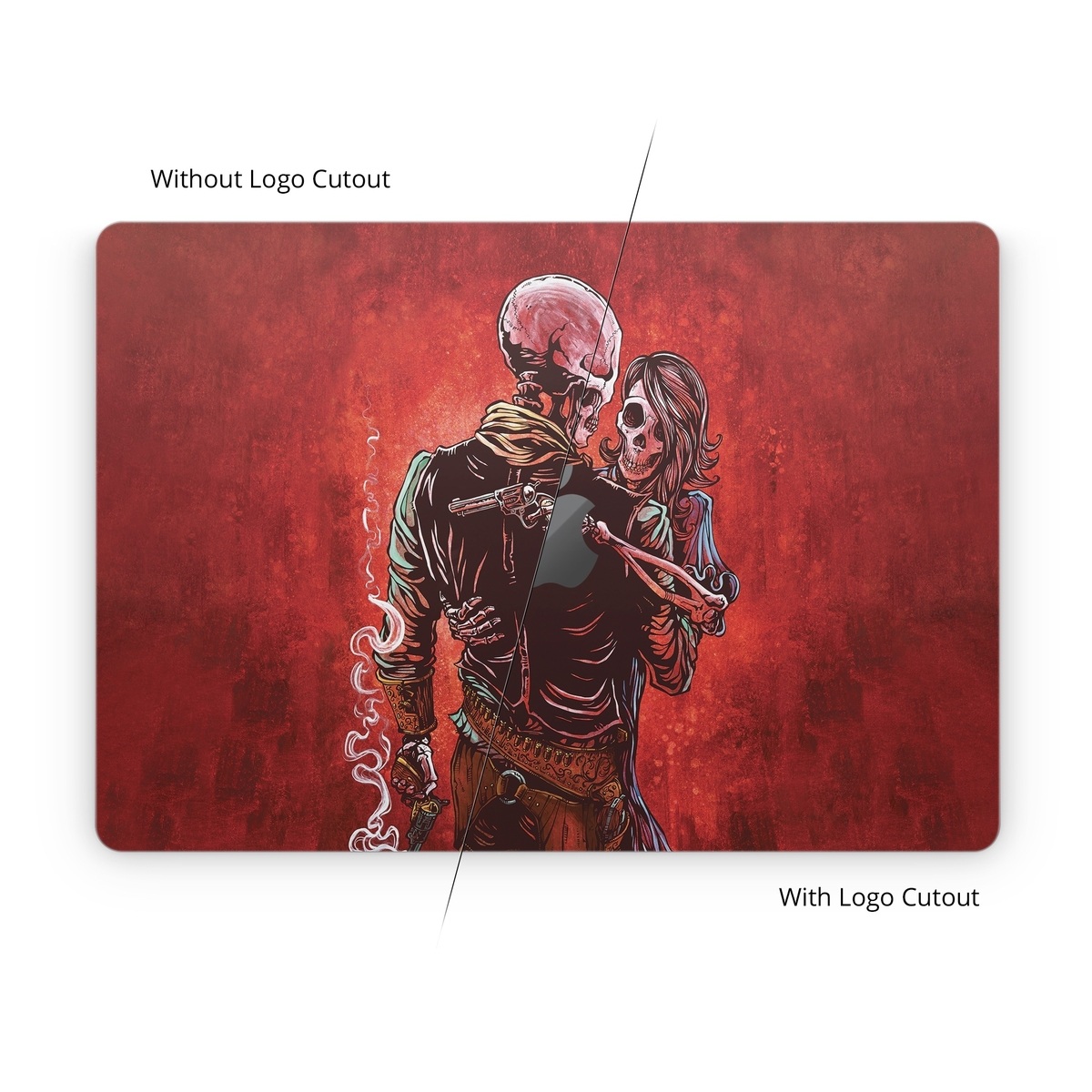 iStyles Apple MacBook Skin design of Sleeve, Gesture, Painting, Art, Artist, Fictional character, Drawing, Paint, Illustration, Visual arts, with red, black, white, gray, brown colors, and tagged with skulls, objects, honesty, mistrust, faith, smoking, gun, couple.