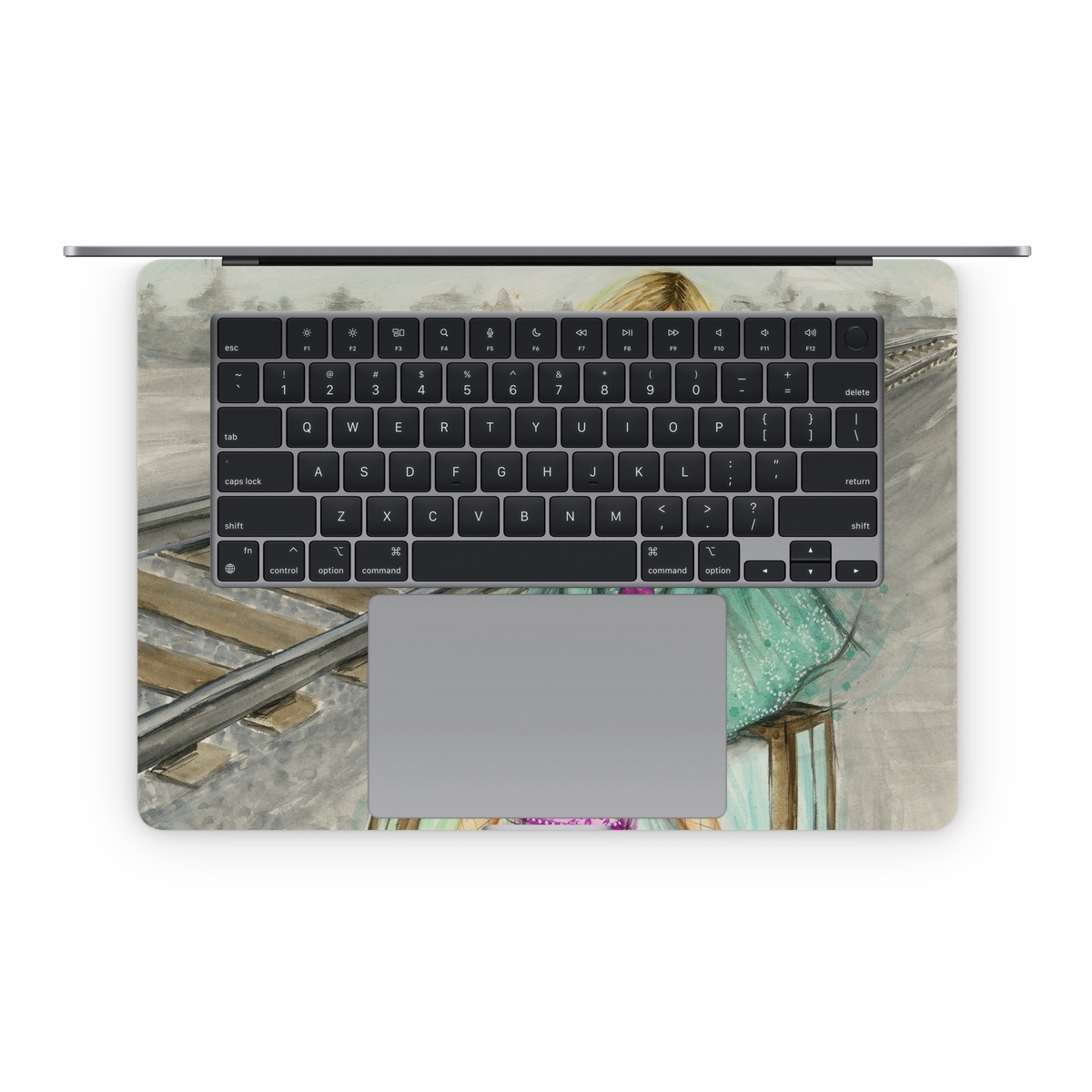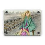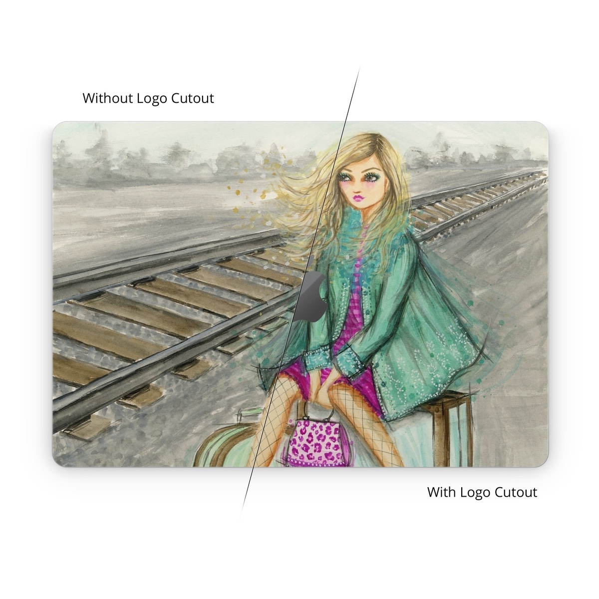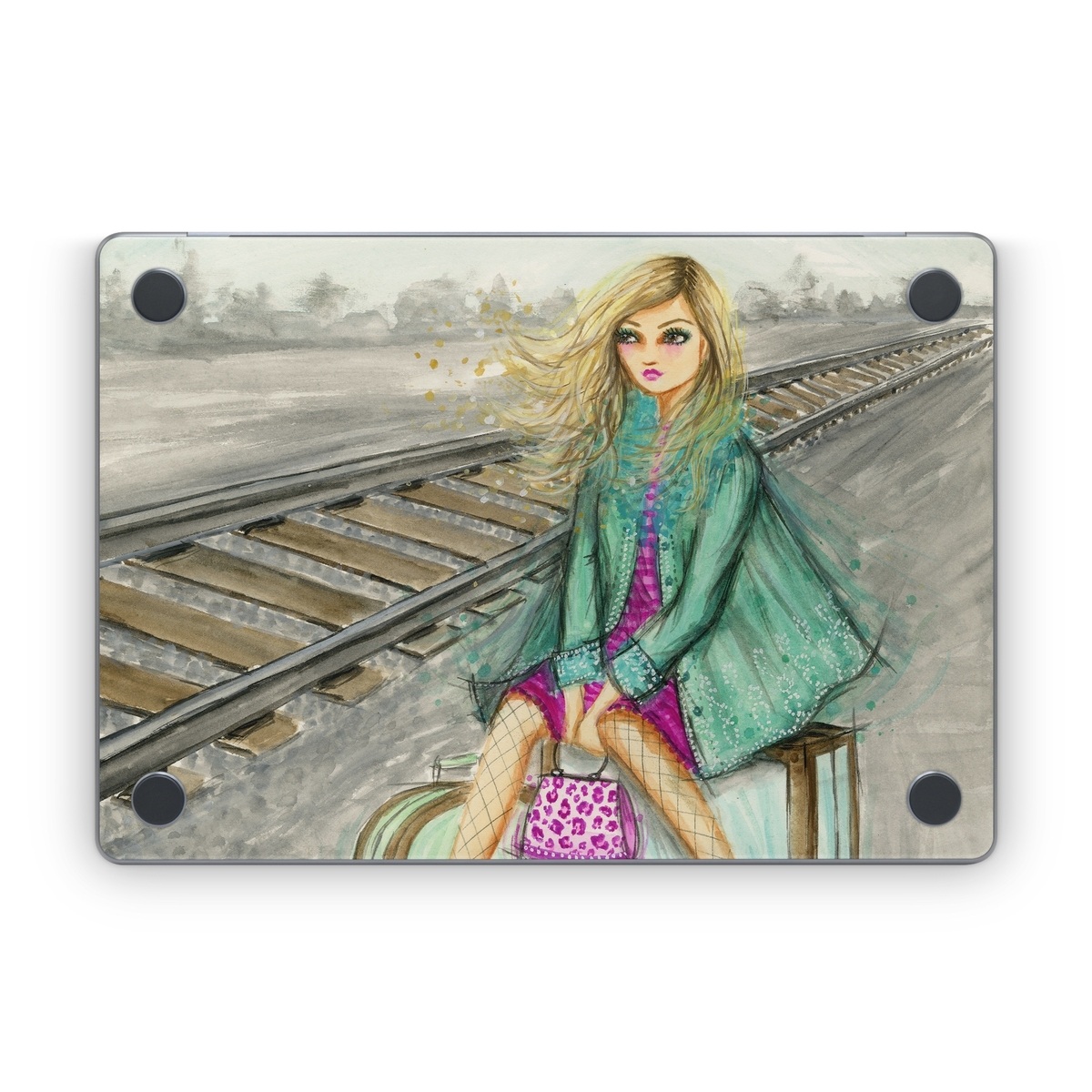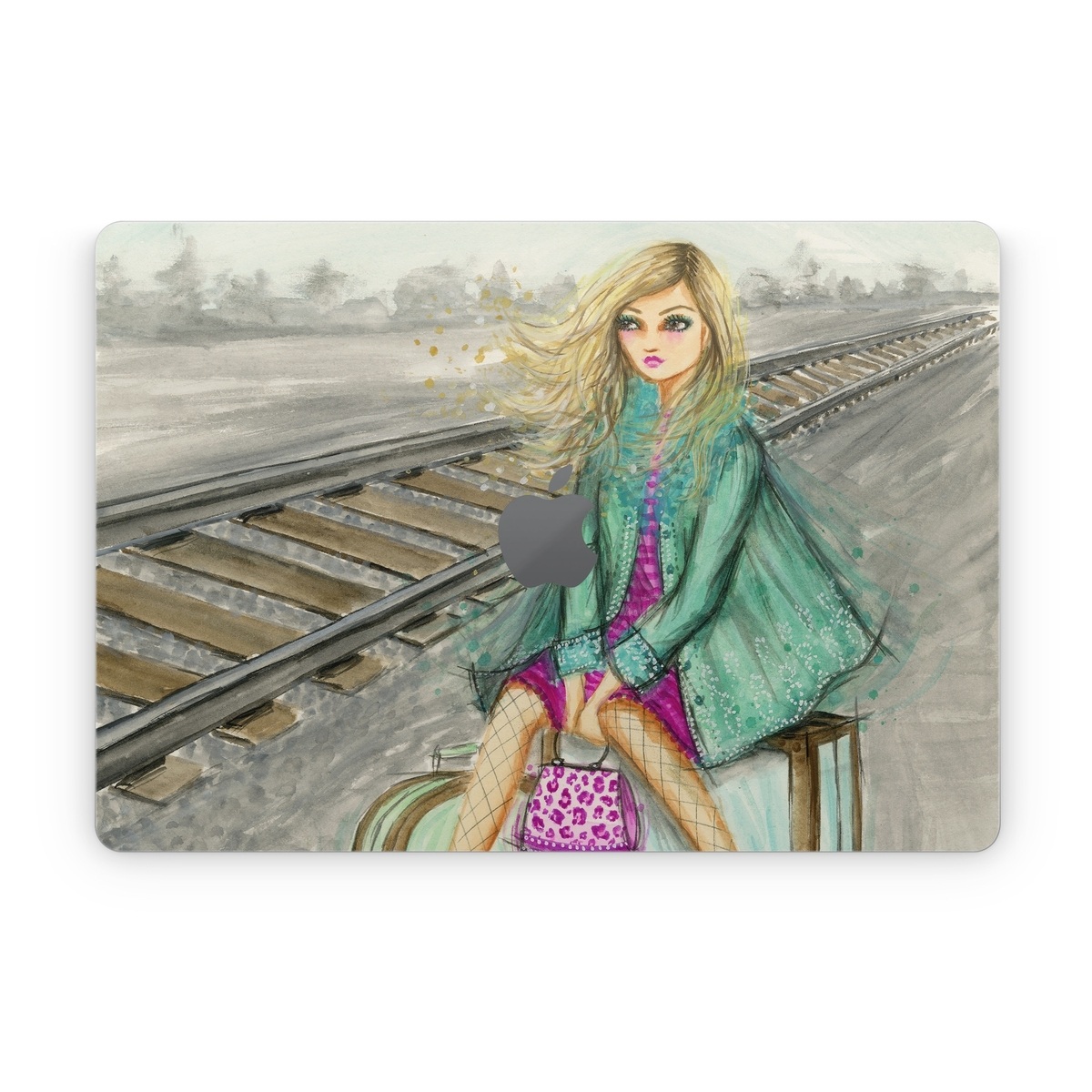 iStyles Apple MacBook Skin design of Fashion illustration, Pink, Illustration, Fashion, Watercolor paint, Art, Magenta, Fashion design, Sitting, Drawing, with gray, green, pink, white, yellow, purple, blue colors, and tagged with people, fineart, objects, urban, drawn, fashion, girl, handdrawn, travel, woman, rails, bag, luggage.