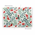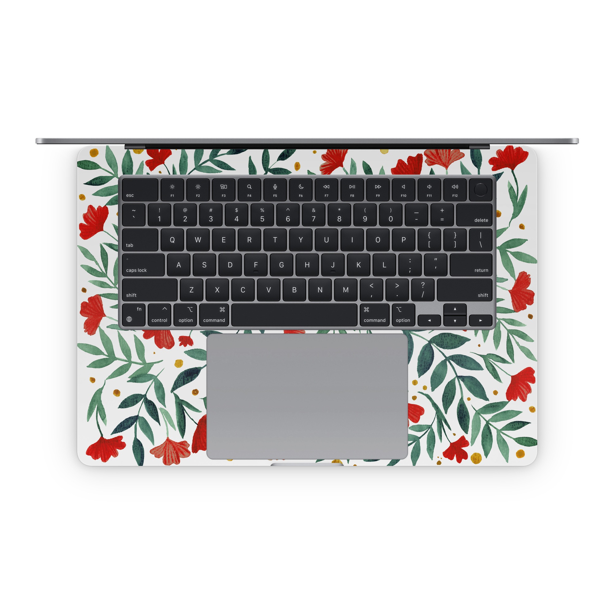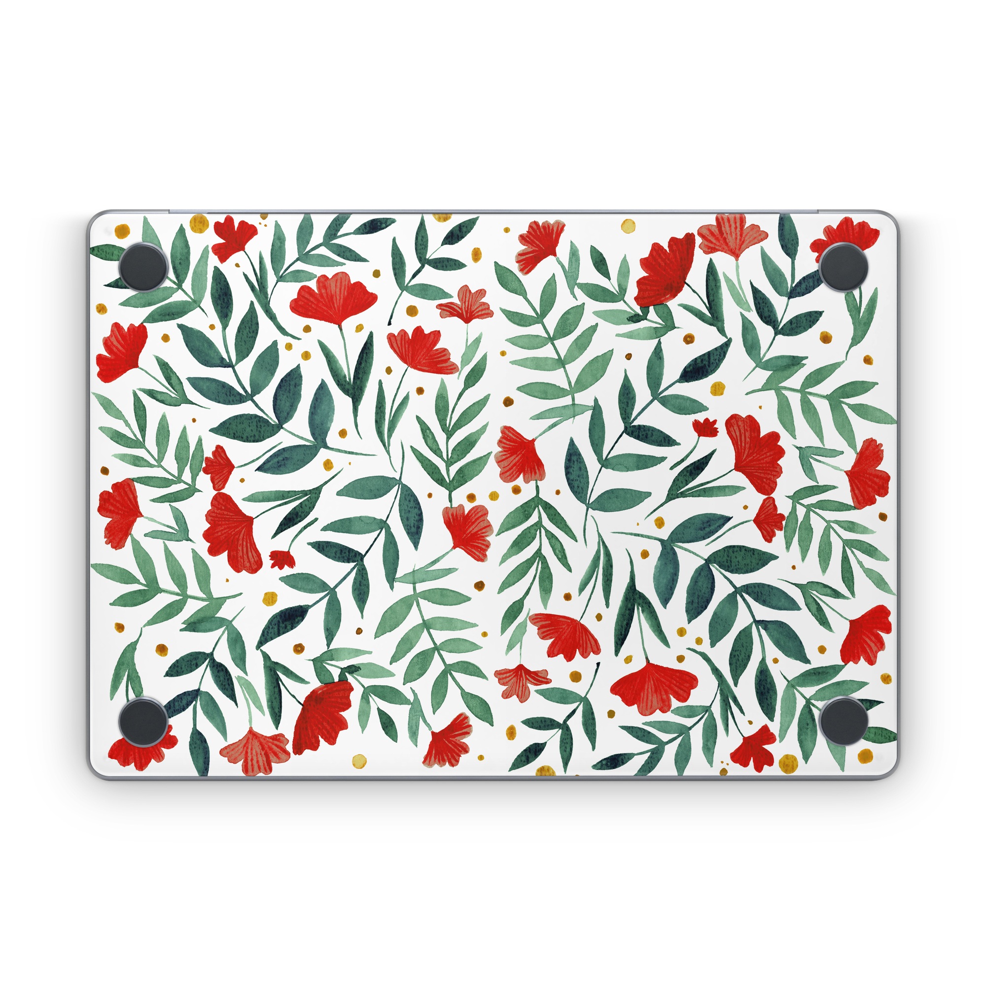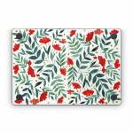 iStyles Apple MacBook Skin design of Flower, Plant, Textile, Line, Petal, Pattern, Flowering plant, Pedicel, Creative arts, Rectangle, with red, green, orange, white colors, and tagged with flowers, patterns, nature, flowers, leaves.