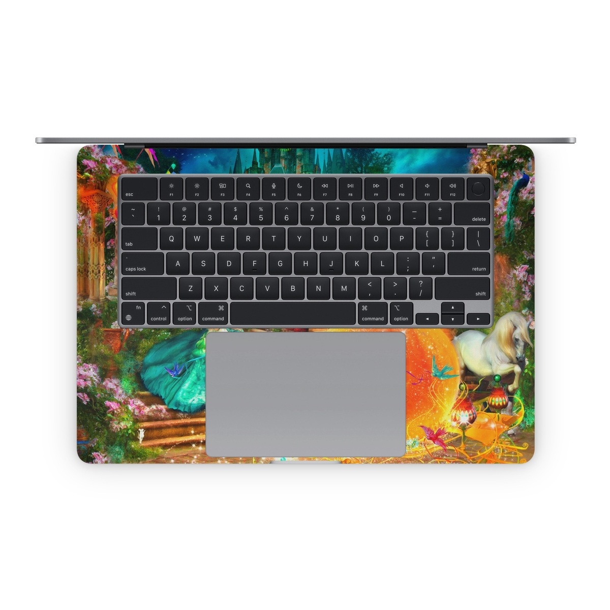 iStyles Apple MacBook Skin design of Mythology, Adventure game, World, Fictional character, Theatrical scenery, Art, with yellow, orange, blue, green, red, purple, white, black colors, and tagged with fantasy, animals, objects, urban.