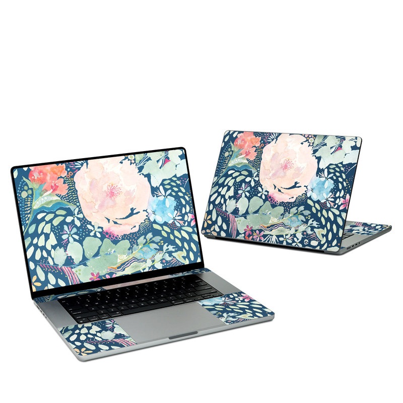 iStyles Apple MacBook Skin design of Flower, Plant, Petal, Botany, Textile, Sleeve, Creative arts, Art, Painting, Aqua, with blue, pink, green, white, orange, yellow, red colors, and tagged with patterns, flowers, blue, bouquet, floral, flower, flowers, garden, leaves, paint, painting, pink, sketch, watercolor.